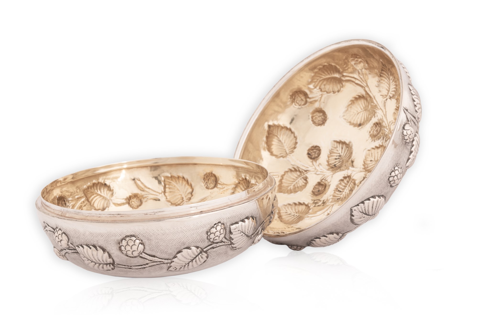 Scatola in argento Buccellati porta bon bon con coperchio cesellato con foglie di fragola