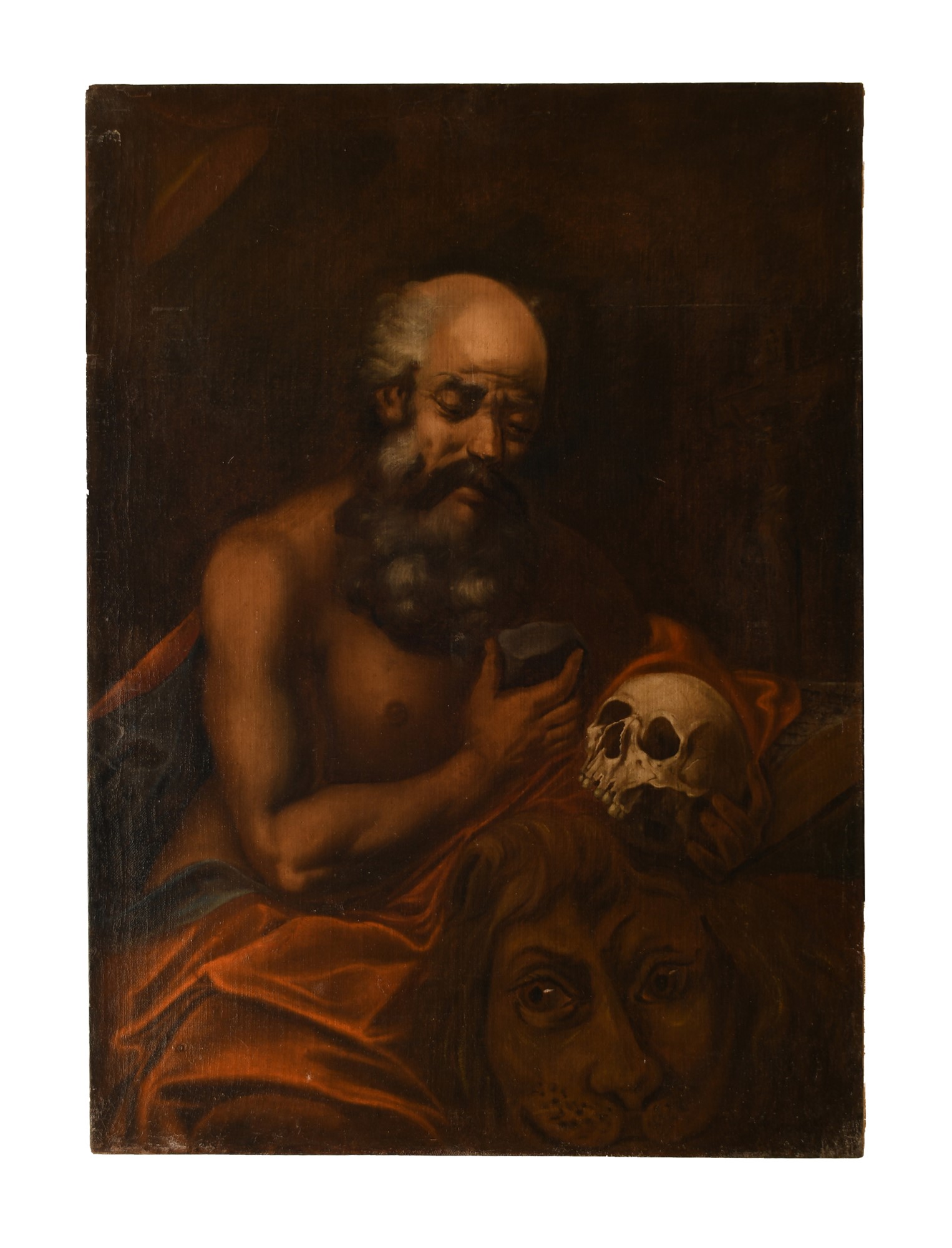 olio su tela cm 103x75 In linea con gli attributi iconografici tradizionali, il santo nel percuotersi il petto con una piera, regge nell'altra un teschio. Sotto di lui la testa di un leone.