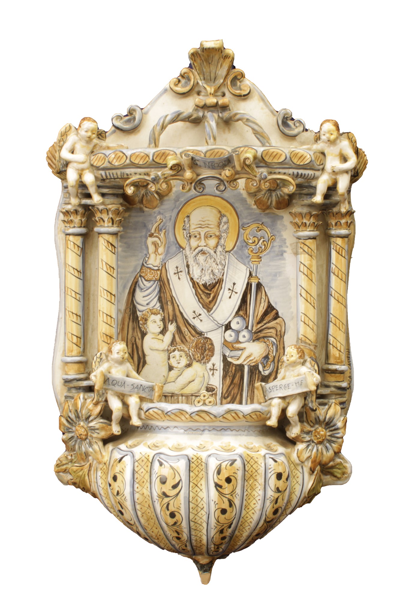 Grande acquasantiera in ceramica raffigurante il miracolo di San Nicola e i tre bambini resuscitati XX secolo