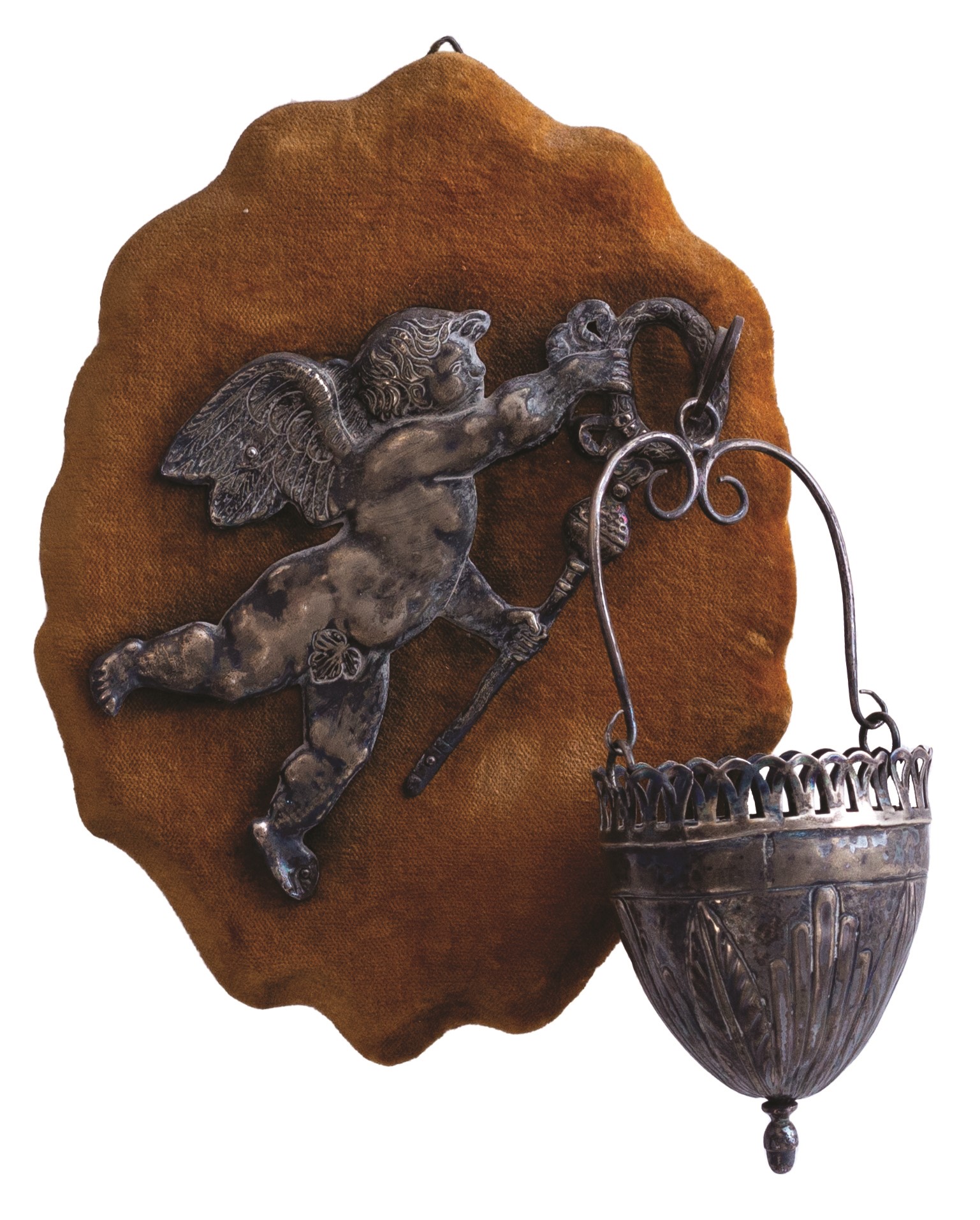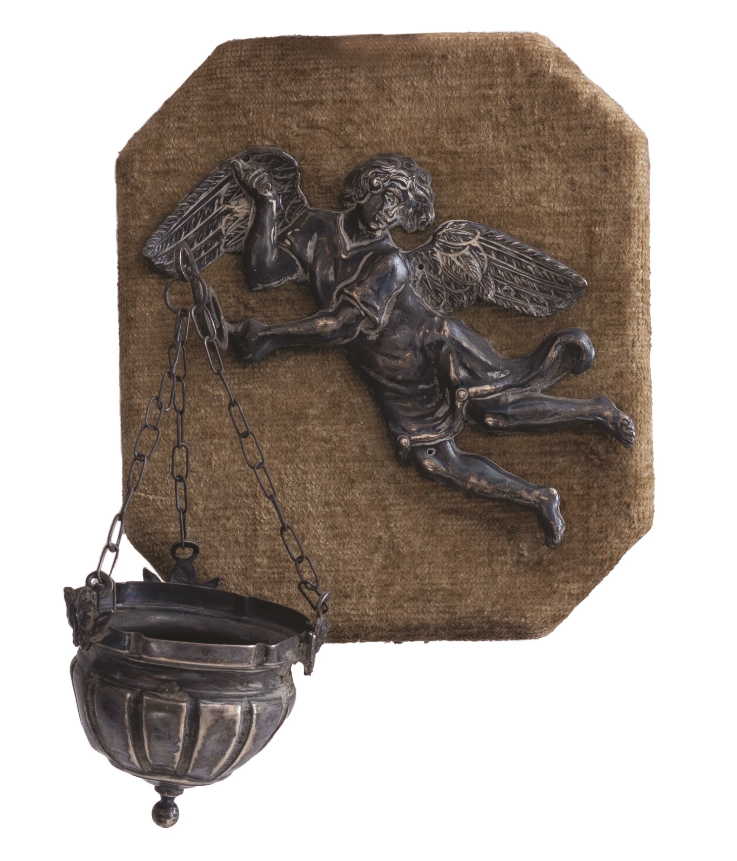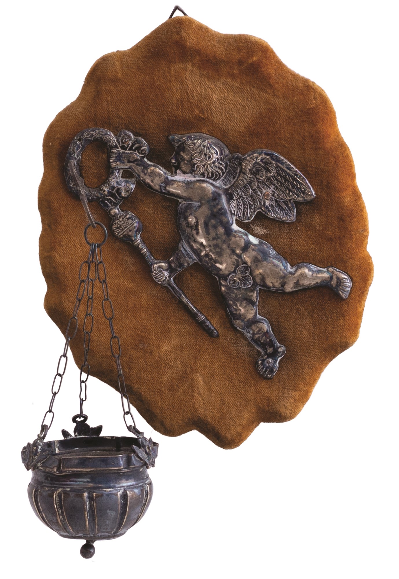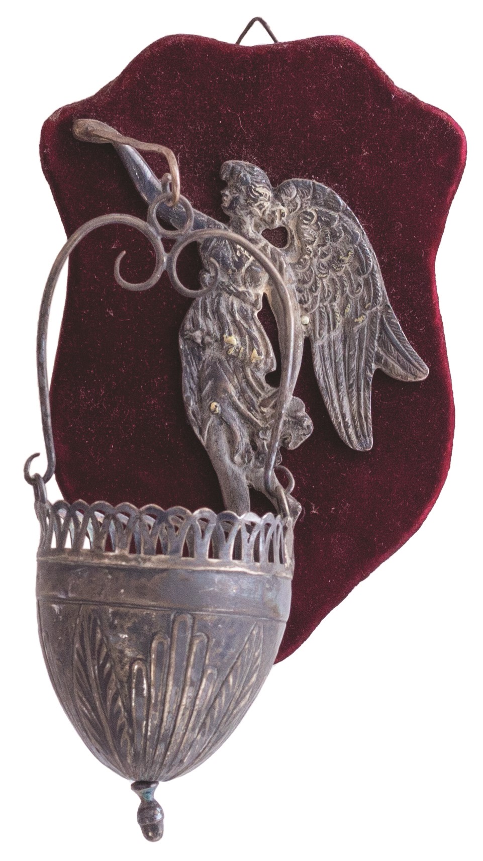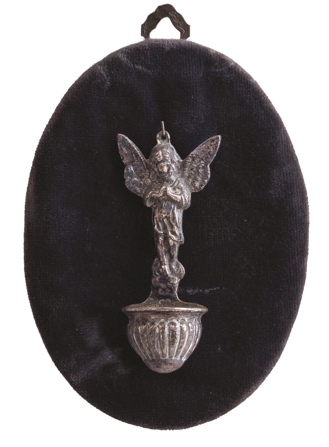 Collezione di piccole composizioni e acquasantiere antiche montate assieme a angeli in argento sbalzato o ex voto (tutti d'epoca,tra il XVIII e il XIX secolo) sempre del medesimo metallo, a loro voltaassicurate su un supporto vellutato dotato di supporto per essere appese.