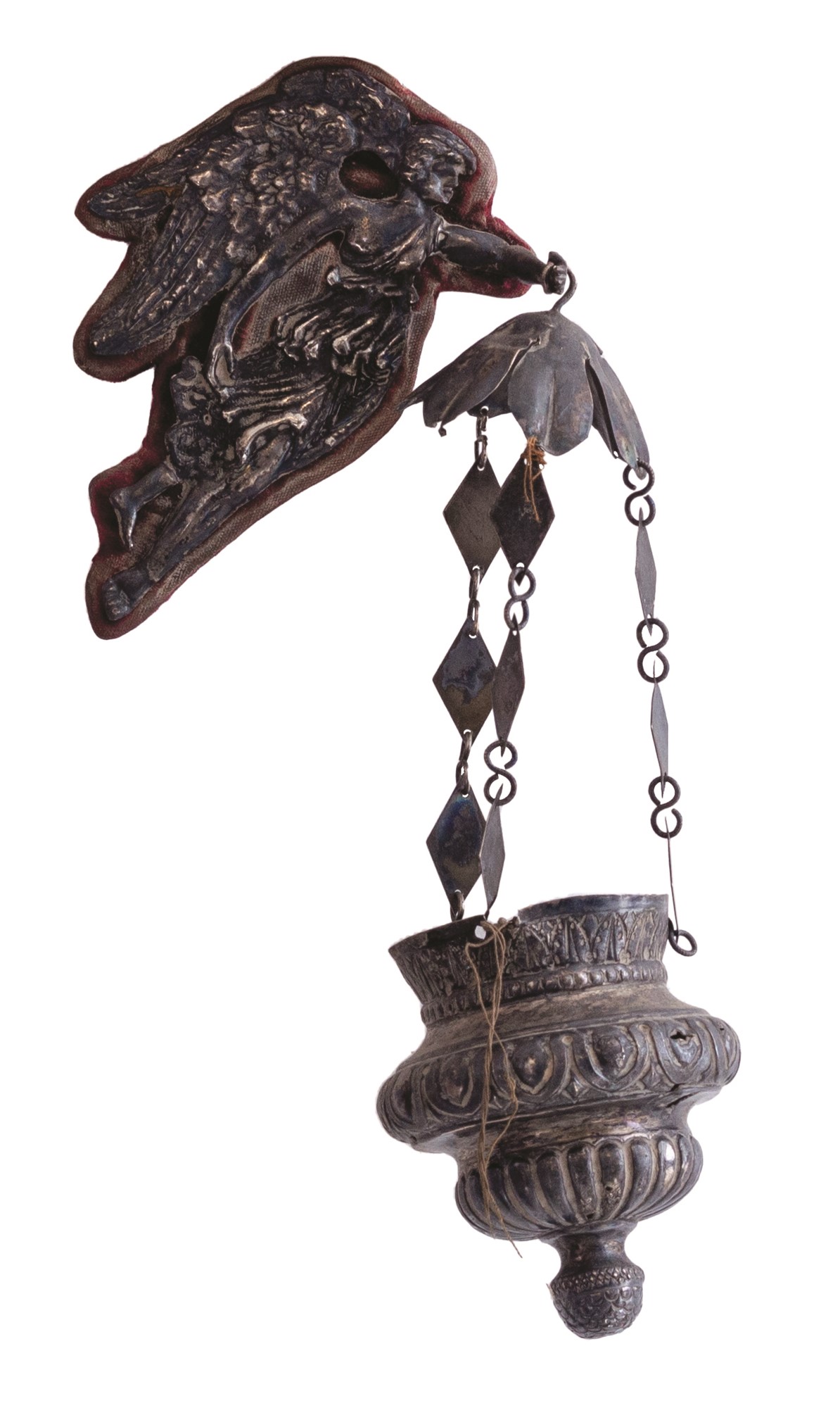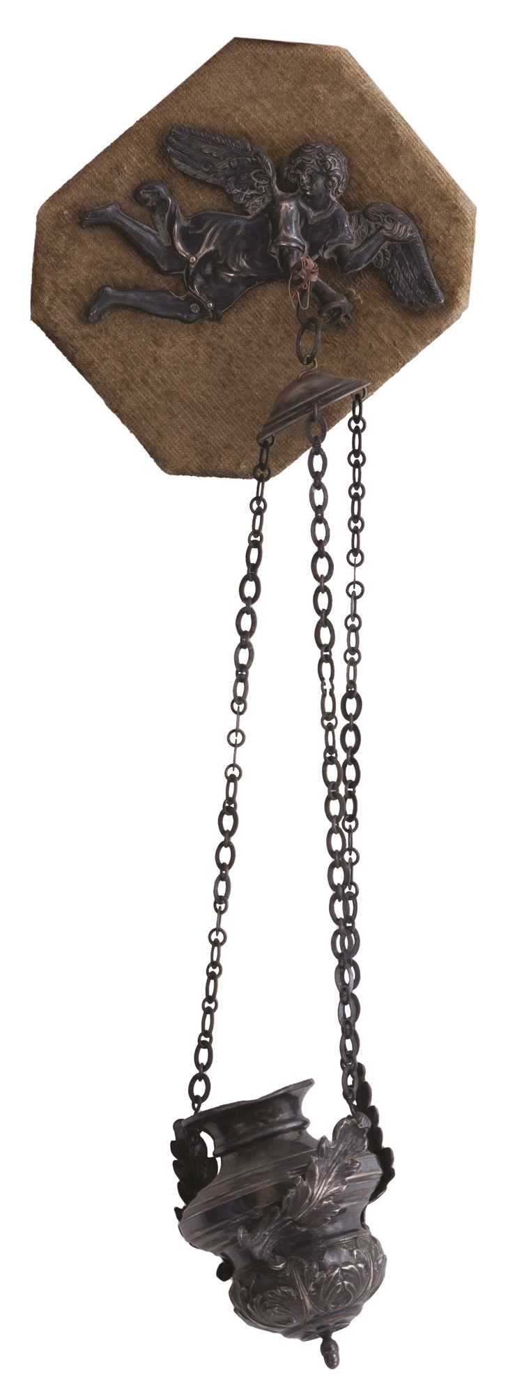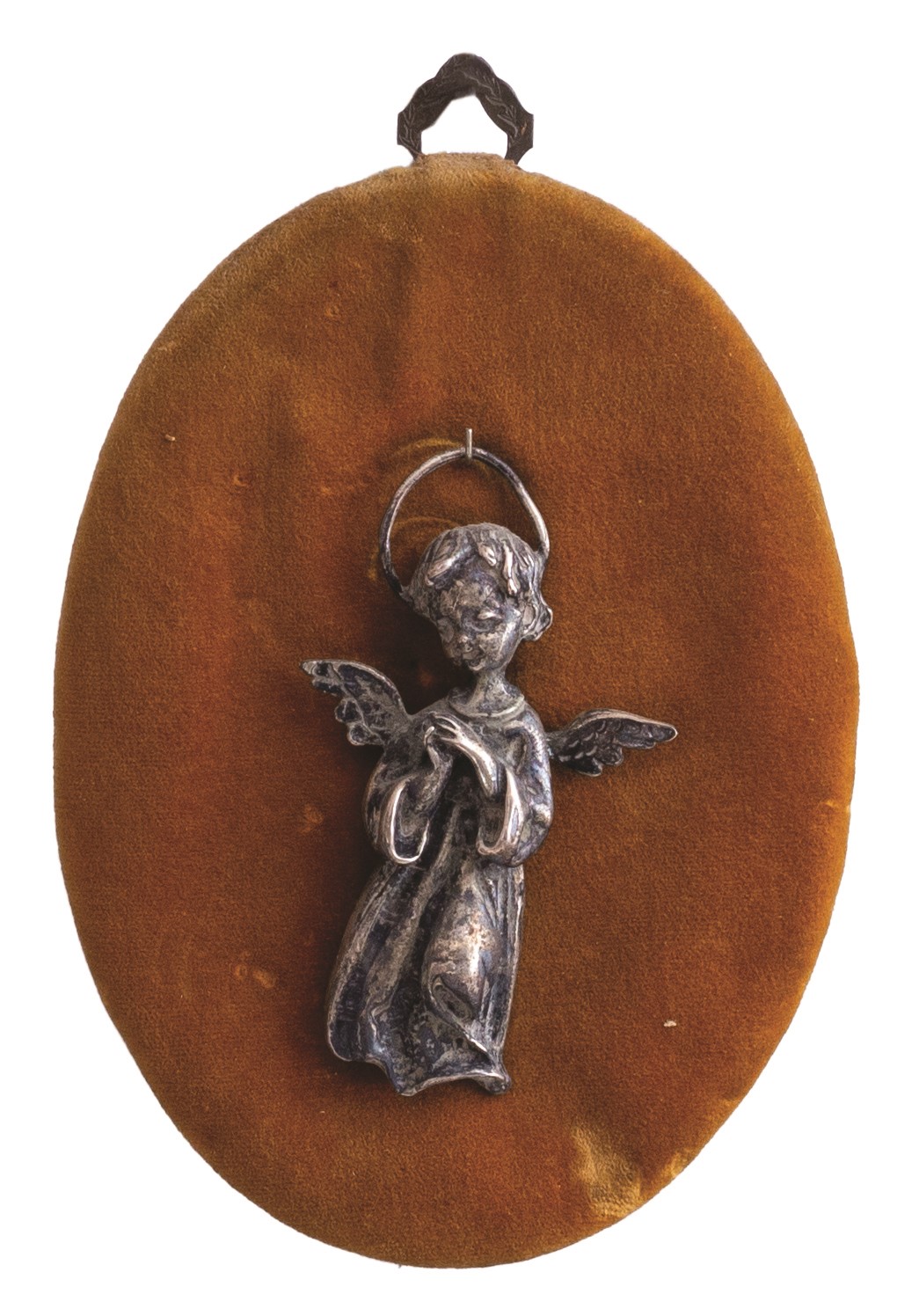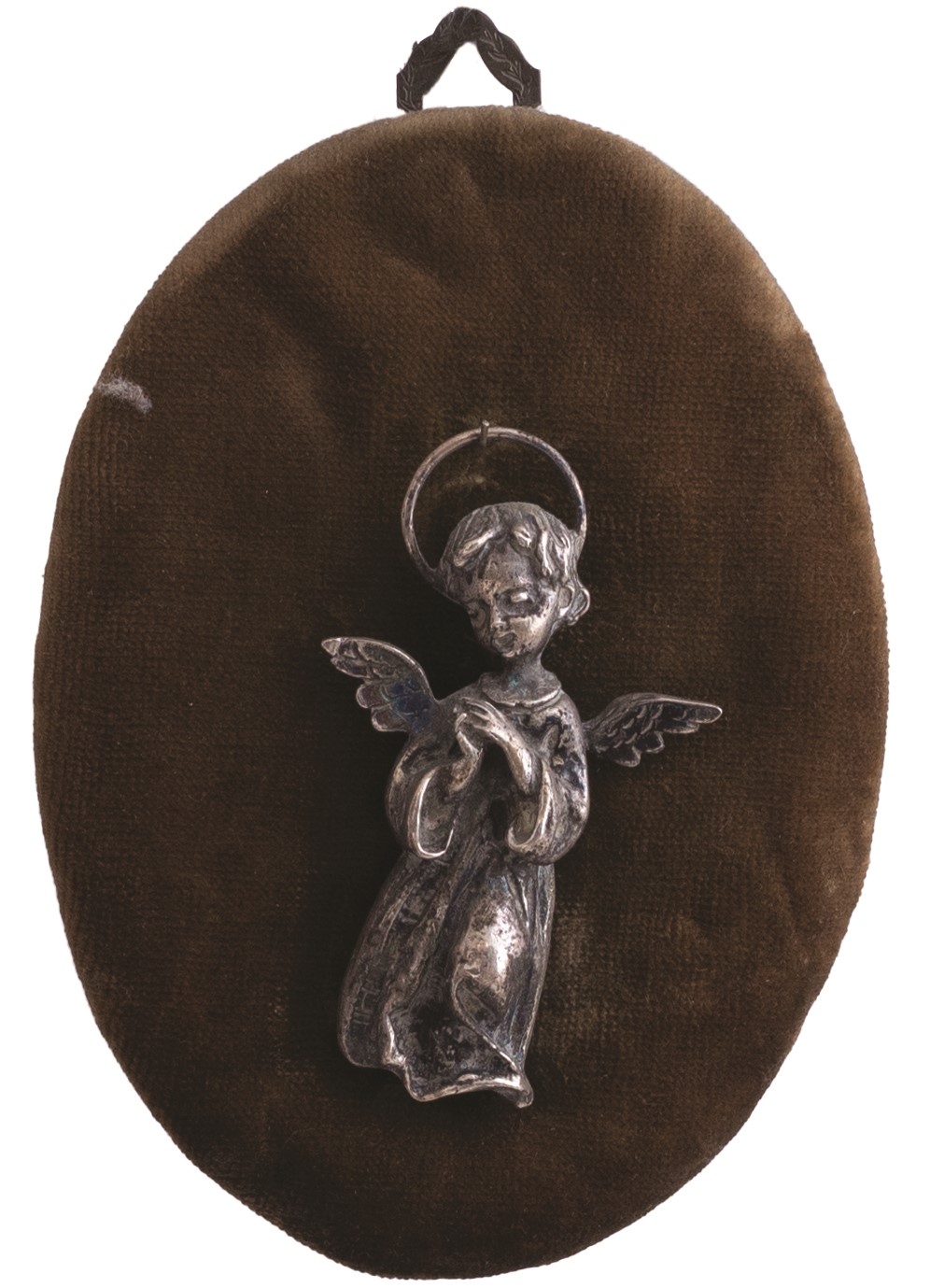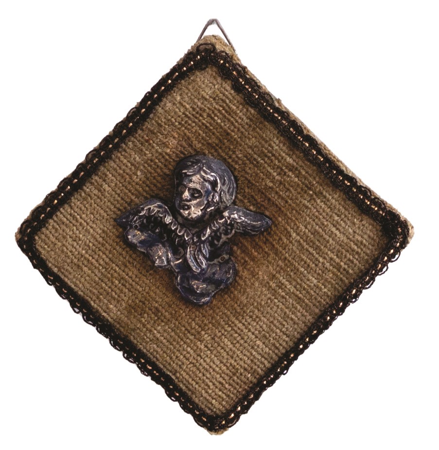 Collezione di piccole composizioni e acquasantiere antiche montate assieme a angeli in argento sbalzato o ex voto (tutti d'epoca,tra il XVIII e il XIX secolo) sempre del medesimo metallo, a loro voltaassicurate su un supporto vellutato dotato di supporto per essere appese.