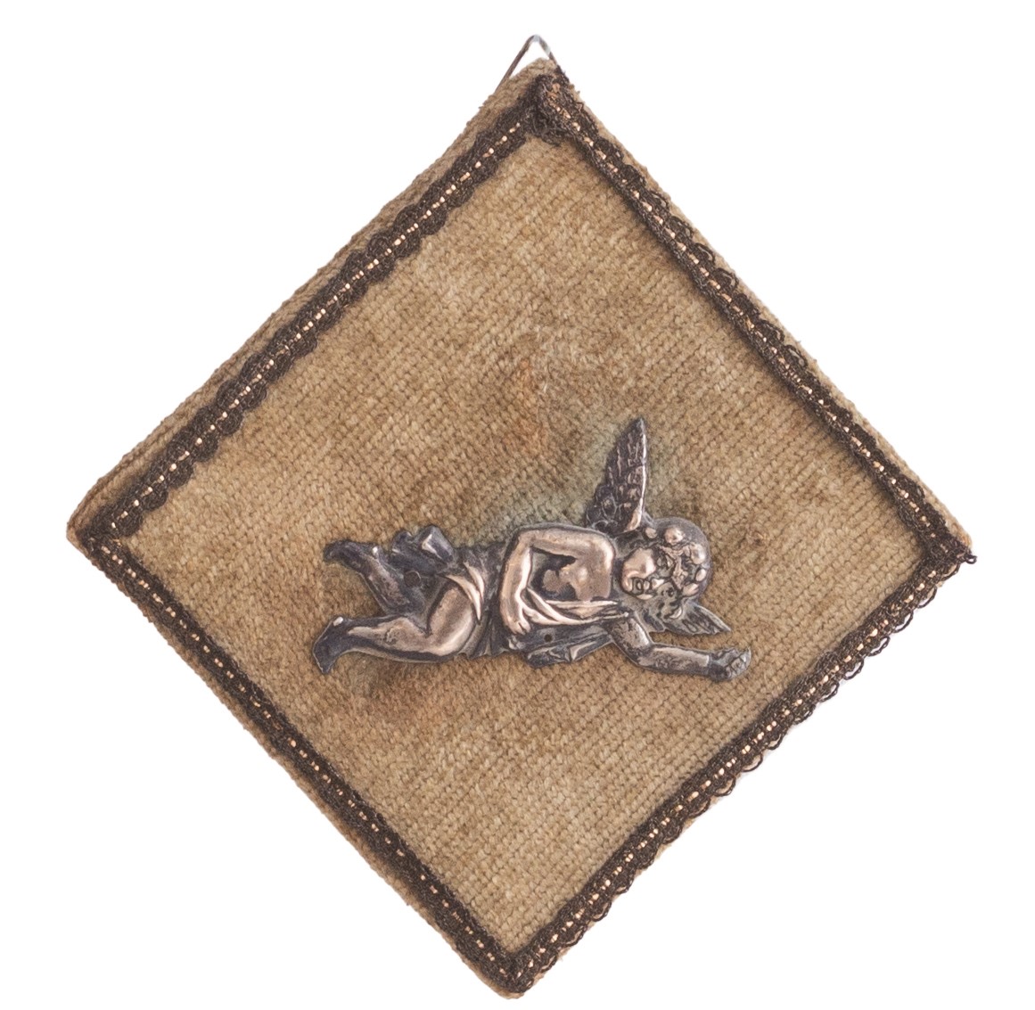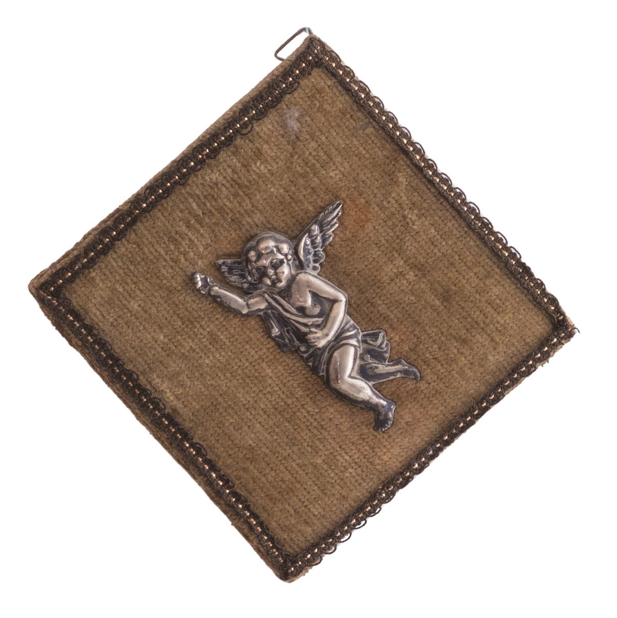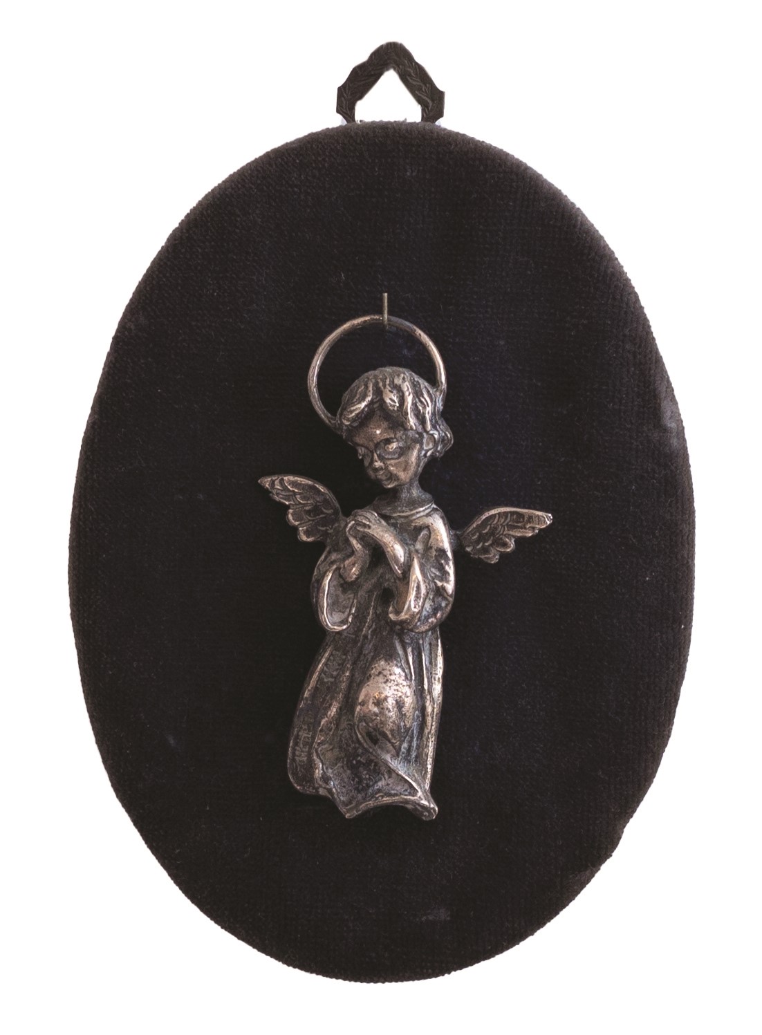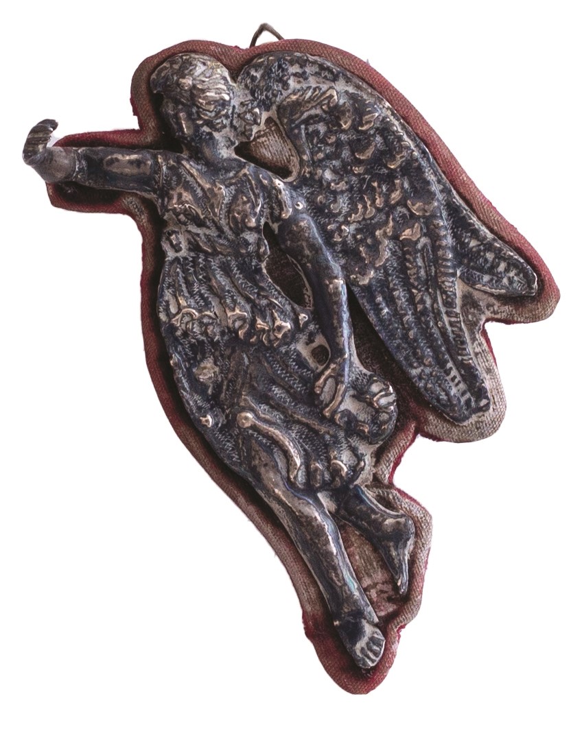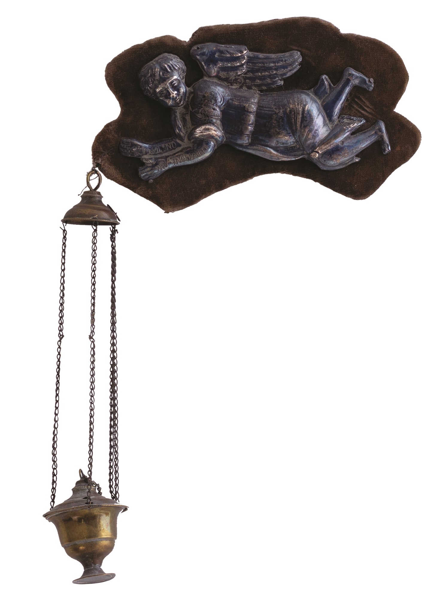 Collezione di piccole composizioni e acquasantiere antiche montate assieme a angeli in argento sbalzato o ex voto (tutti d'epoca,tra il XVIII e il XIX secolo) sempre del medesimo metallo, a loro voltaassicurate su un supporto vellutato dotato di supporto per essere appese.