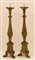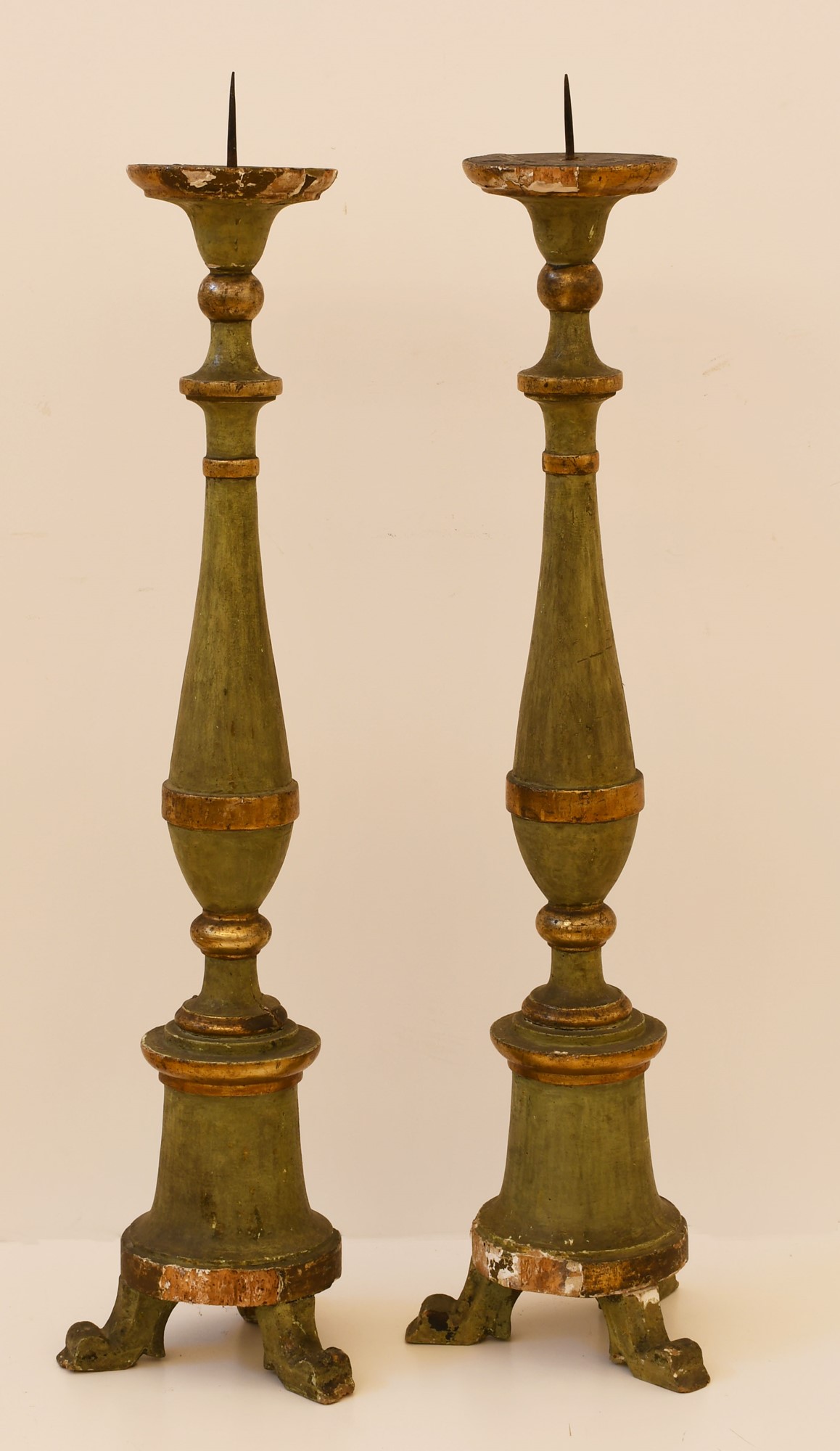 Coppia di torciere in stile neoclassico da altare in legno laccato verde e dorato.