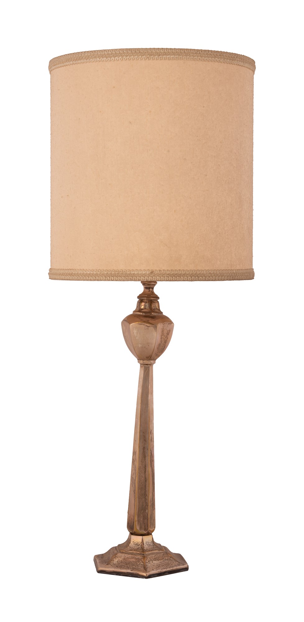 Candeliere in metallo argentato montato a lume altezza cm 35; con ventola cm 62
