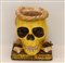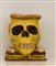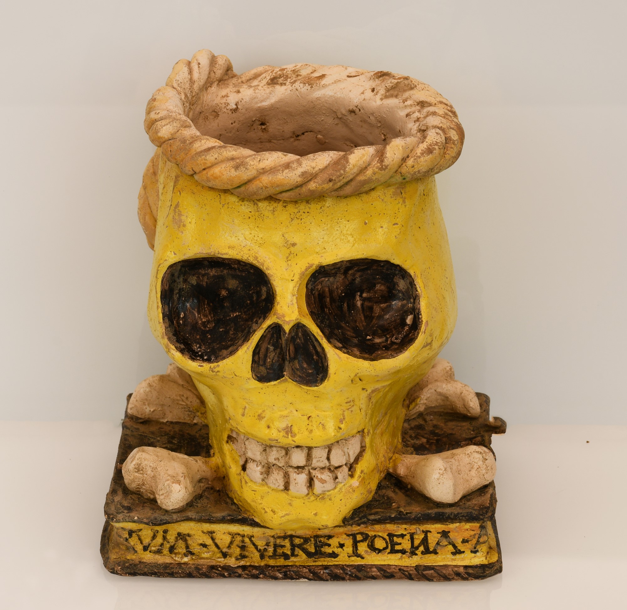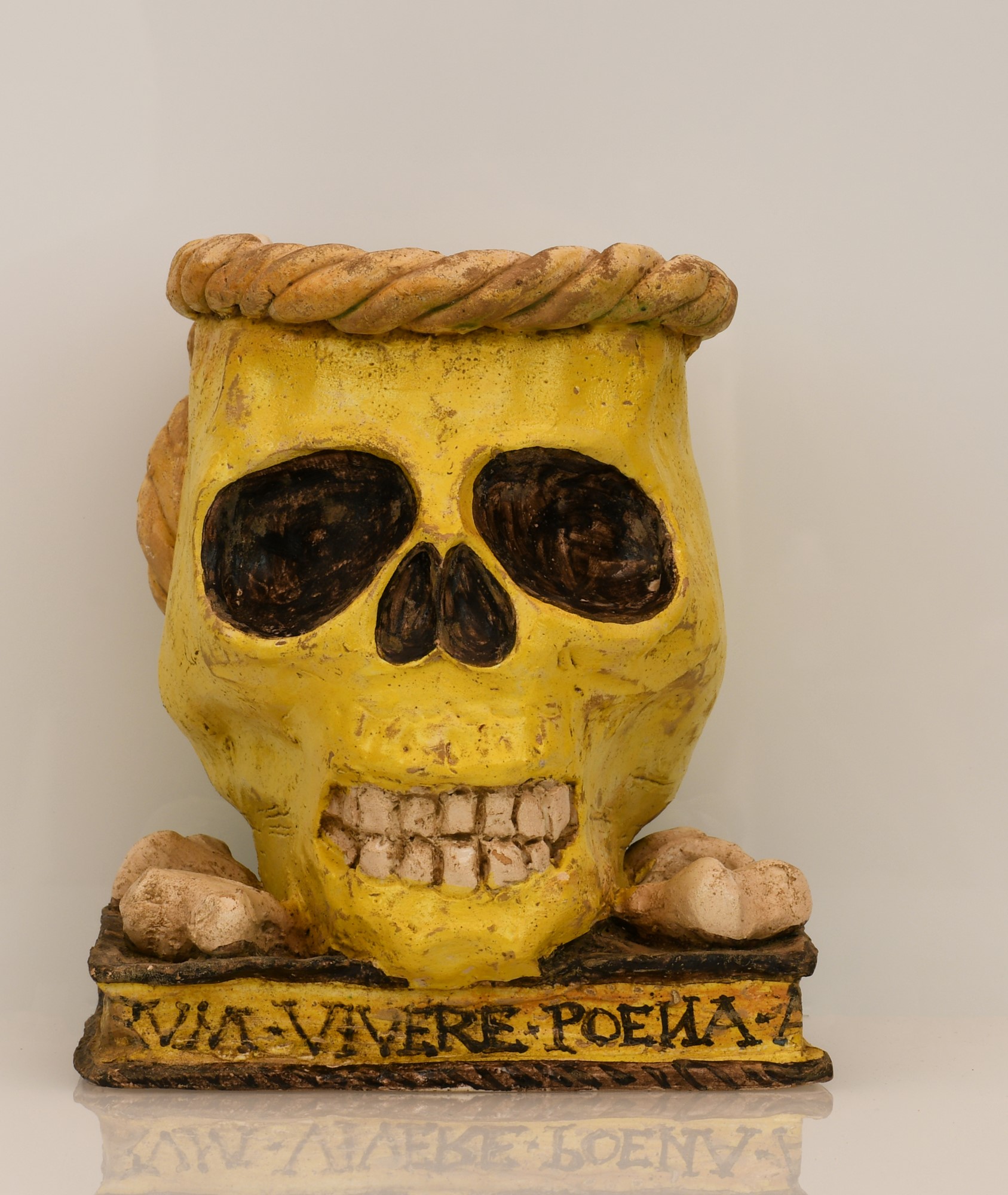 Manifattura di Caltagirone del XIX secolo. Teschio in maiolica policroma recante alla base motto in latino di Bernardo di Chiaravalle (Nasci miserum vivere poenia angustia mori)