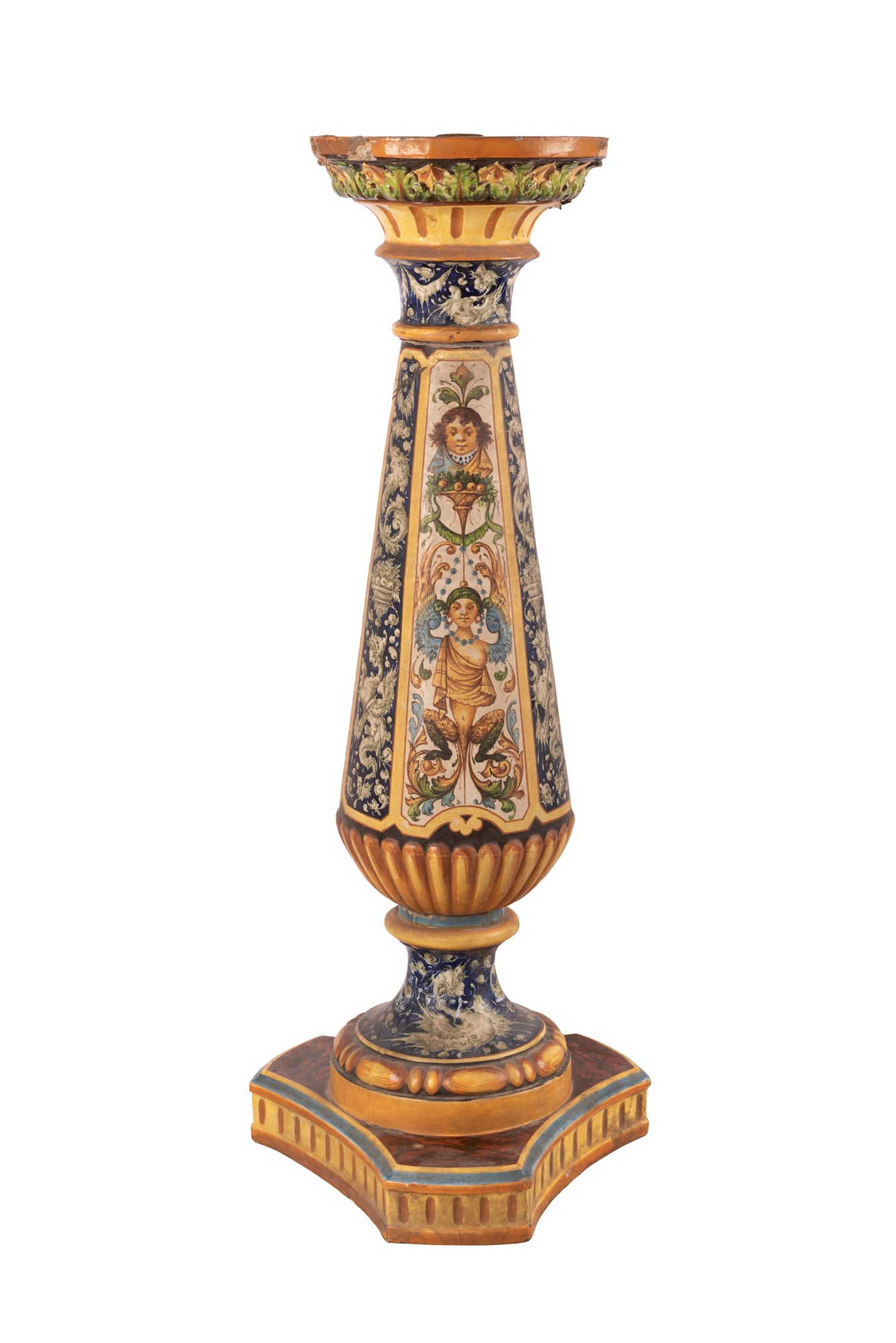 Colonna in maiolica di area metaurense con decori a raffaellesche policrome ispirate alla maiolica di Urbino della seconda metà del Cinquecento. cm 98,5x40; alla sommità Ø cm 27