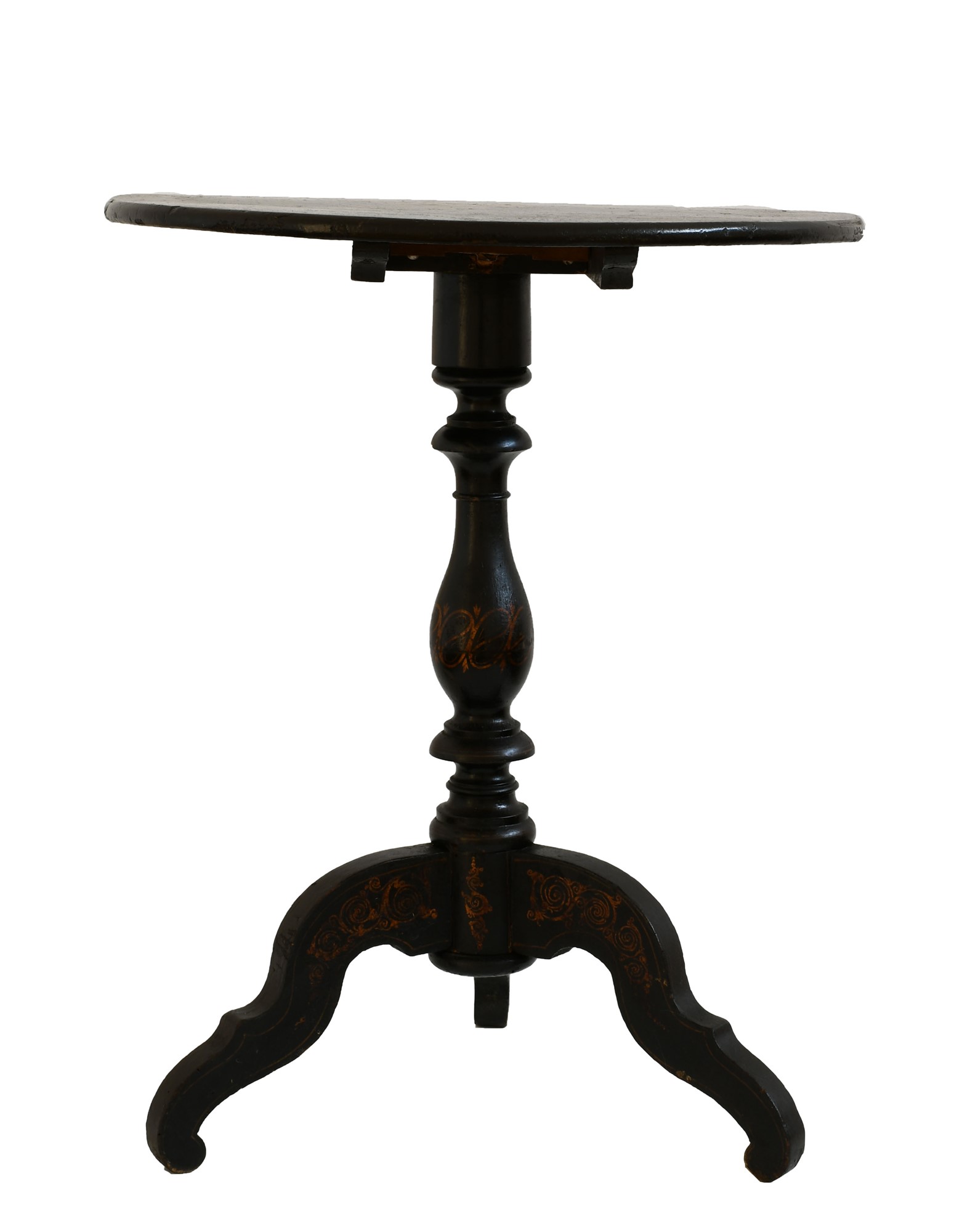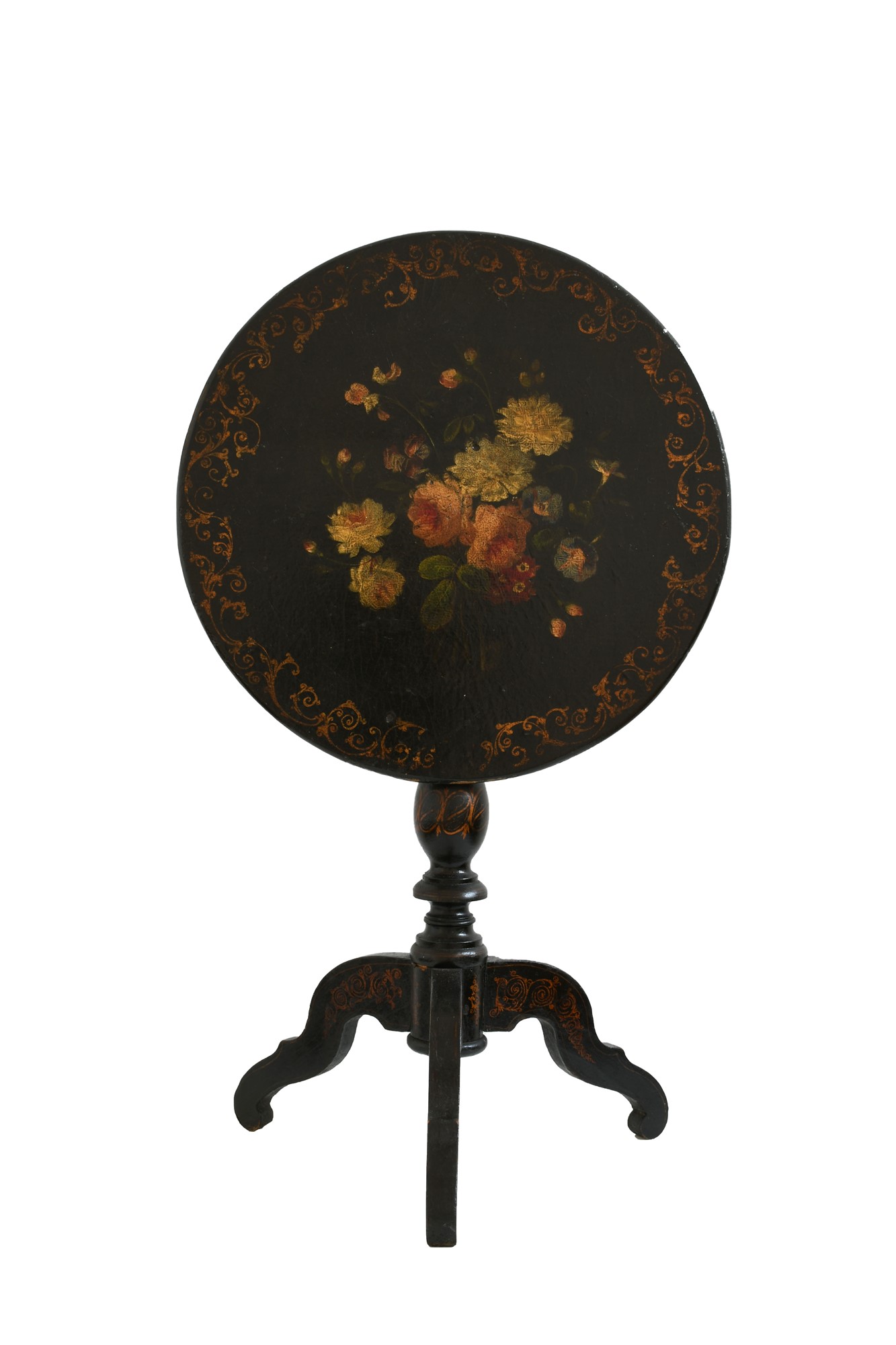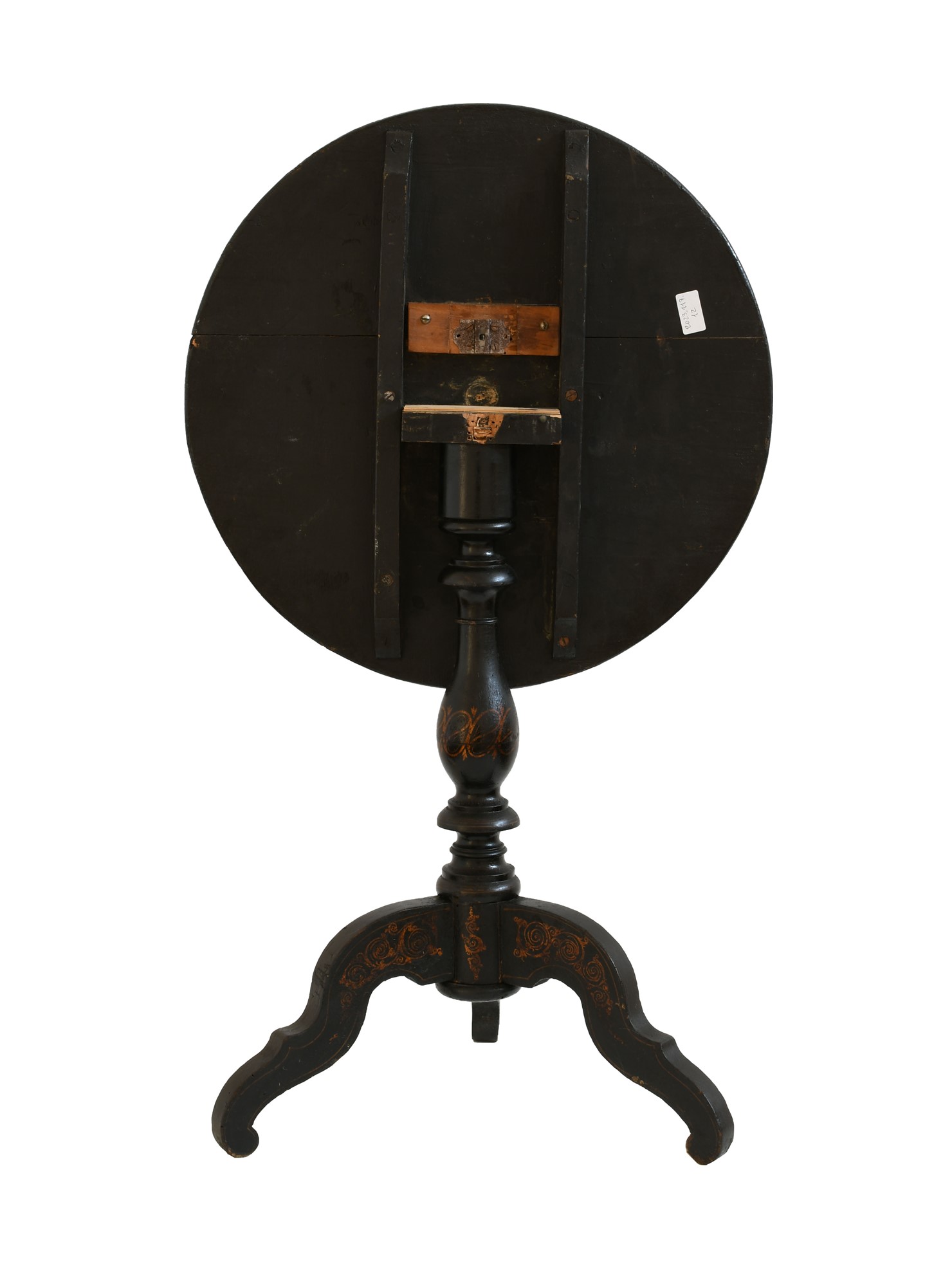 Tavolino tondo in legno ebanizzato. Piano dipinto con natura morta di fiori Francia metà del XIX secolo