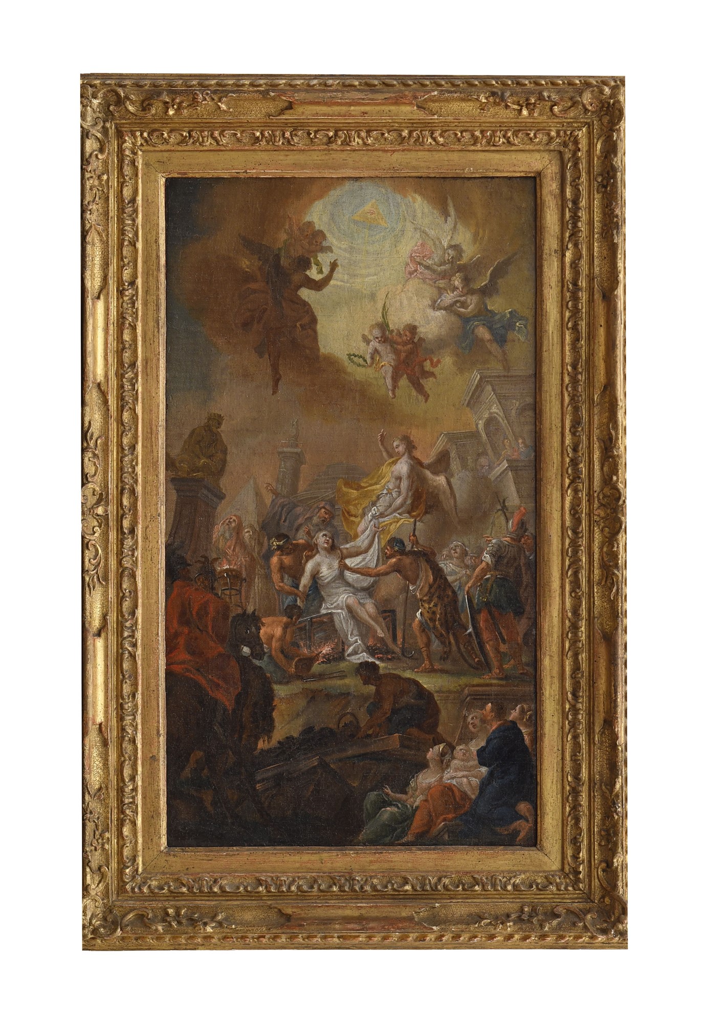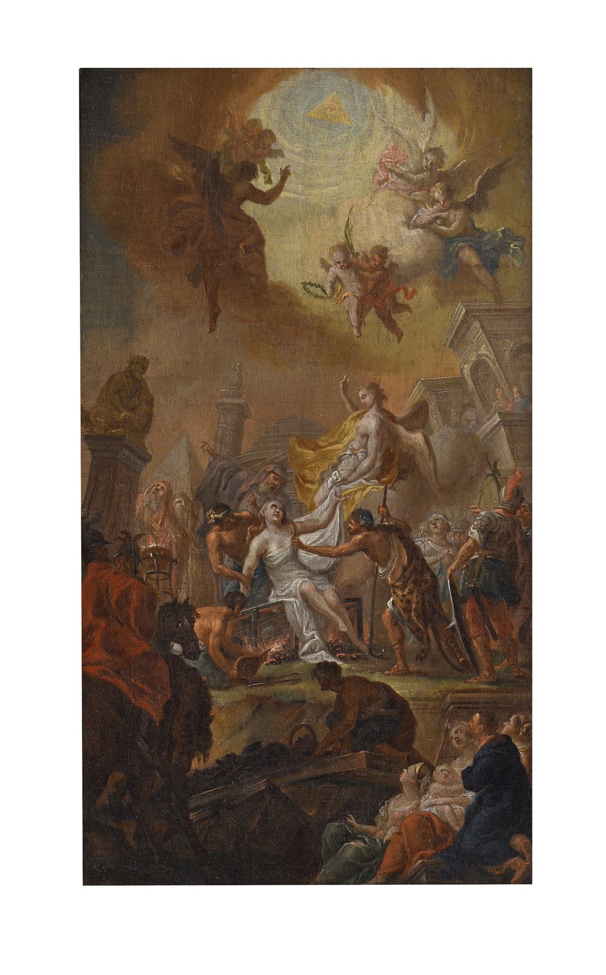 Scuola Romana XVIII secolo ( - ) Bozzetto raffigurante il martirio di Sara d'Antiochia olio su tela cm 48x27