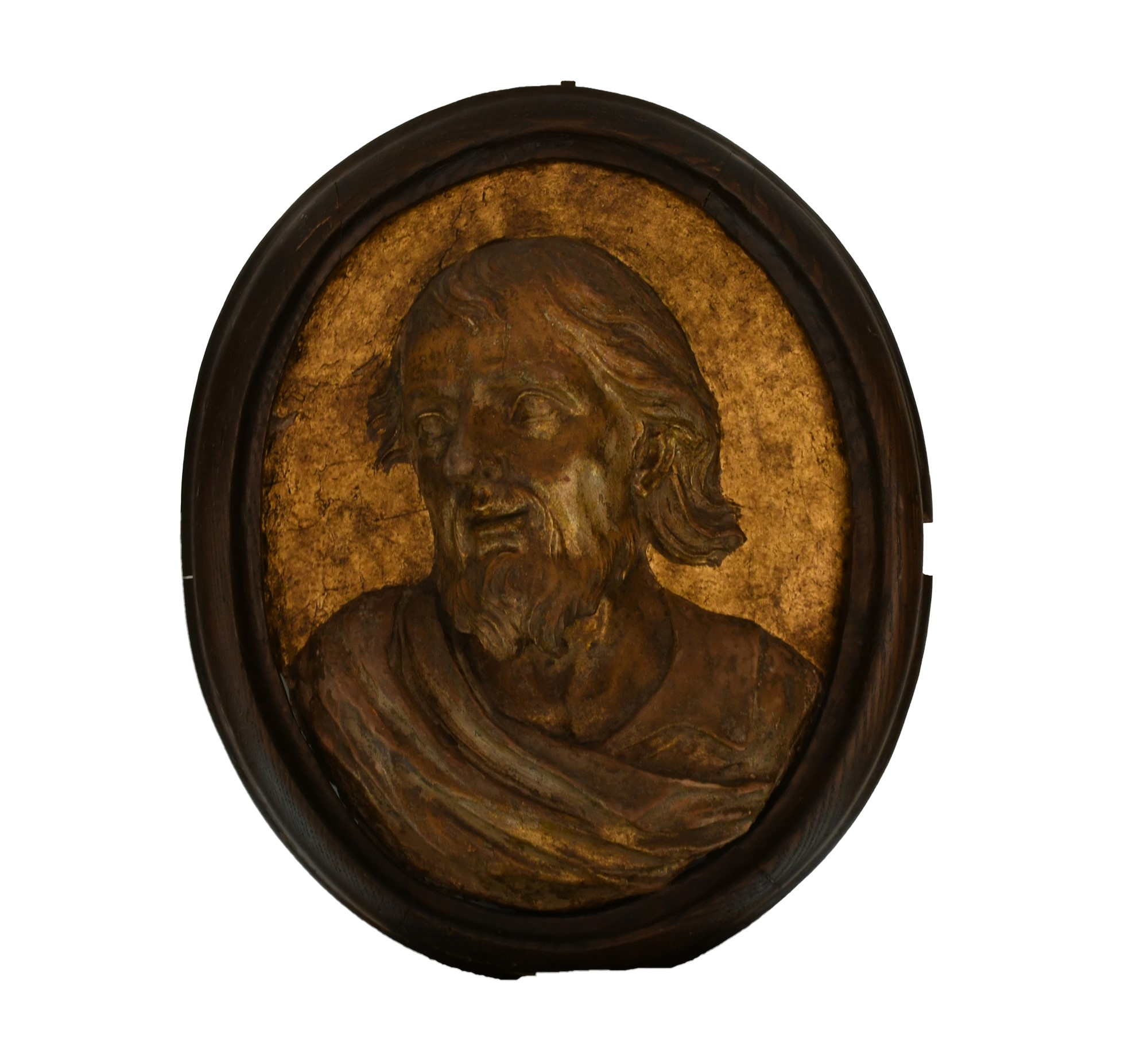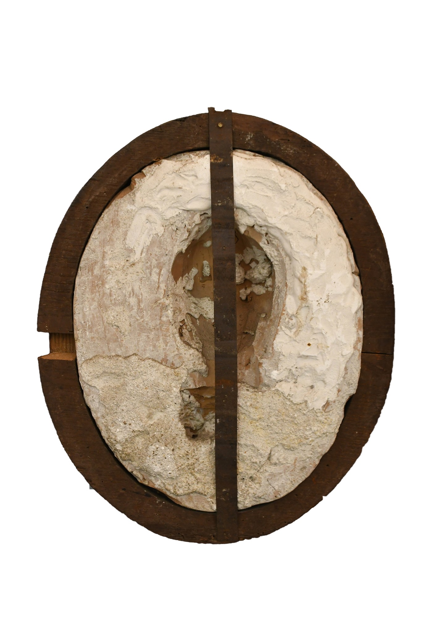 cm 40x30; coon cornice cm 49x44 Altorilievo in terracotta a fondo oro ed in cornice lignea ovale a doppia modanatura.