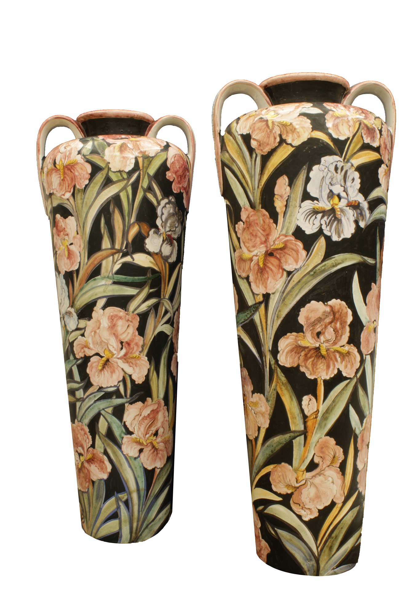 Coppia di grandi vasi biansati a sfondo nero con iris cm 105x42x19
