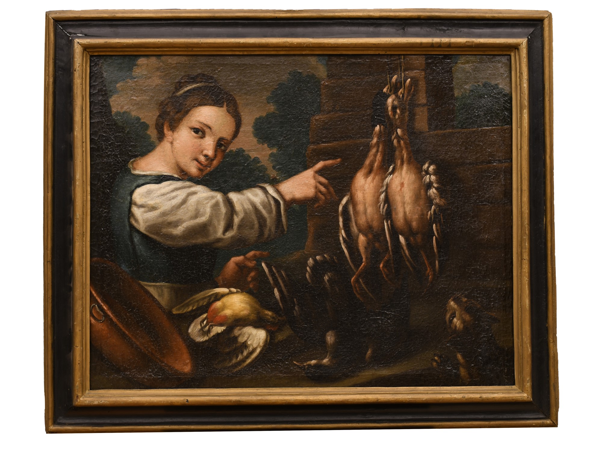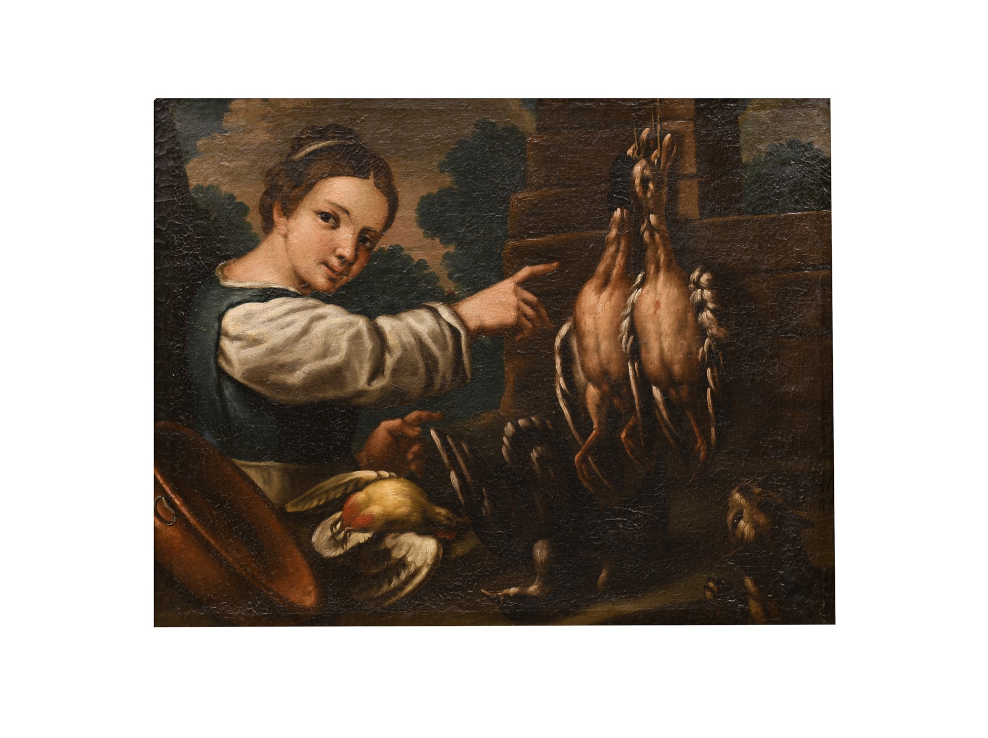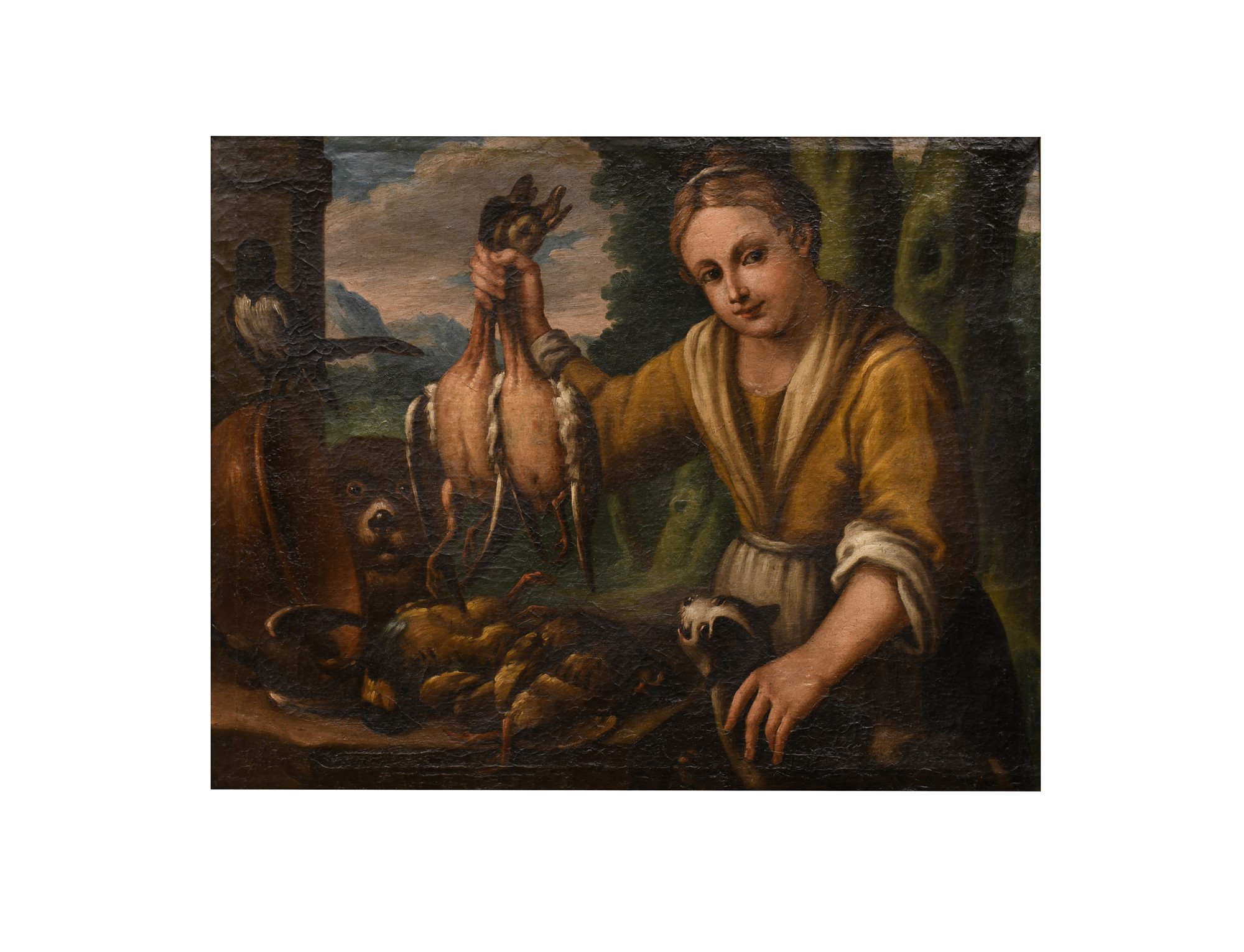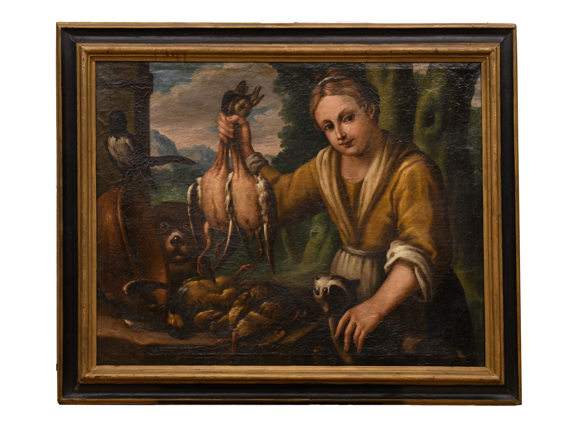 Felice Boselli (attribuito a) (Piacenza, 1650 - Parma, 1732) Coppia di Nature Morte con selvaggina, animali e giovani donne. olio su tela cm 88x69