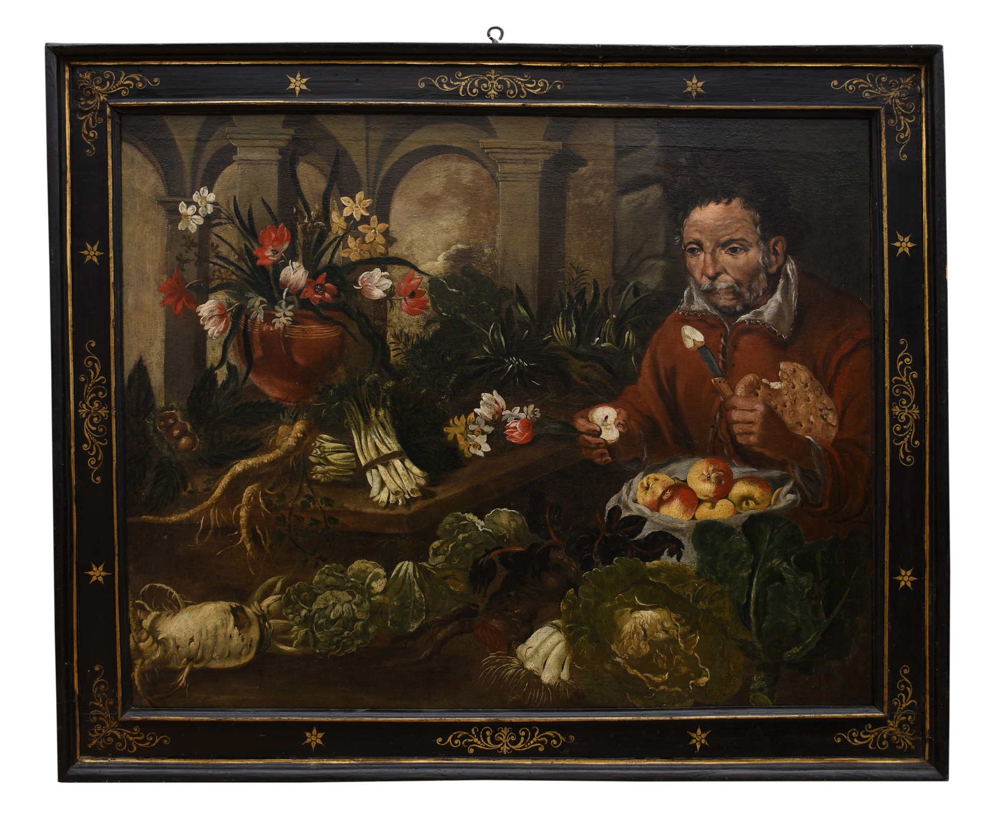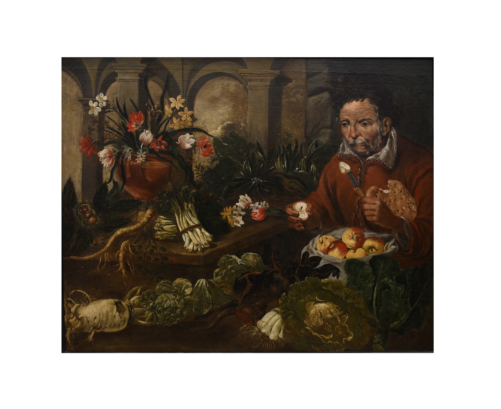 Pietro Paolo Bonzi (attribuito a) (Cortona, 1576 - Roma, 1636) La merenda del fruttivendolo olio su tela cm 102x130