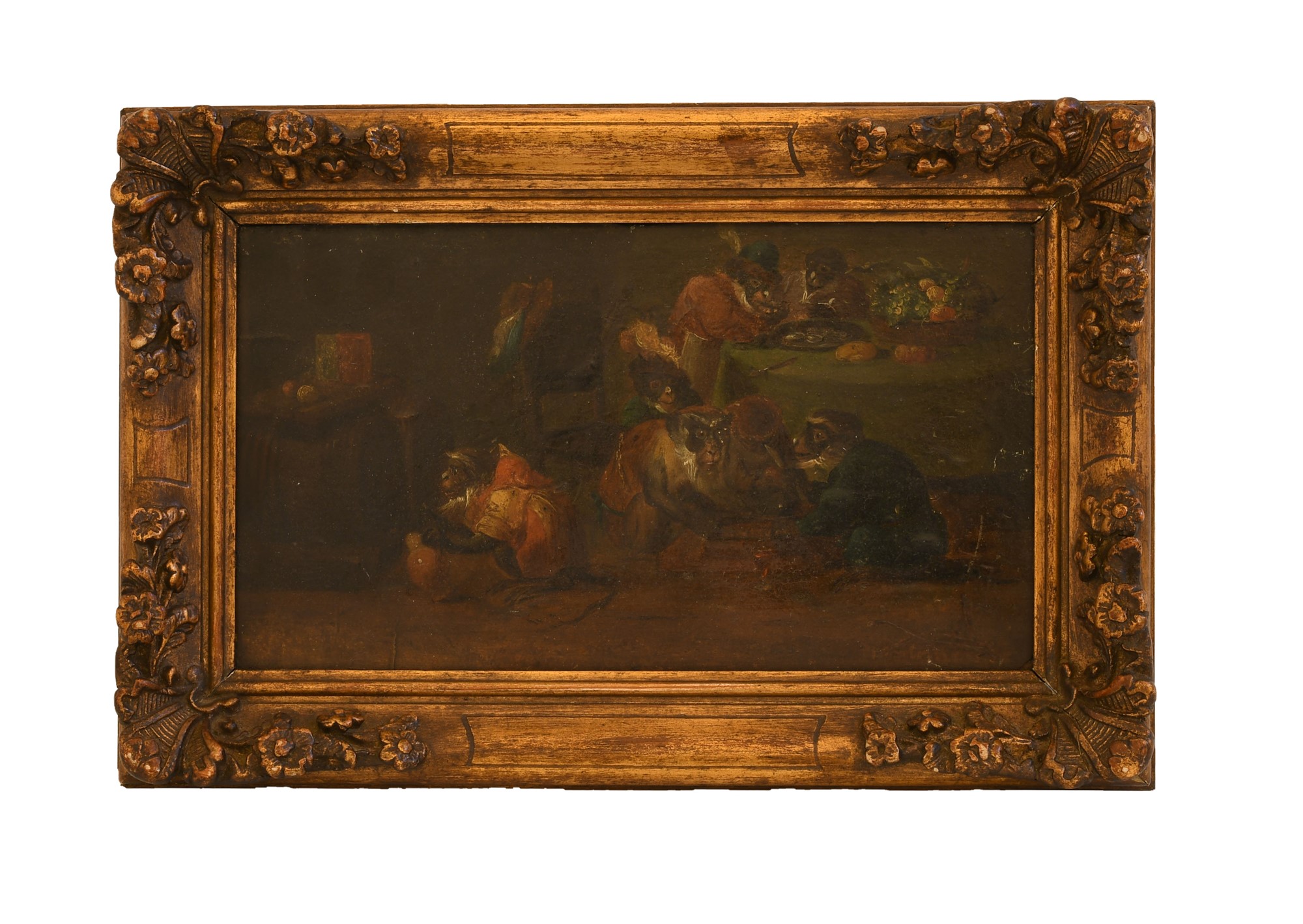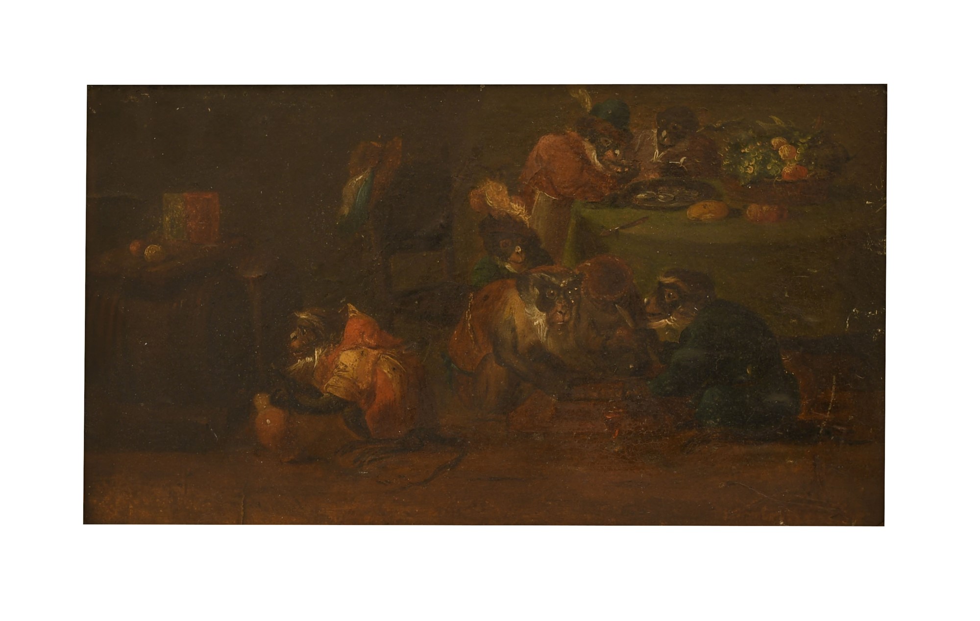 David Teniers II (probabilmente_dapres) (Anversa, 1610 - Bruxelles, 1690) Il banchetto delle scimmie Olio su tavola cm 13x25; con cornice cm 24x33