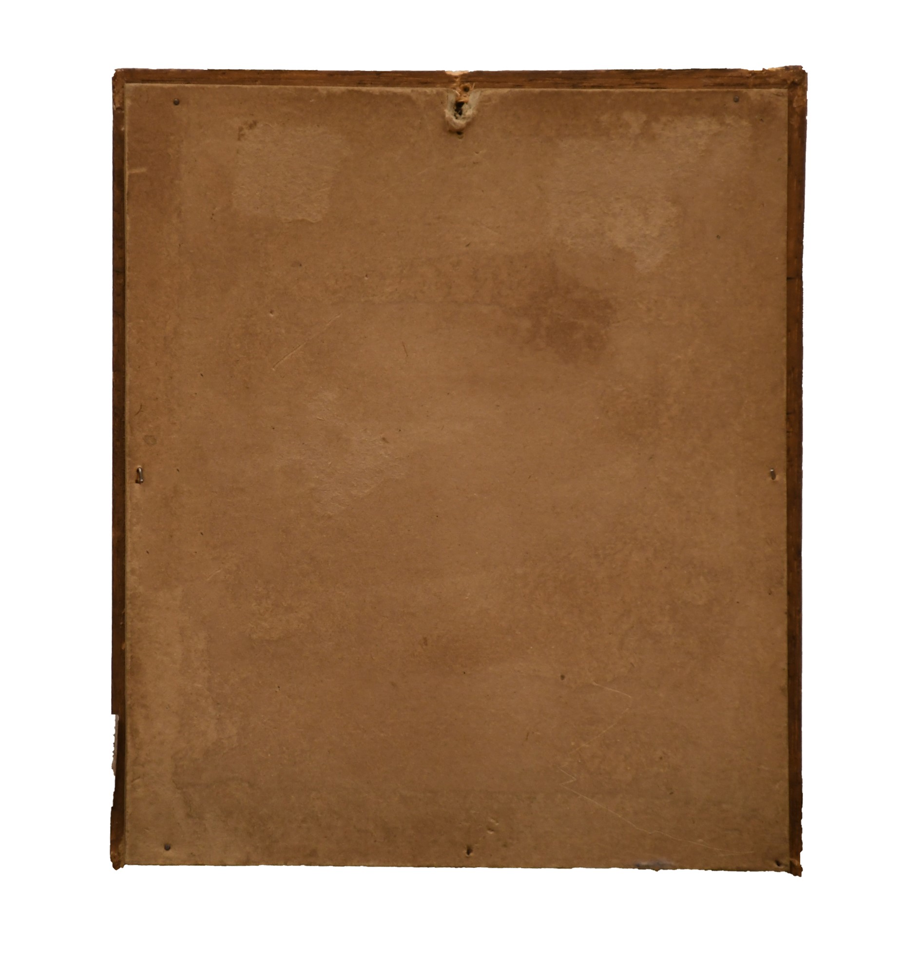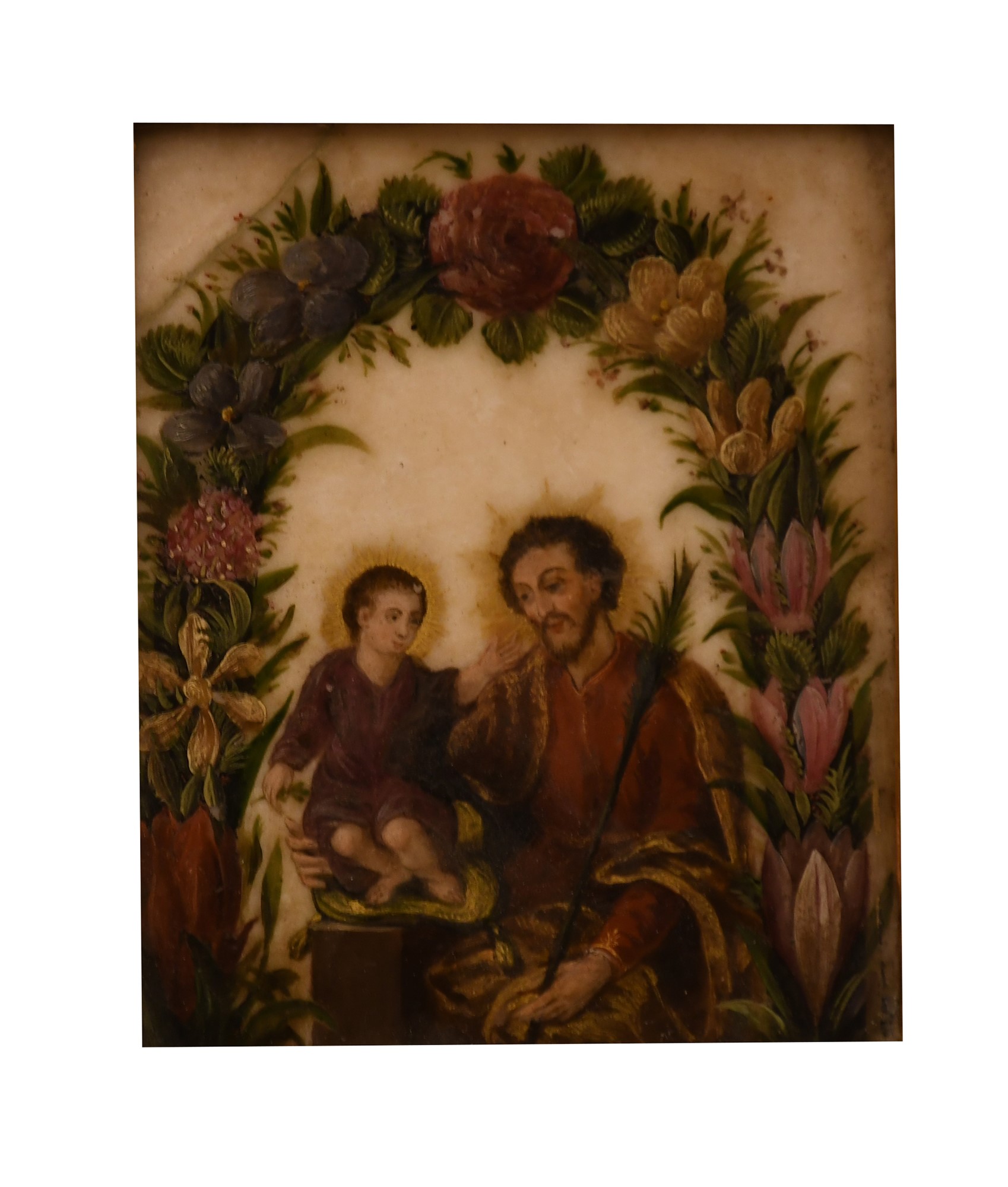 Scuola italiana del XVIII secolo ( - ) San Giuseppe con il Bambin Gesù inseriti in un arco di foglie e fiori XVII secolo olio su marmo dipinto cm 13x16