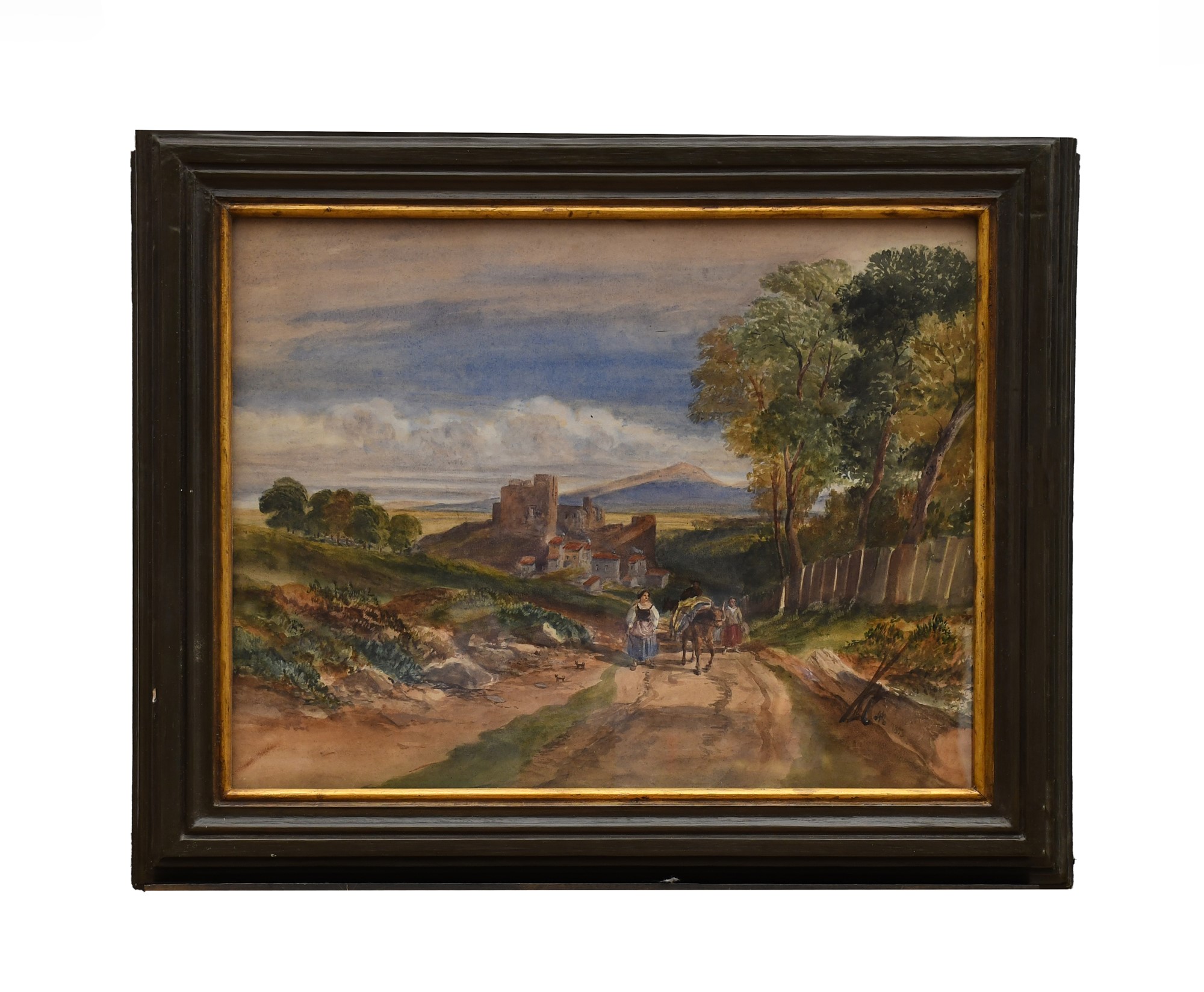 Paesaggio agreste (Ciociaria?) con figure di viandanti acquerello su tela cm 49x38