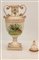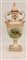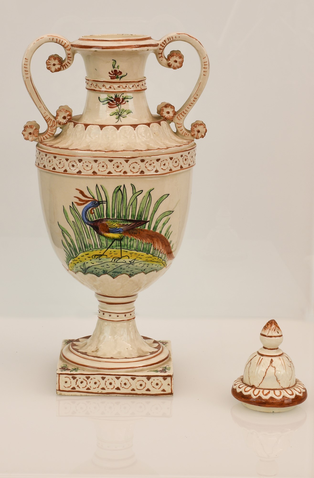 Vaso biansato in ceramica dipinta con motivi floreali in stile settecentesco. Decoro centrale policromo con pavone. Bassano, inizi del XX secolo con coperchio cm 45x20