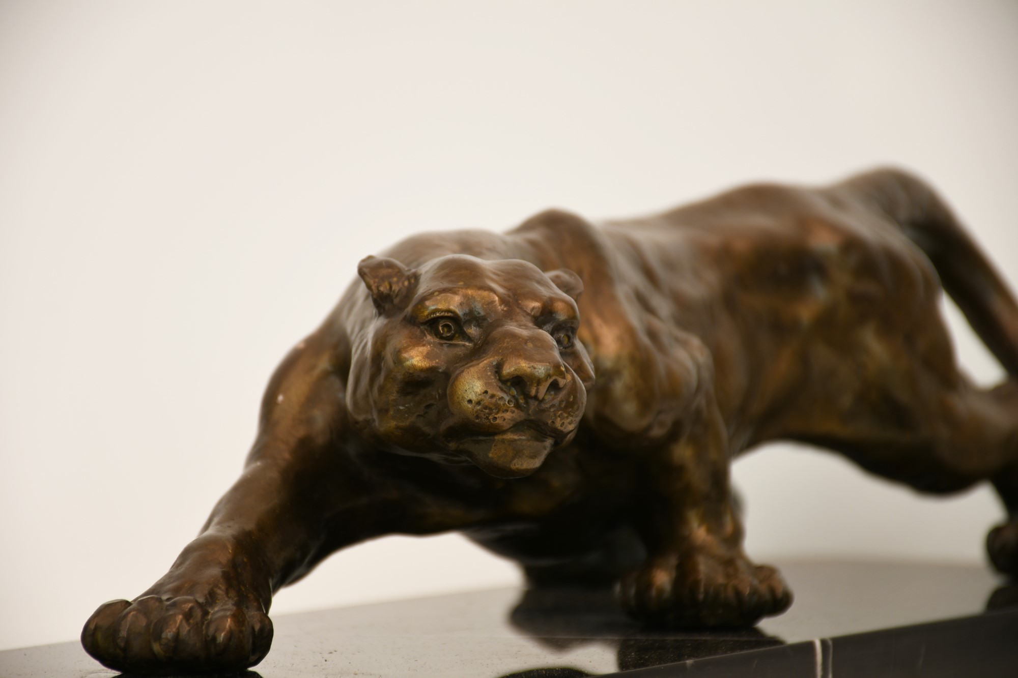 Scultura in bronzo raffigurante una pantera nell'atto di attaccare una preda.