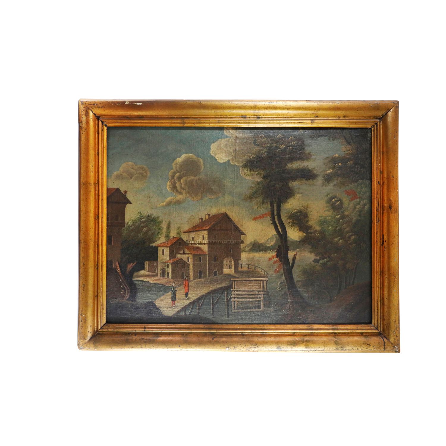 Scorcio di paesaggio con fiume e personaggi e costruzioni Scuola nord europea XVIII secolo