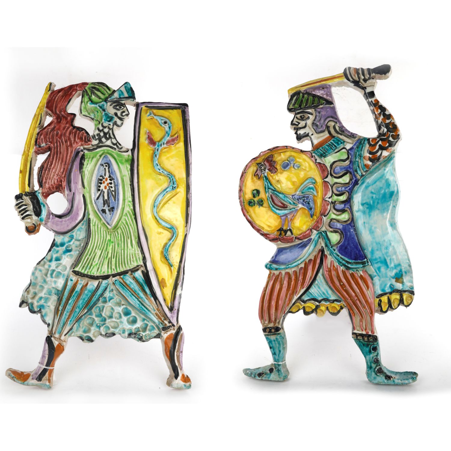 Giovanni De Simone (Palermo, 1930 - Palermo, 1991) Coppia di guerrieri, scultura in forma in ceramica policroma metà XX secolo 50 x 30 x 2 cm