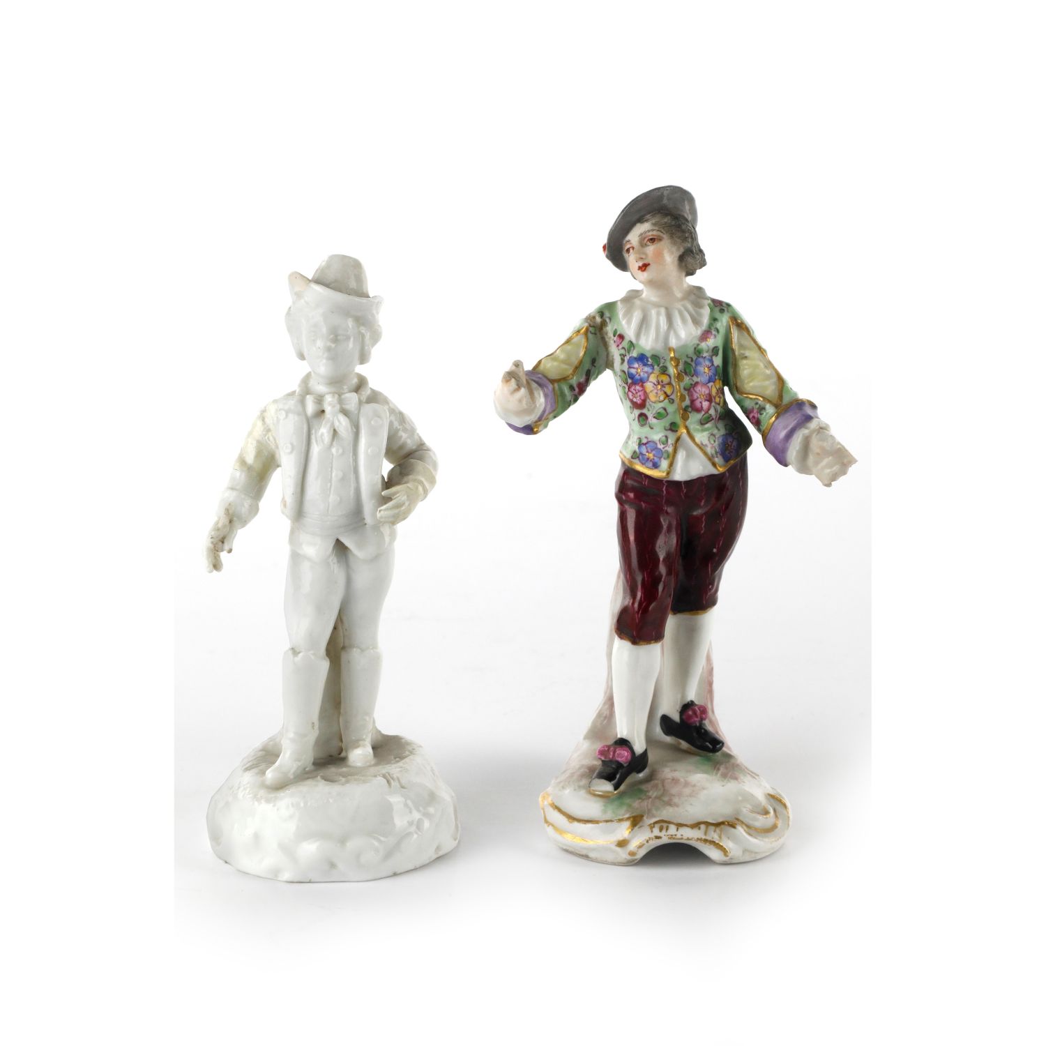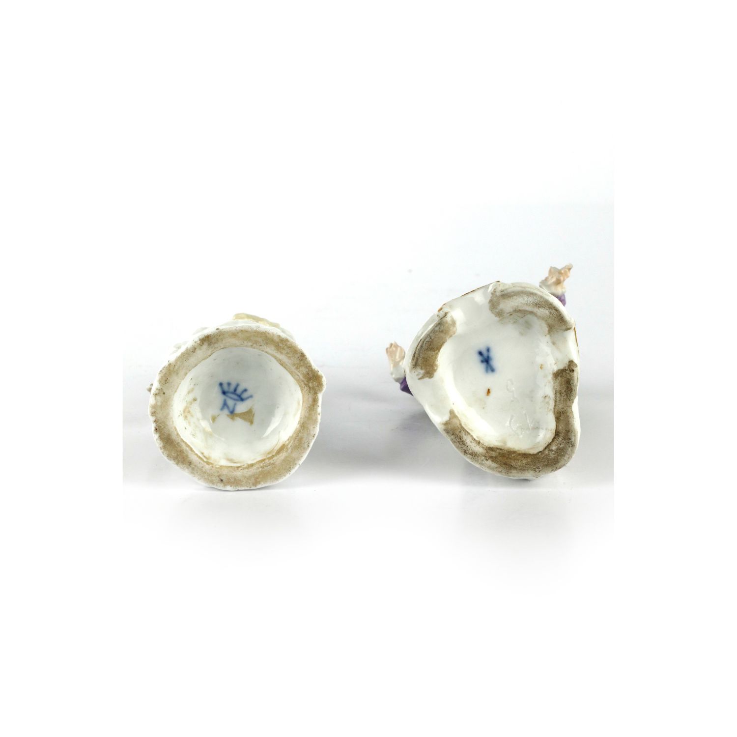 12 x 5 x 4,5 e 11 x 4,51 in porcellana bianca l'altro in porcellana policroma. Manifattura francese mancanze e rotture