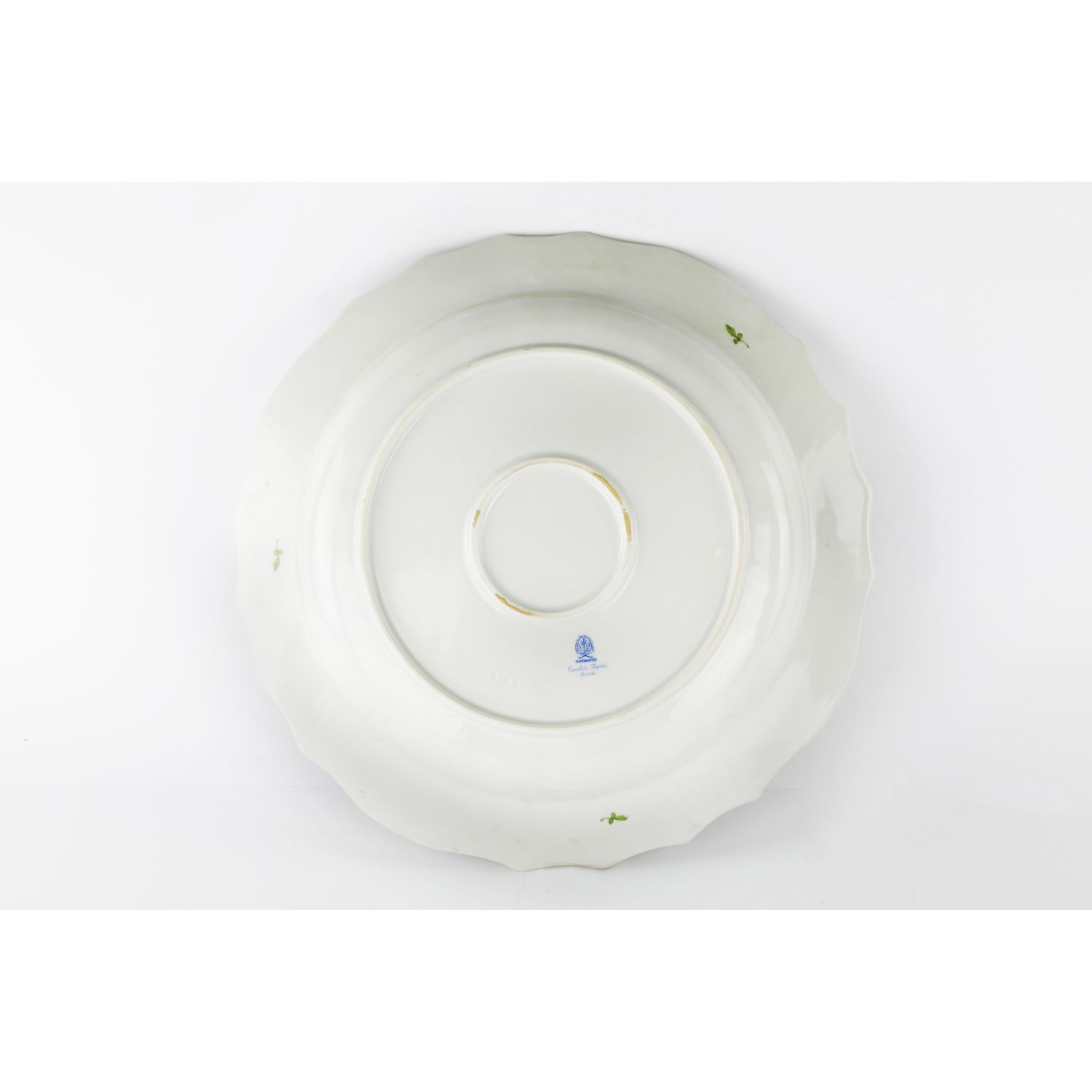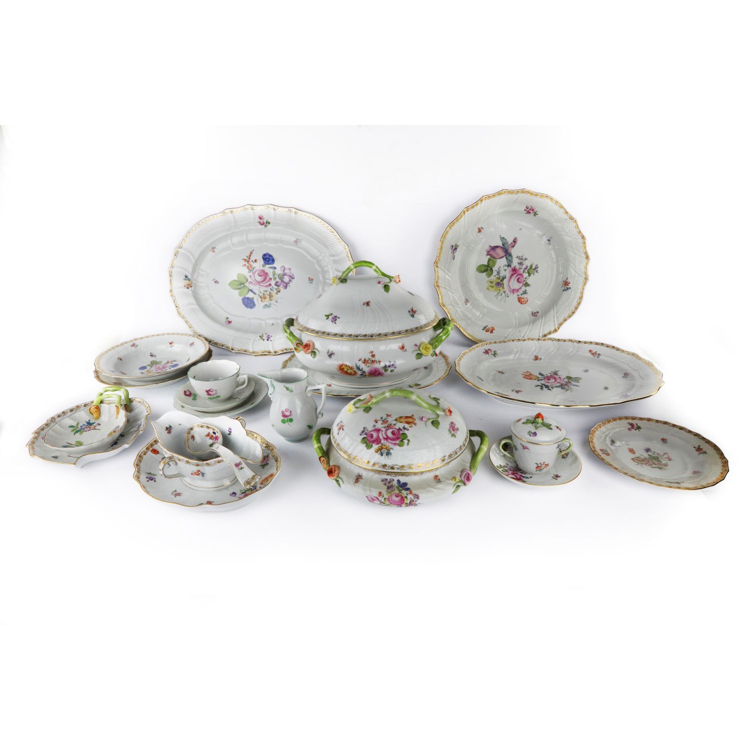 12 scodelle fonde ,24 scodelle piane ,24 piatti da dessert, 1 salsiera con cucchiaio , 2 assiet a foglia ,1 poggiomestolo,1 terrina con il coperchio ,1 zuppiera con presentatoio , 2 piatti da portata ovali, 2 piatti da portata tondi , 10 tazze da consommè con 11 piattini ed 1 tazza, 2 tazze da the con piatto proprio e 2 piatti da dessert en suite e 2 piccole portacrema con coperchio , 1 caffettiera rotta ed 1 lattiera pz.102
