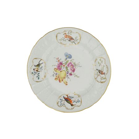 24,5 x 3 x 14 cmda coltello, tesa a rilievo a motivi floreali entro costoloni, base d'appoggio ad anello. Decoro con uccelli entro riserve dorate lungo la tesa e mazzo di fiori sul fondo del piatto, finiture in oro zecchino lungo il bordo. Marchio spade incrociate con punto tra le else in blu sottosmalto, manifattura di Meissen. Dorature in più punti usurate