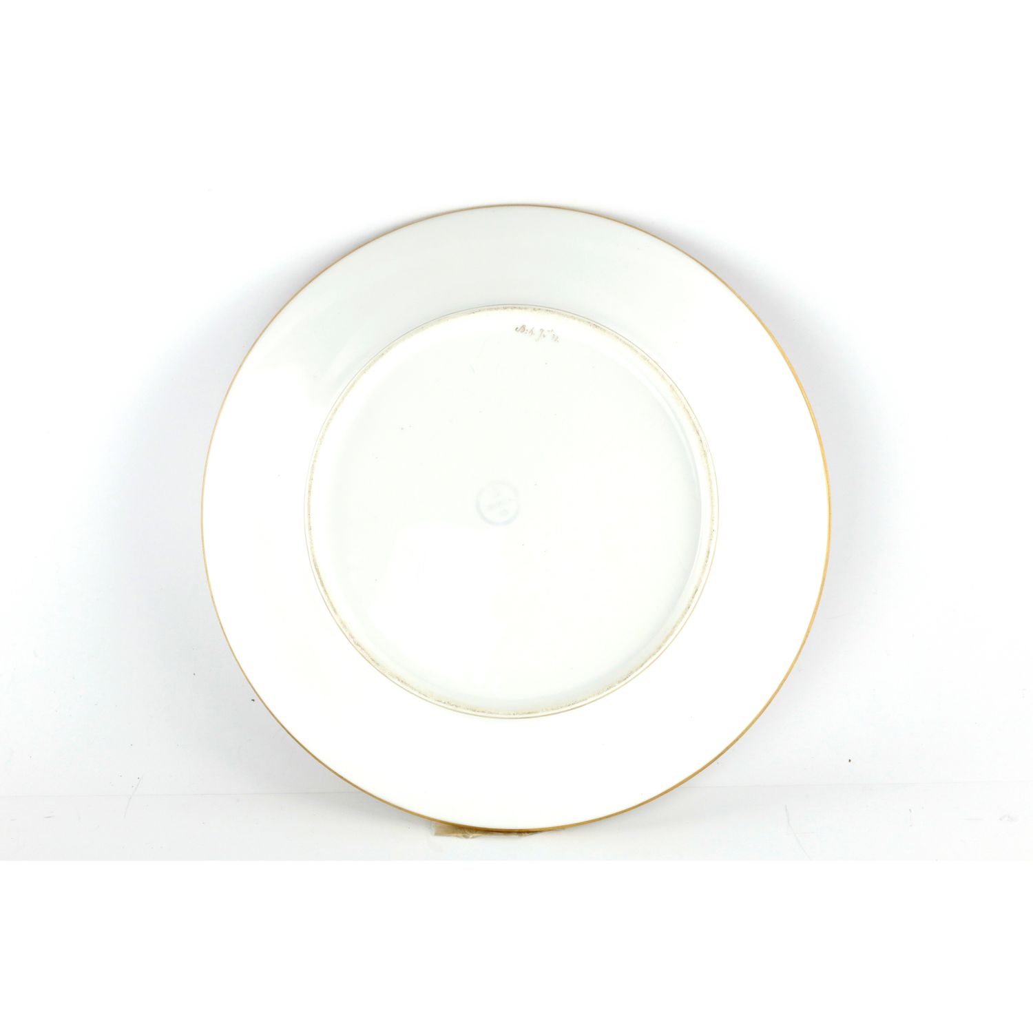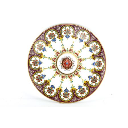 23,4 x 3 x 14,5 cma fondo ribassato con decoro ad archi moreschi e fiori su fondo bianco. Il piatto fa parte del servizio in stile moresco eseguito nei primi anni '30 del XIX secolo ed era composta da 144 pz circa . Al retro incusso nella pasta dedica e data con timbro manifattura di Sevres in blu sottosmalto