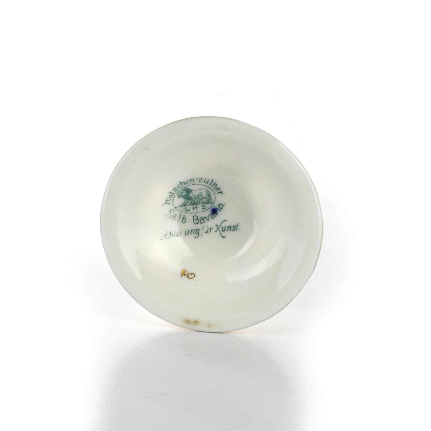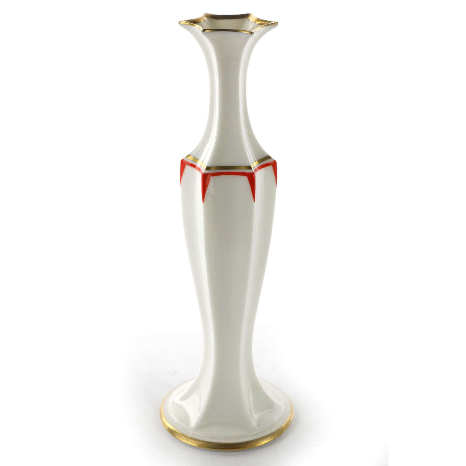 19 x 6,2 cmcorpo a balaustro con costoloni orizzontali, piede ad anello, finiture rosso porpora ed oro zecchino su bianco. Progetto di Karl Trutter, sottosmalto in verde marchio di fabbrica e firma dell'autore incussa nella pasta alla base, manifattura di Selb Bavaria