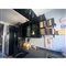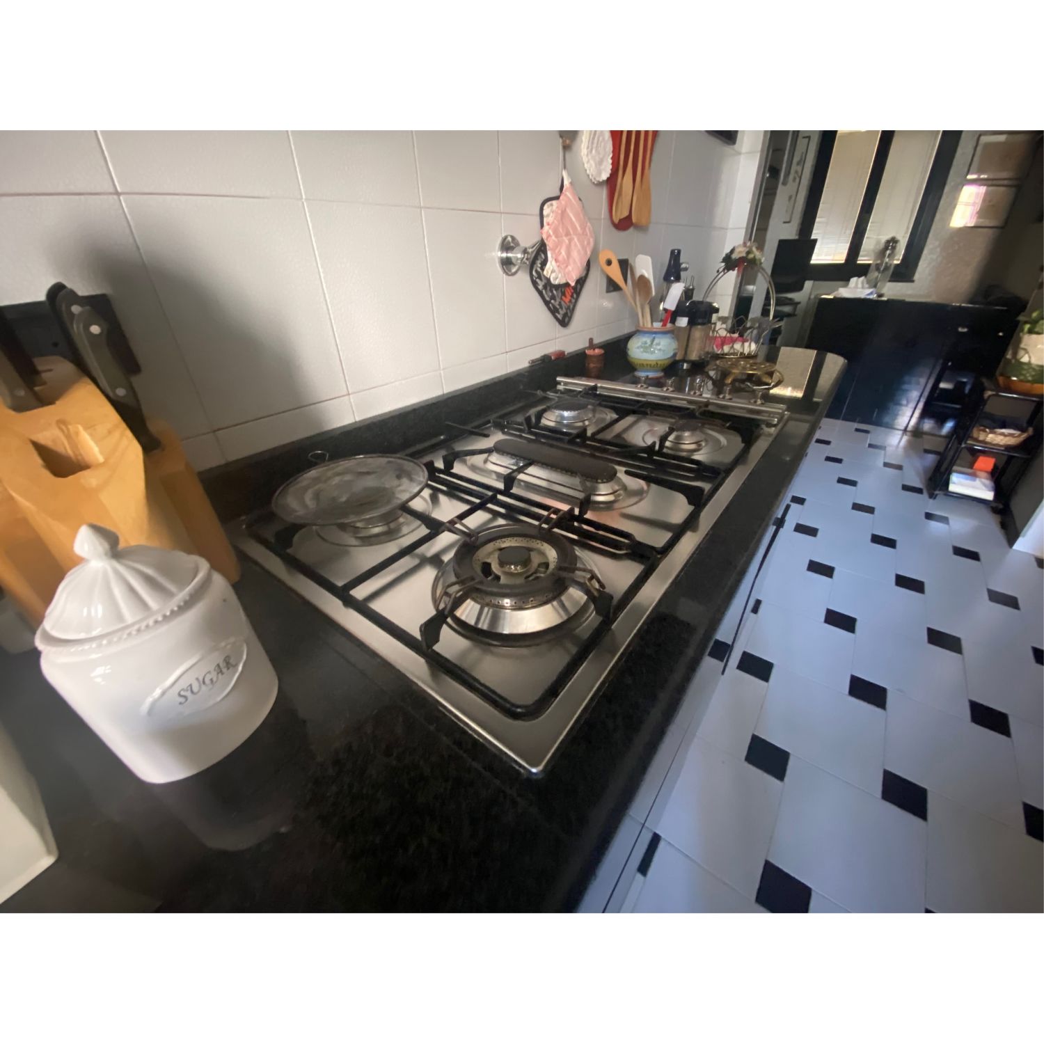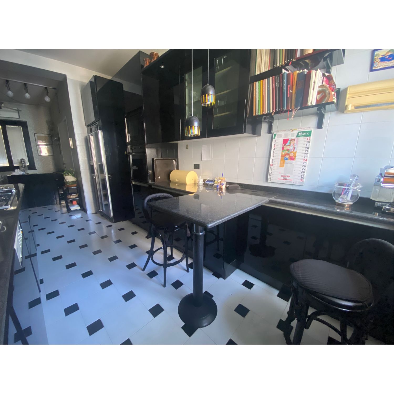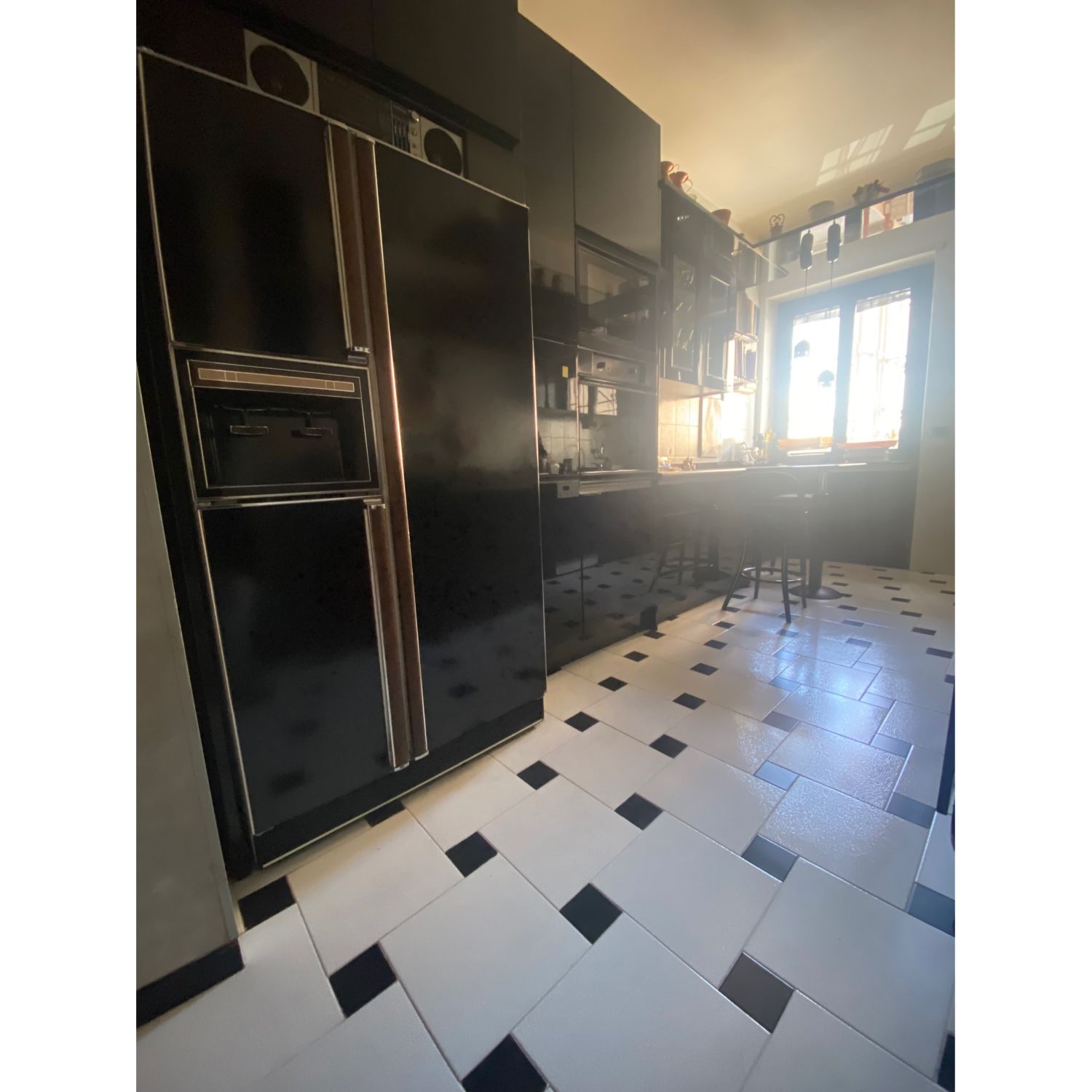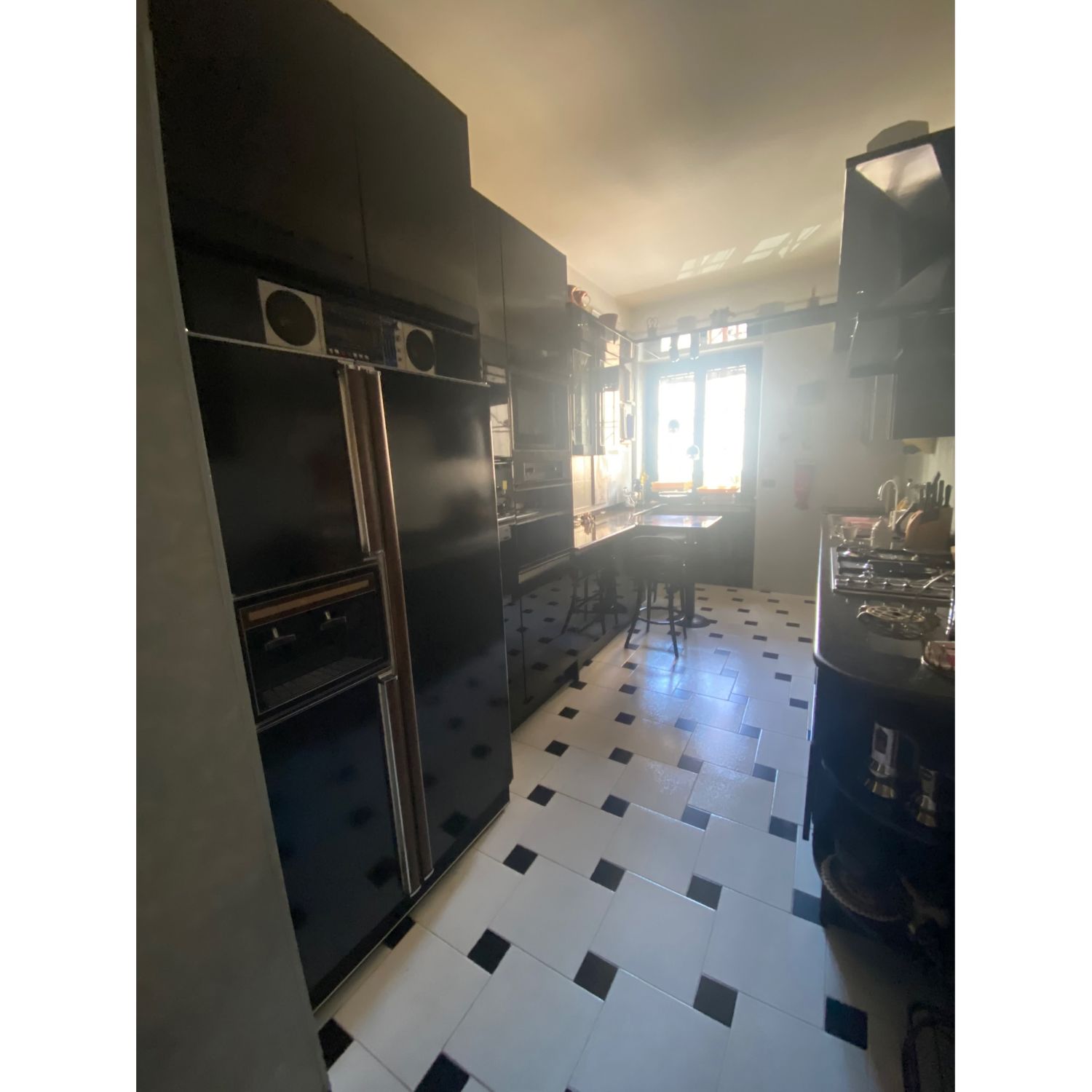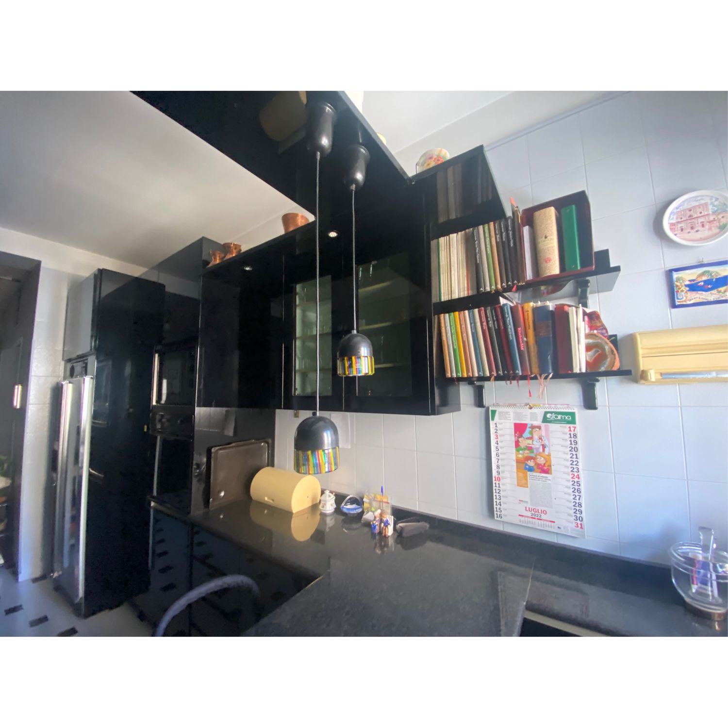 con fuochi ,lavello, elettrodomestici, lavatrice, lavastoviglie, frigorifero, forno elettrico, forno microonde e impianto stereo con penisola pariatale , tavolo da pranzo in vetro e cassapanca di contorno in legno laccato nero, completa di 2 mensole in perfetto stato manutentivo