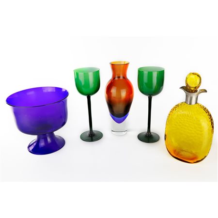 1 bottiglia ,1 vaso e 2 bicchieri ed un coppa a forme e dimensioni differenti. Piccola sbeccatura