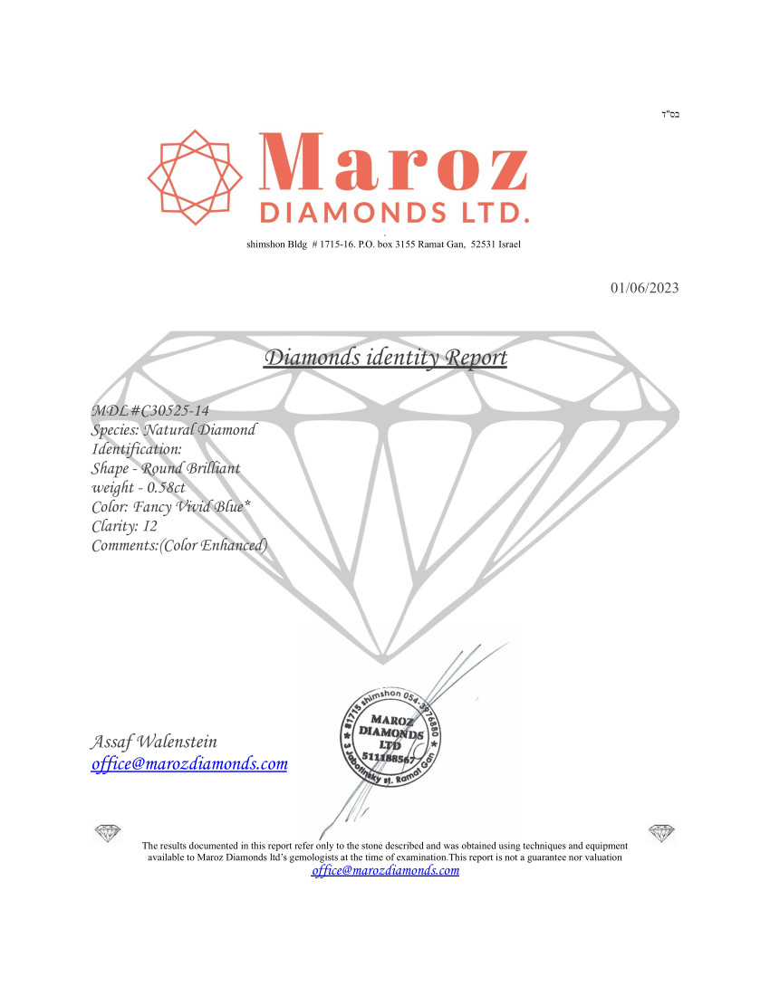 DIAMANTE COLORE ESALTATO 0,58 CT COLORE FANCY BLU VIVIDO* - PUREZZA I2 - TAGLIO BRILLANTE - CERTIFICATO ID - C30525-14