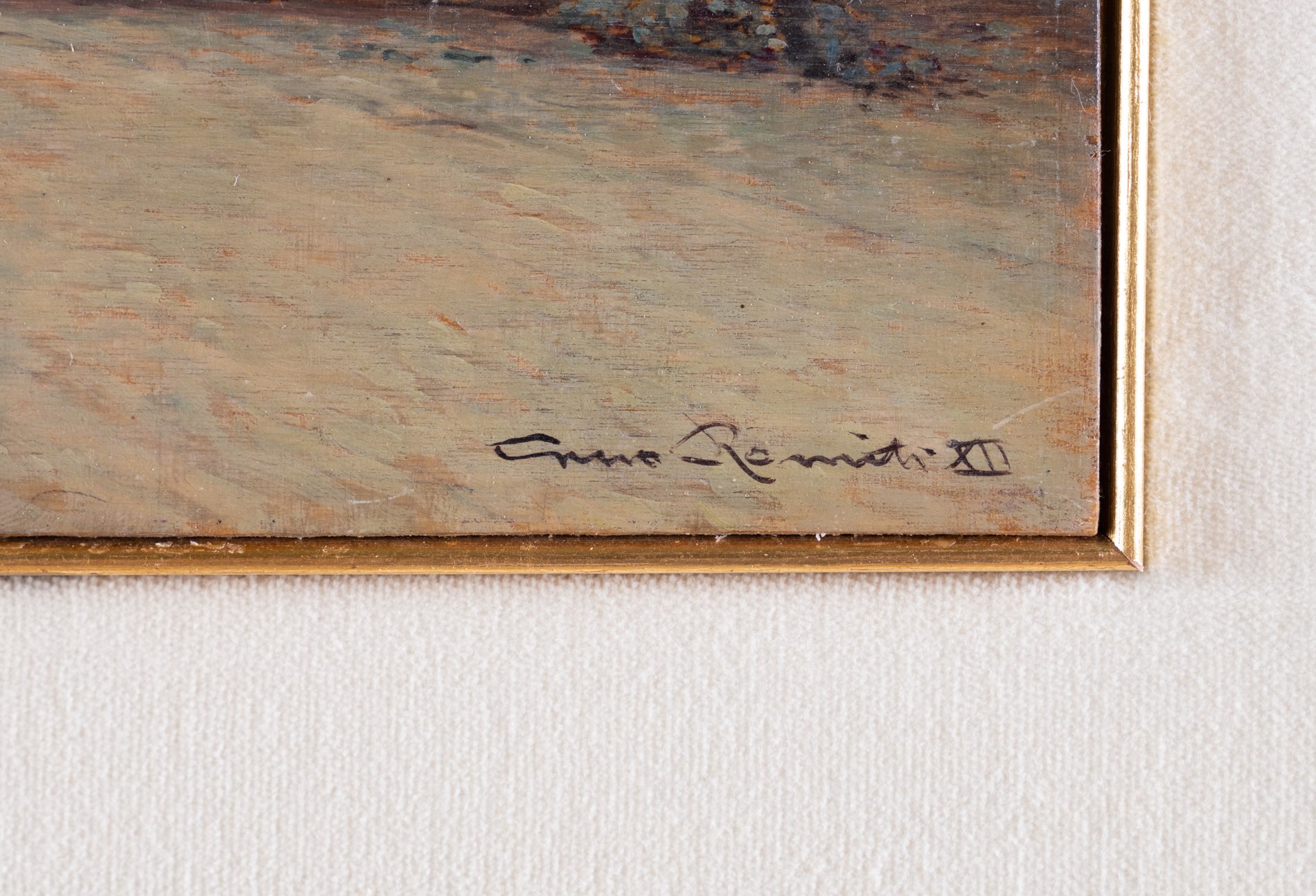 Gino Romiti (Livorno 1881 - 1967), “Paesaggio con figure”, 1912. Olio su tavoletta, firmato e datato in basso a destra, H cm 10x15