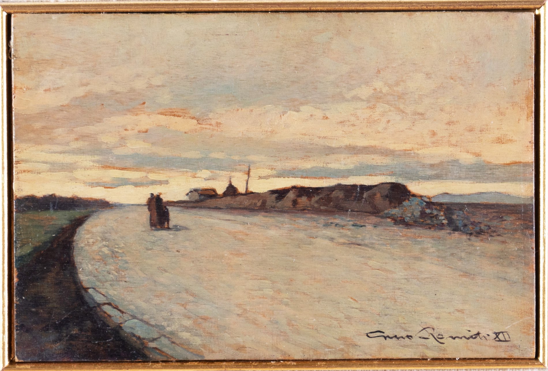Gino Romiti (Livorno 1881 - 1967), “Paesaggio con figure”, 1912. Olio su tavoletta, firmato e