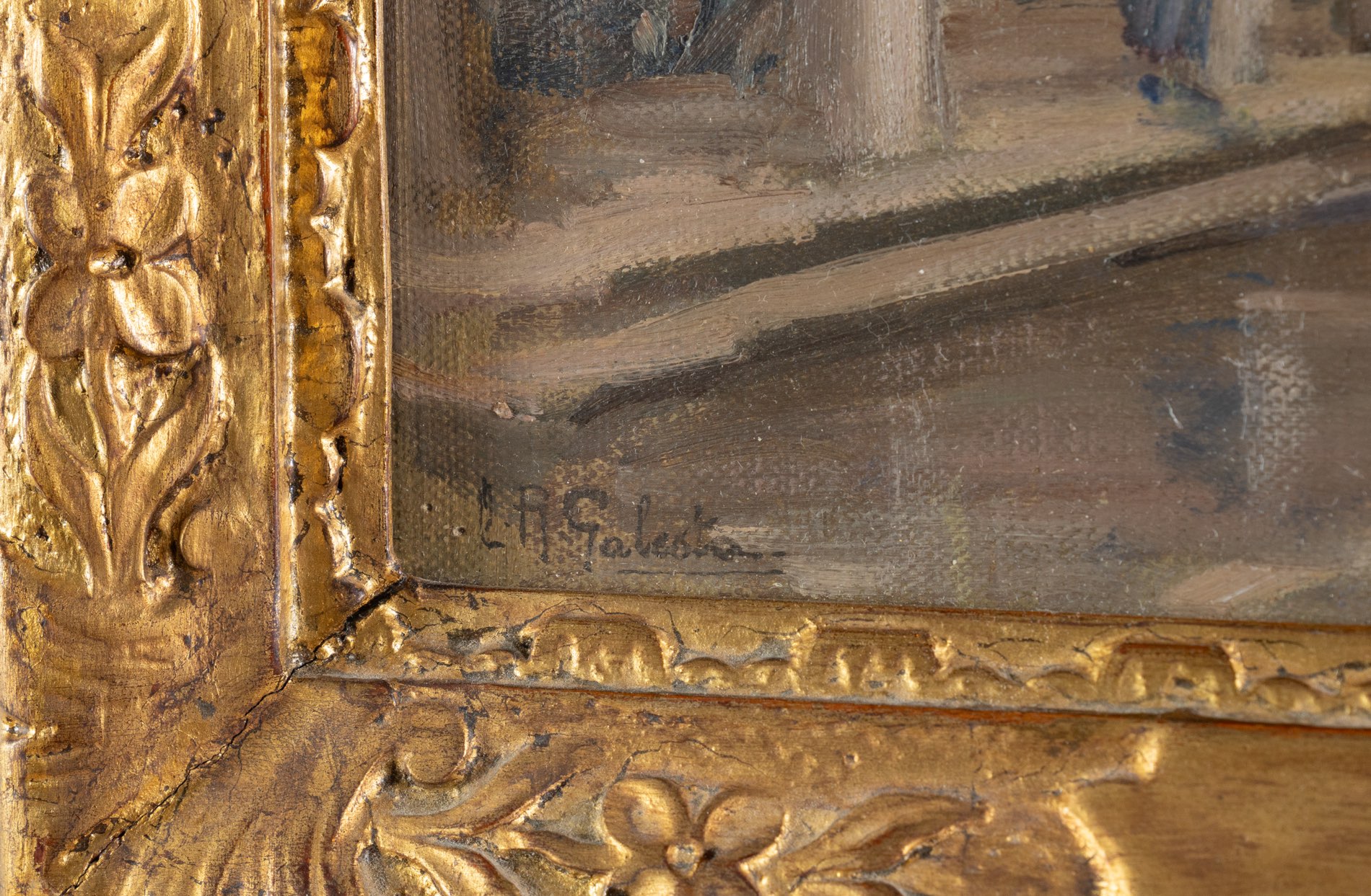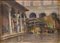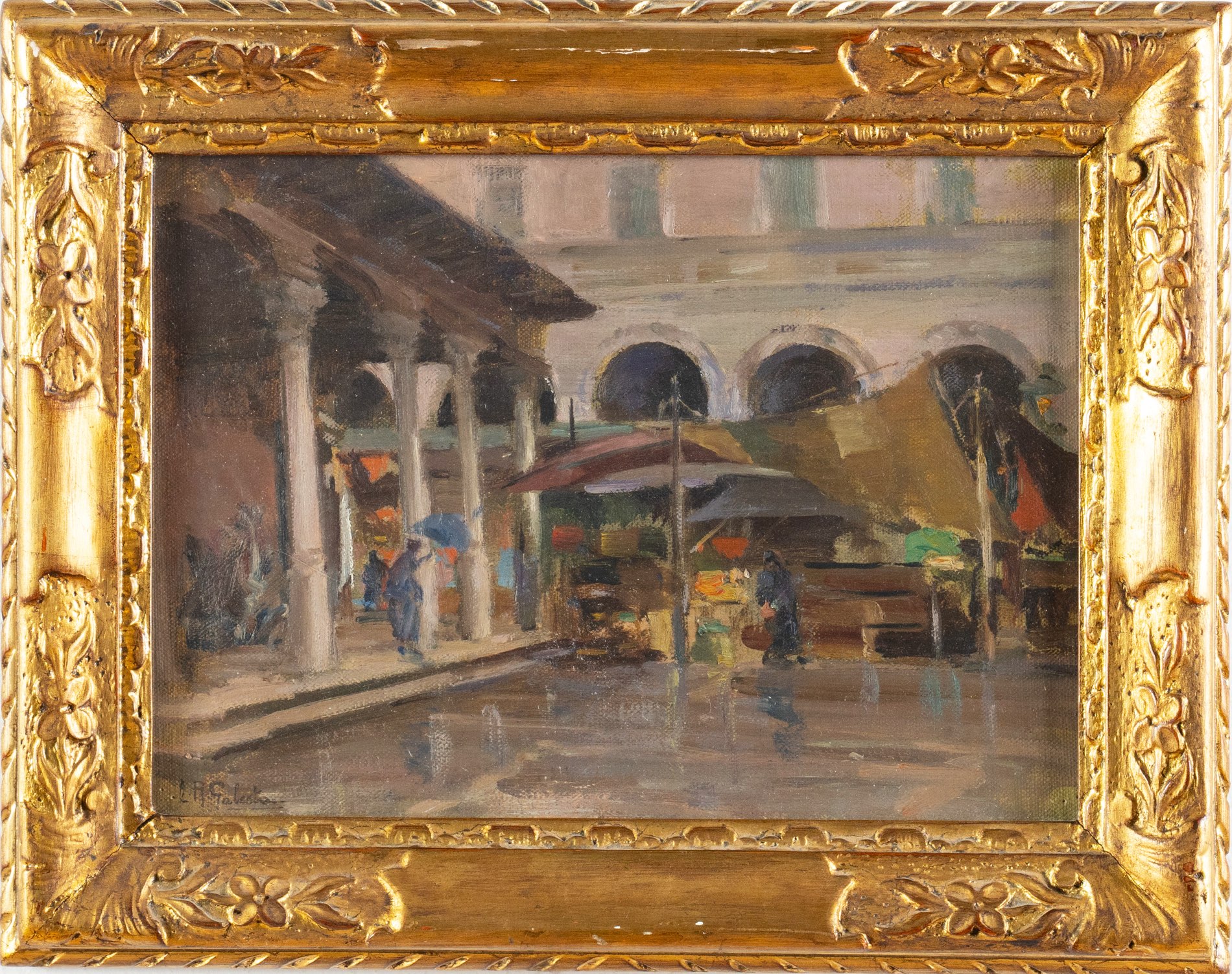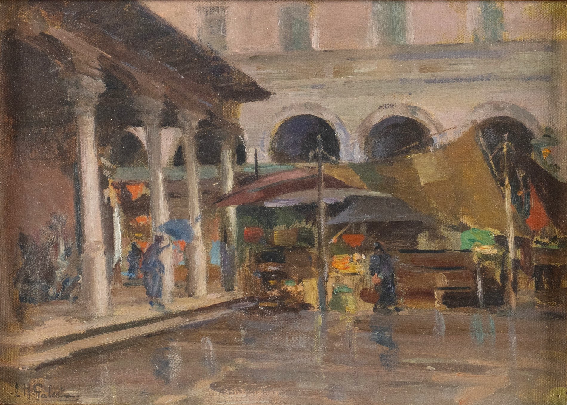 Leopoldo Russo Galeota (Napoli 1968 - Quinto al mare 1938), “Mercato sotto la pioggia - Venezia”. Olio su cartoncino, firmato in basso a sinistra, H cm 22x29.5