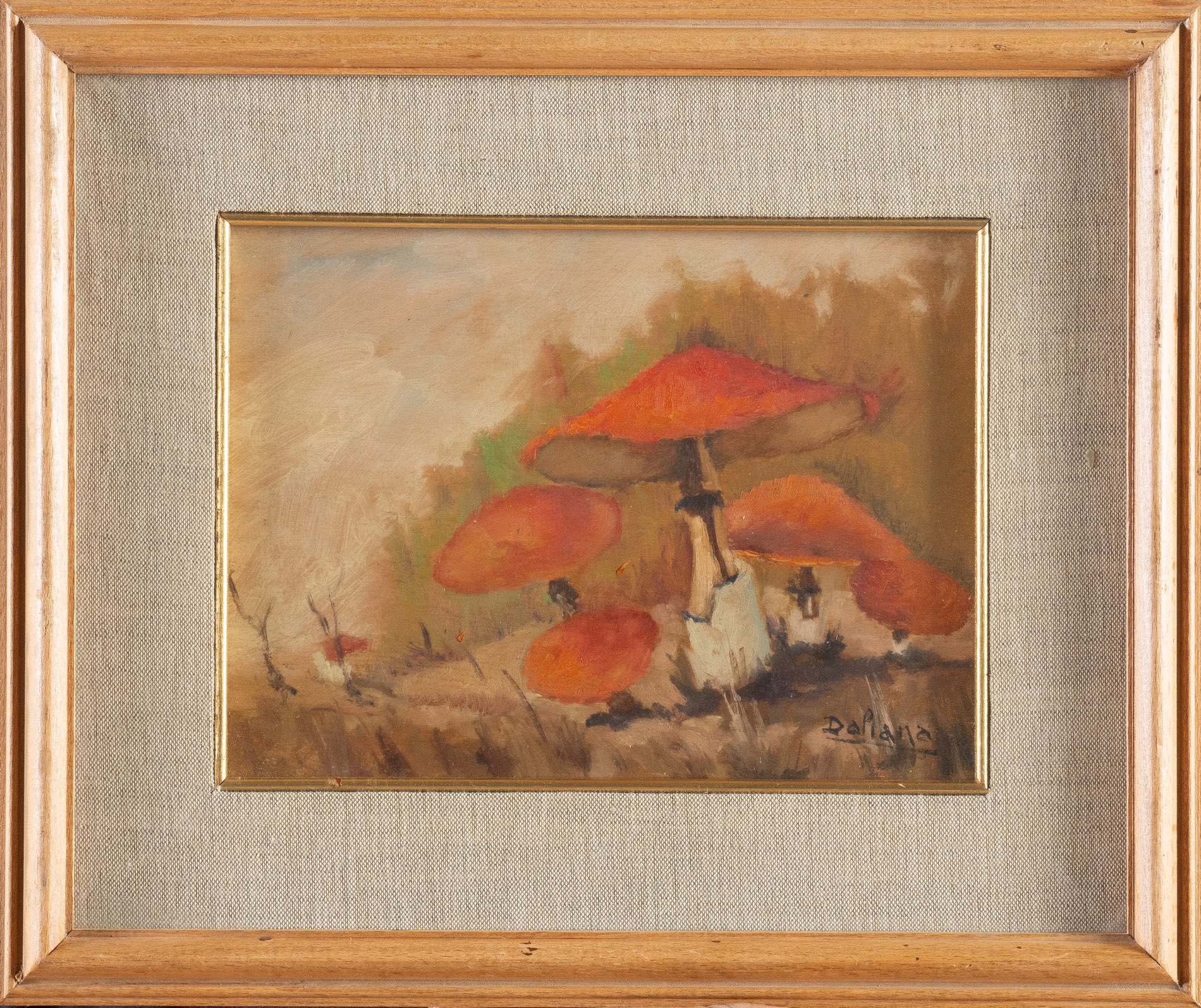 Alberto Daliana (Settignano 1906 - XX secolo), “Funghi”, 1966. Olio su tavoletta, firmato in basso a destra, reca al retro firma, titolo ed etichetta con autore, titolo e data, H cm 18x24