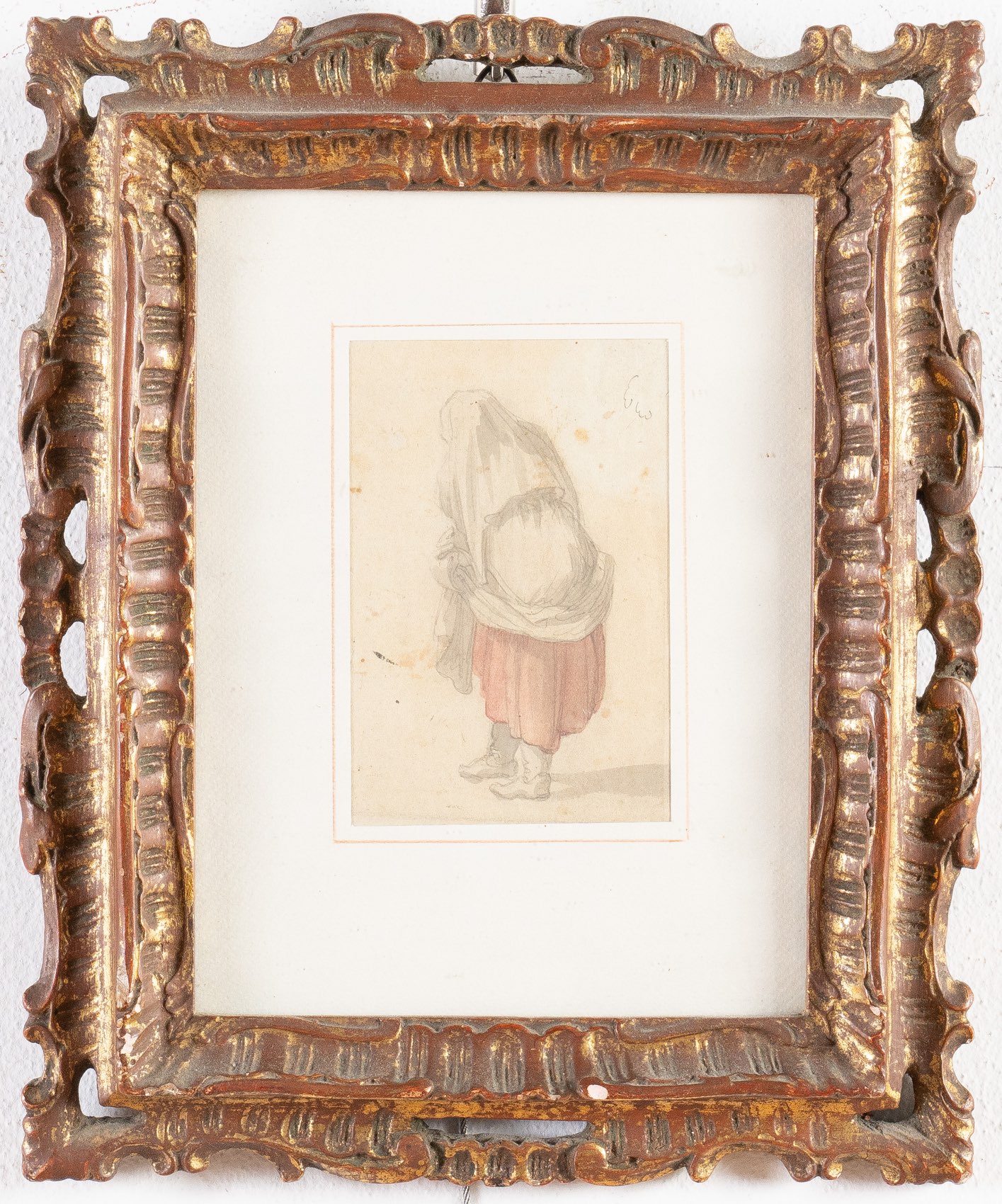 Bartolomeo Pinelli (Roma 1781 - 1835), “Studio di figura”. Tecnica mista su carta, firmato in basso a destra, H cm 15x10 (lievi usure - difetti)