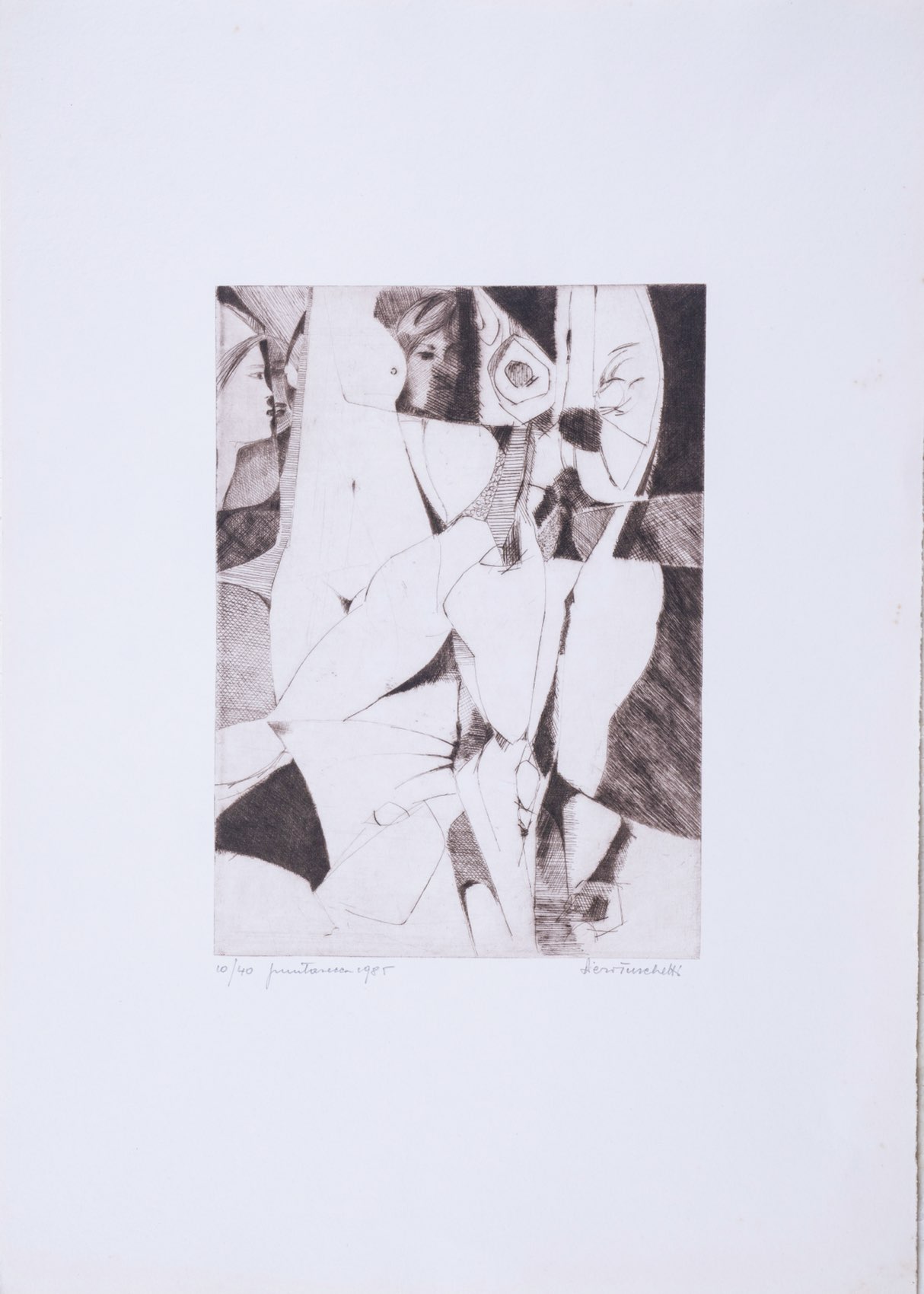 Piero Turchetti (Faenza 1922 - Bologna 2010), “Nudi”, 1985. Puntasecca su carta, firmata in