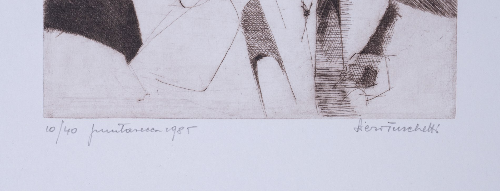 Piero Turchetti (Faenza 1922 - Bologna 2010), “Nudi”, 1985. Puntasecca su carta, firmata in basso a destra reca in basso a sinistra numero di tiratura 10/40, e iscrizione con data “puntasecca 1985”, Foglio H cm 50x35