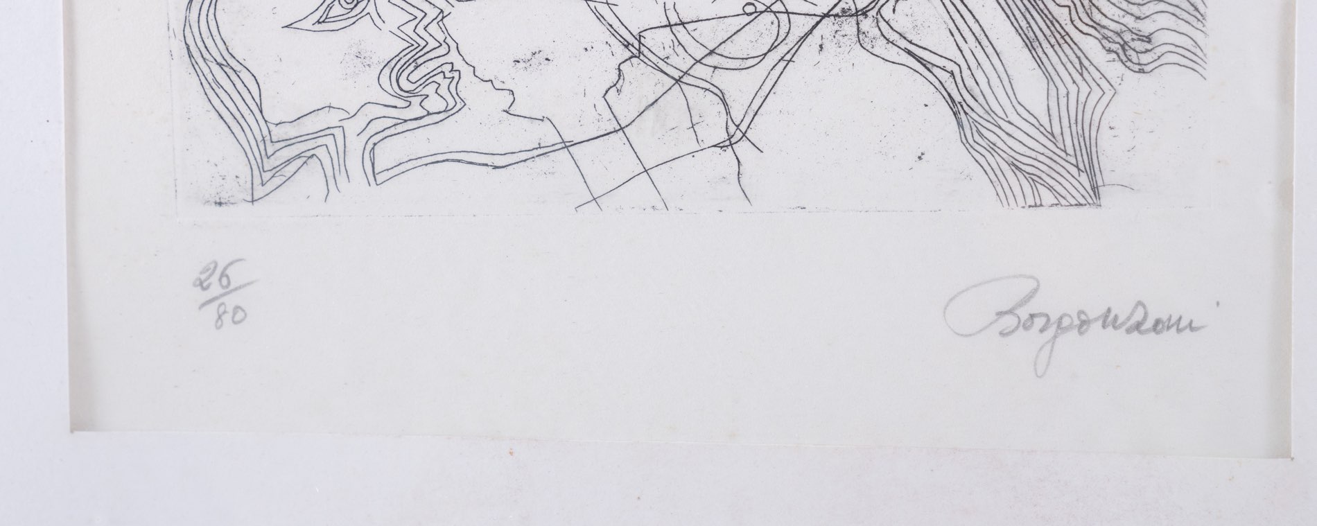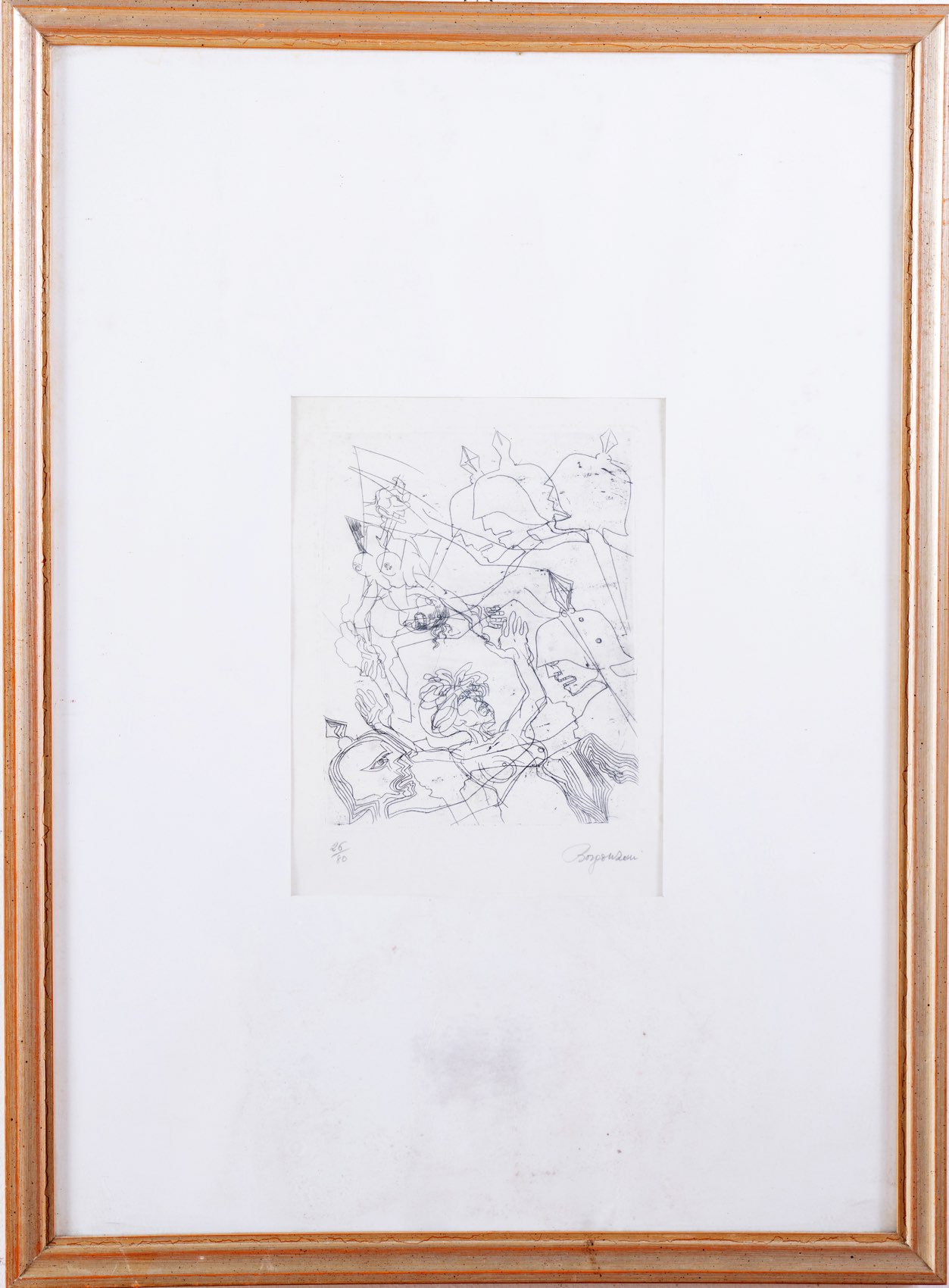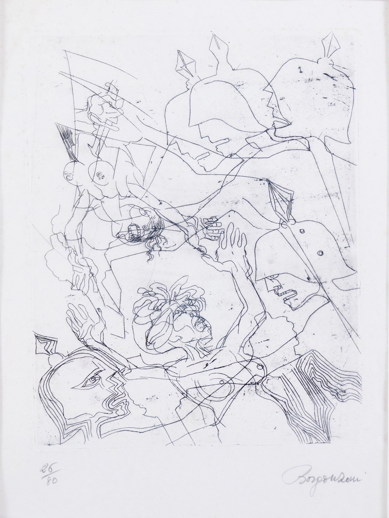 Aldo Borgonzoni (Medicina 1913 - Bologna 2004), “Battaglia”. Litografia su carta, firmata in basso a destra, numero di tiratura in basso a sinistra 26/80, Lastra H cm 30x22