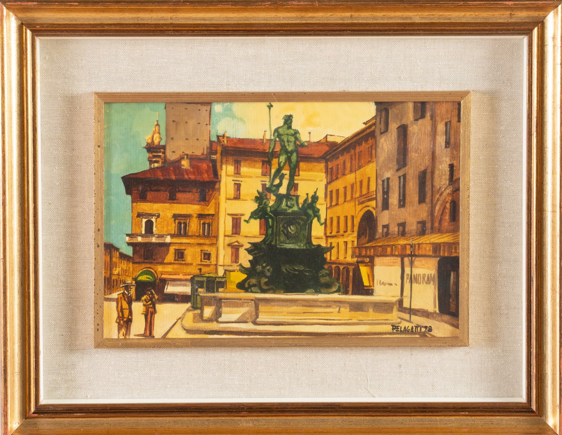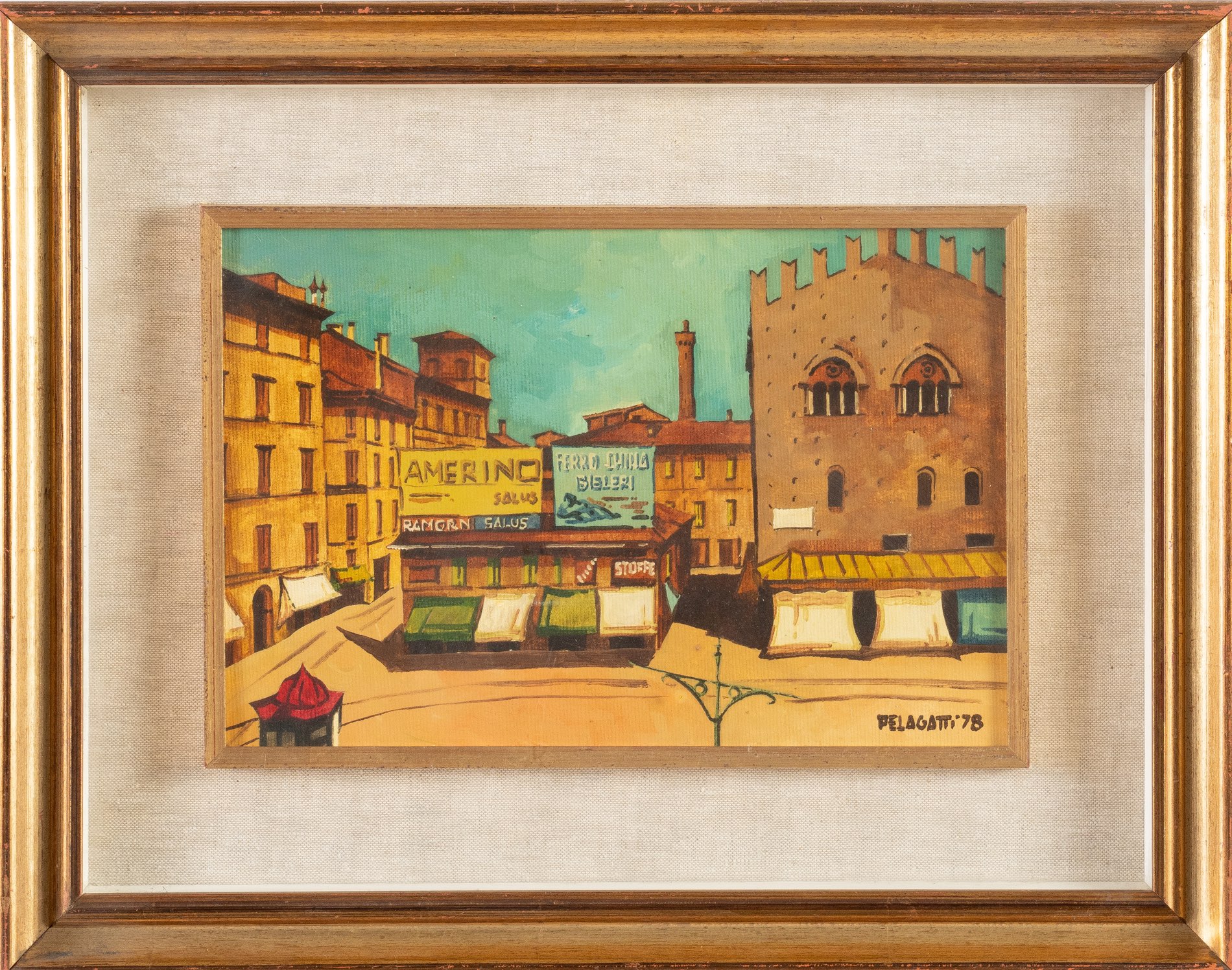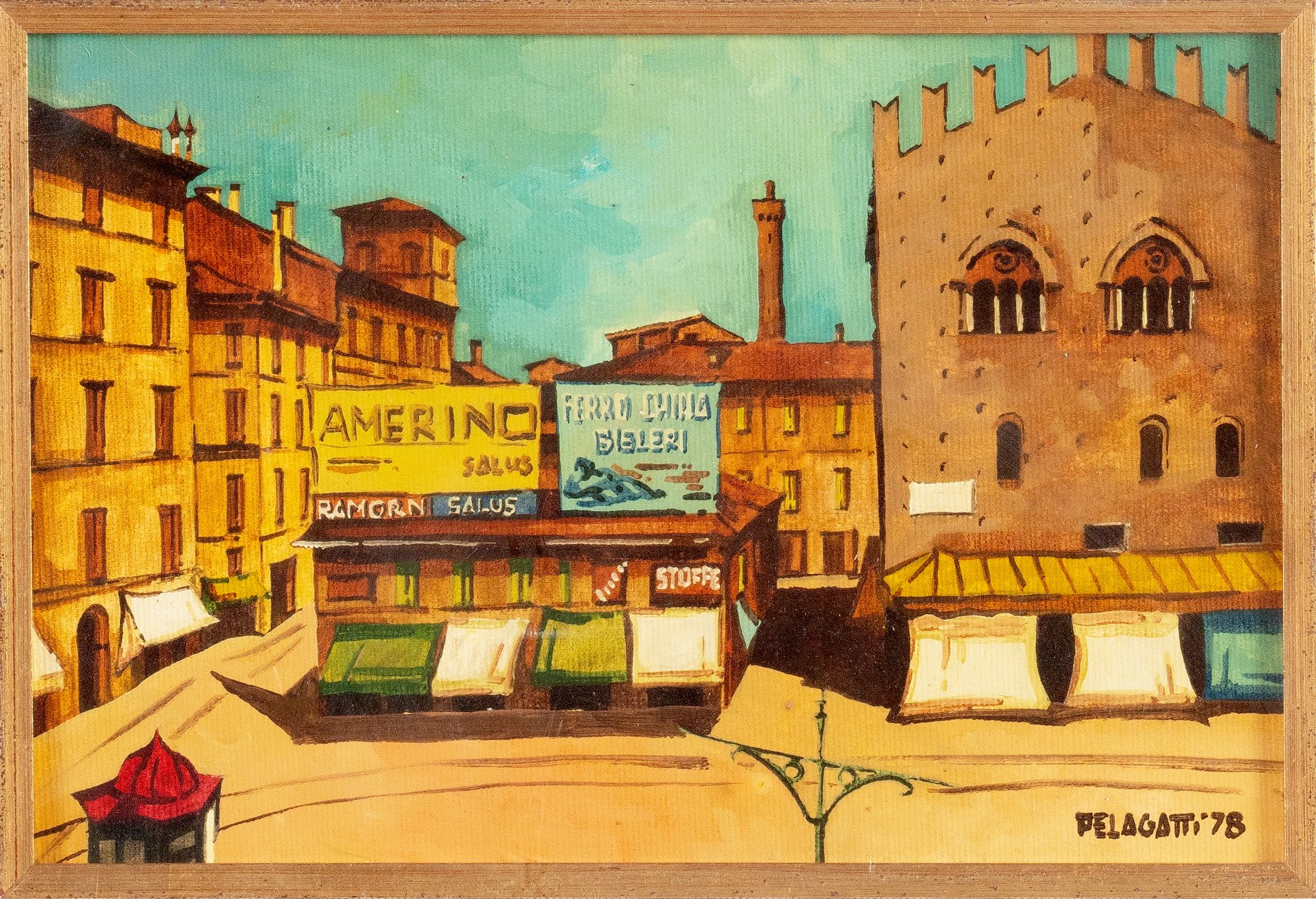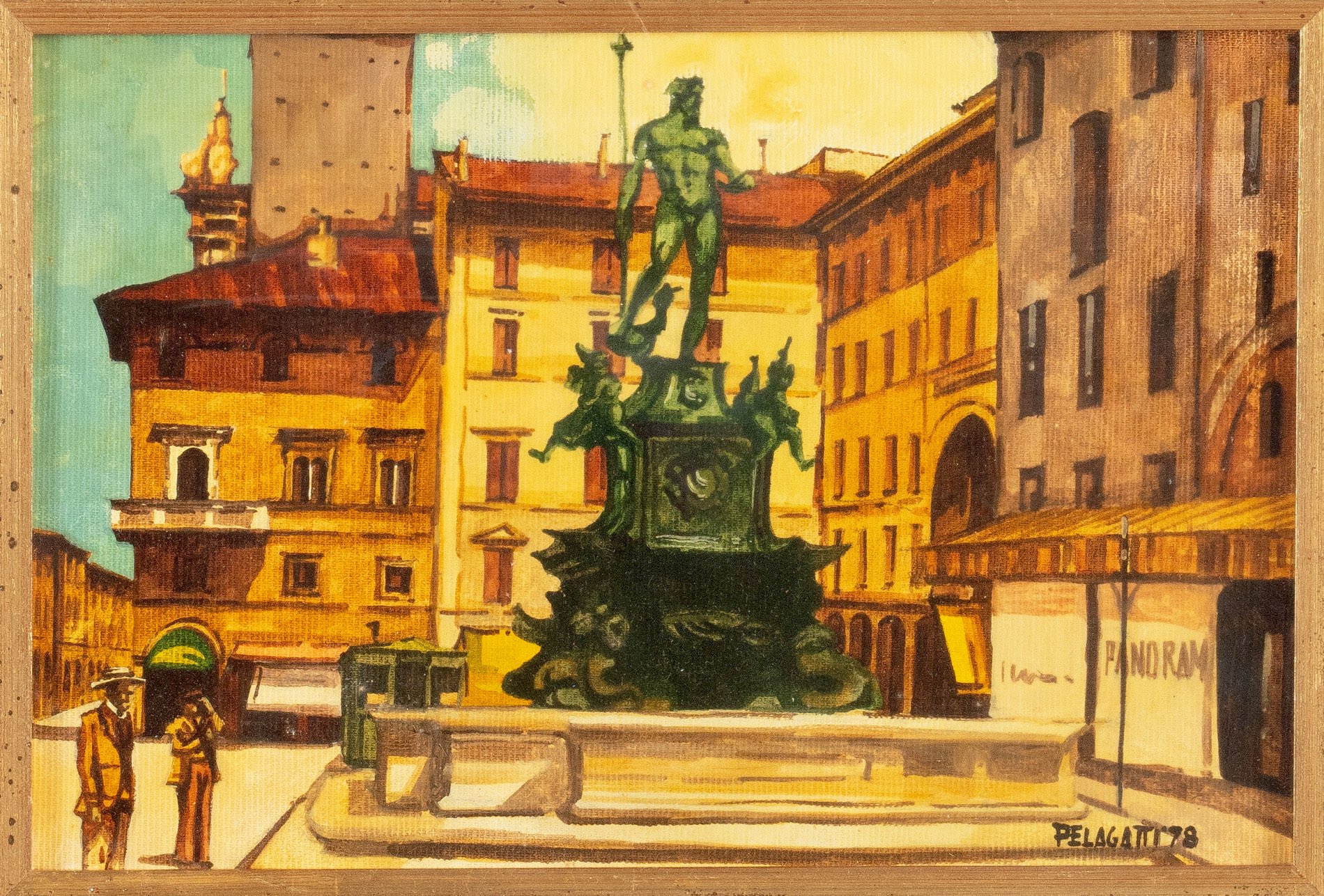 Alberto Pelagatti (San Giorgio di Piano 1927), “Vedute di Bologna”, 1978. Lotto composto da tre dipinti a olio su cartone telato, firmati e datati in basso, recano al retro titoli “Il Palazzo Re Enzo”, “Piazza del Nettuno”, “Porta San Donato”, H cm 20x30