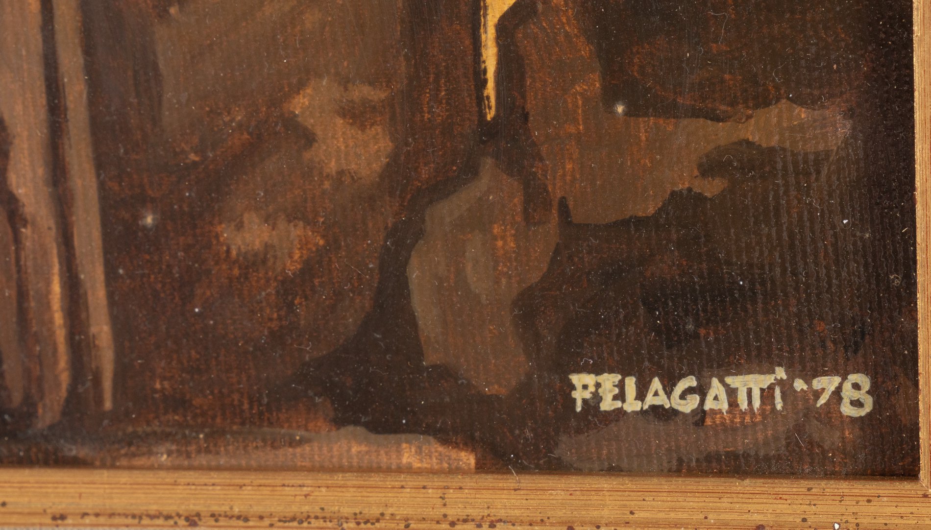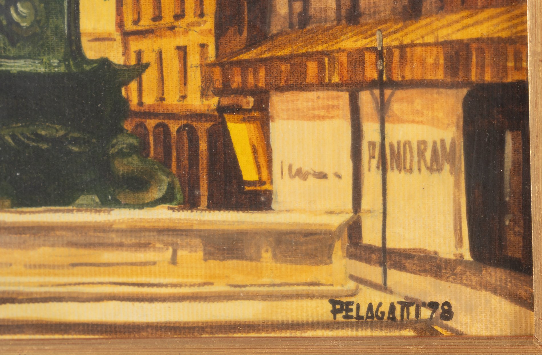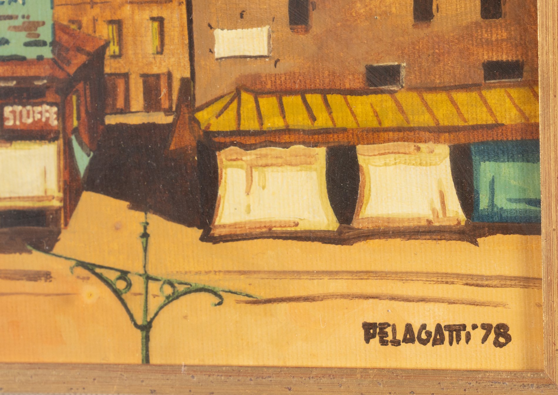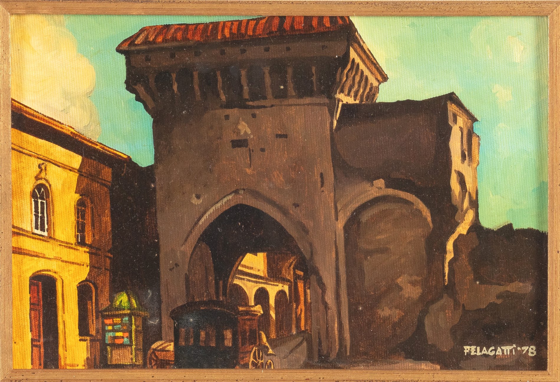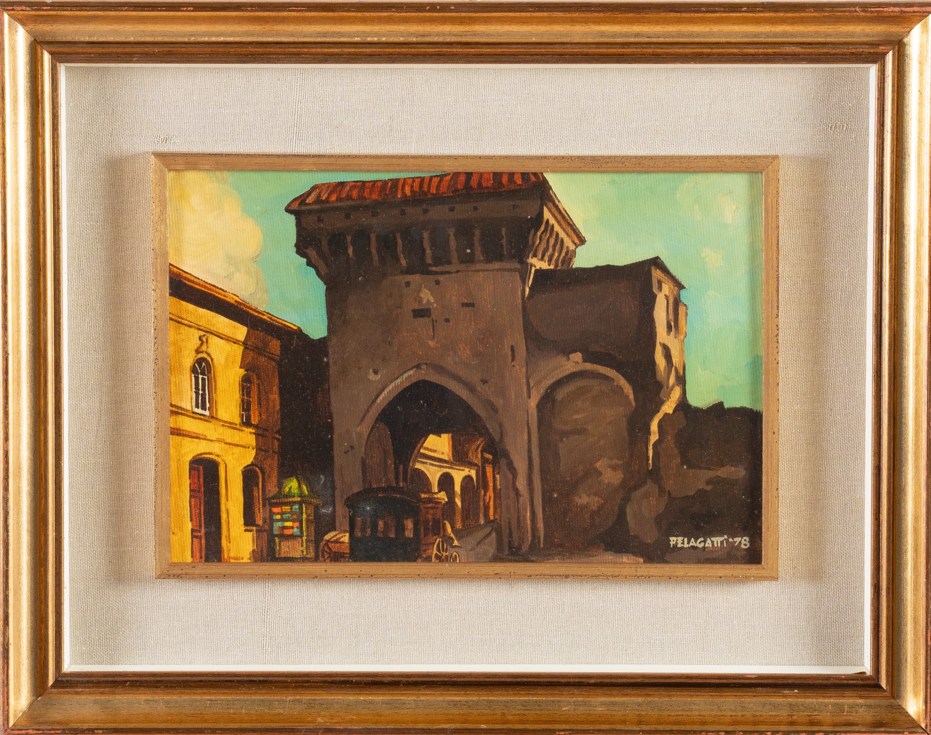 Alberto Pelagatti (San Giorgio di Piano 1927), “Vedute di Bologna”, 1978. Lotto composto da tre dipinti a olio su cartone telato, firmati e datati in basso, recano al retro titoli “Il Palazzo Re Enzo”, “Piazza del Nettuno”, “Porta San Donato”, H cm 20x30
