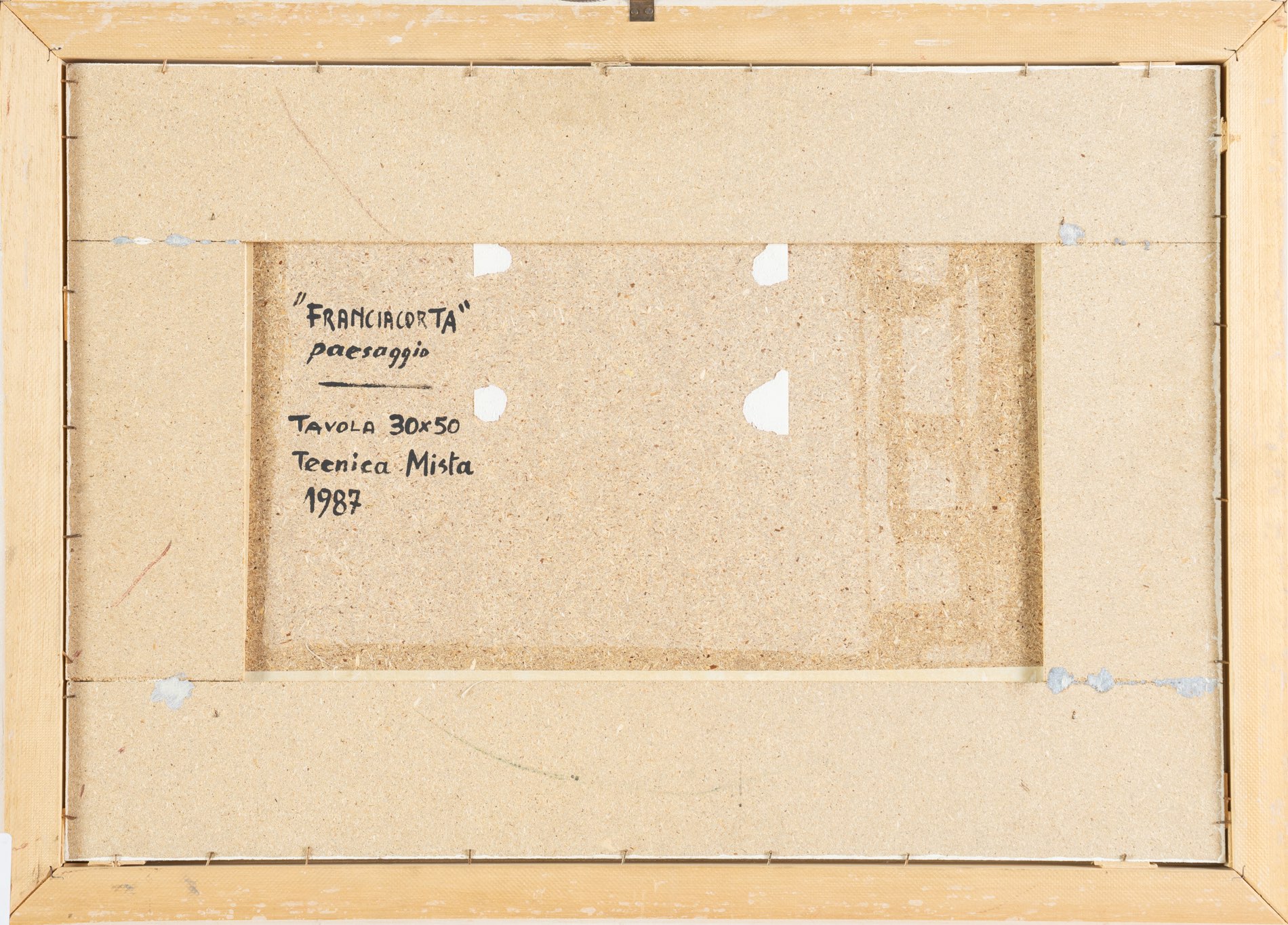 Gianfranco Caffi (Cazzago San Martino 1937), “Franciacorta, Paesaggio”, 1987. Tecnica mista su tavola, firmata in alto a sinistra, reca al retro iscrizione con titolo, supporto, dimensioni, tecnica e data, H cm 30x50
