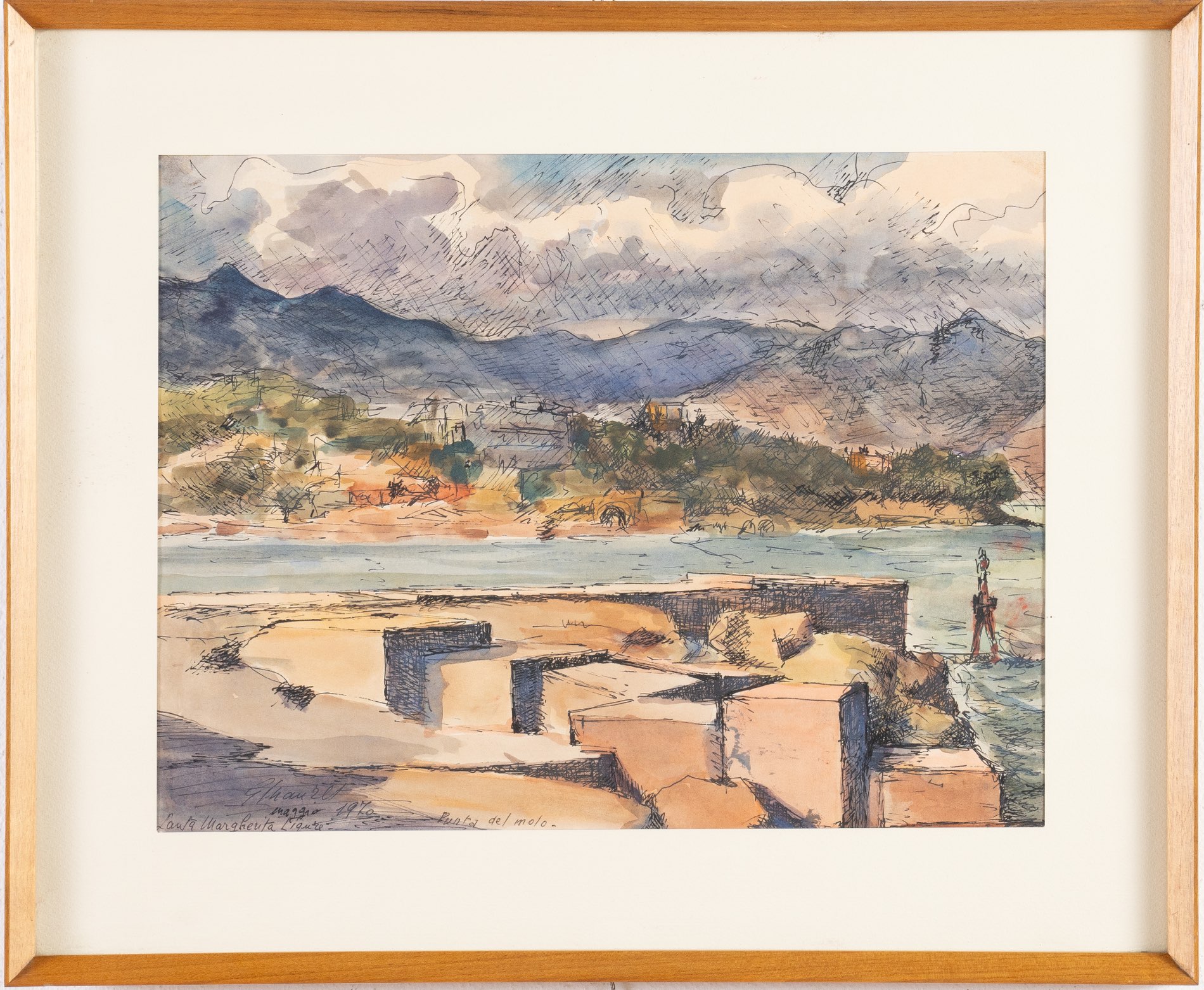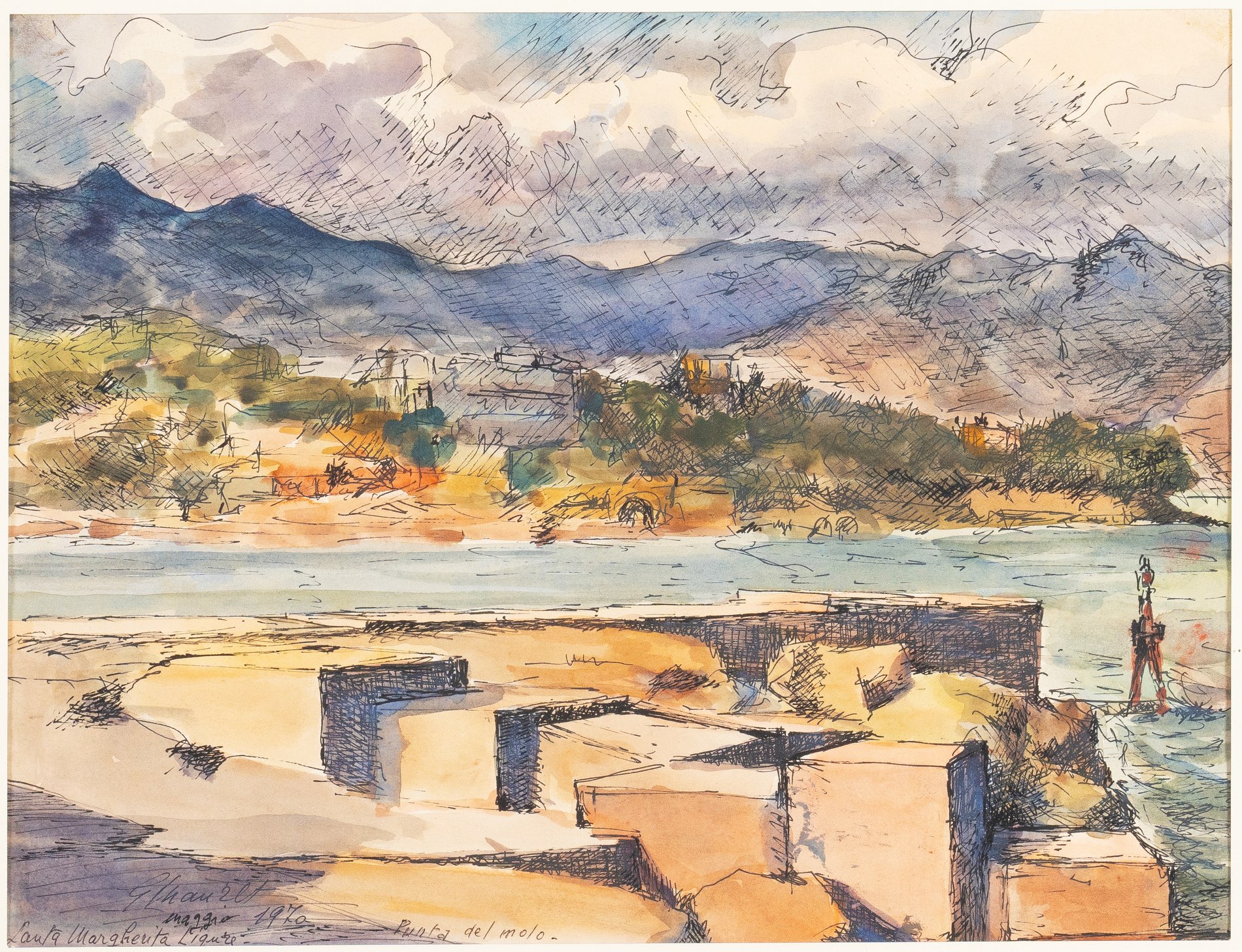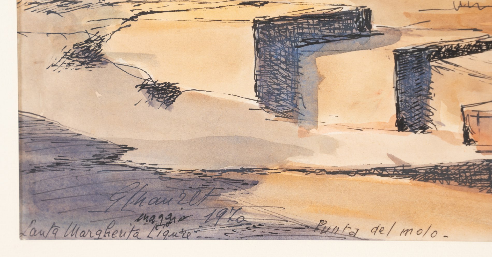 Mauret Grimaldi (XX secolo), “Santa Margherita Ligure - Punta del Molo”, 1976. China e acquerello su carta, presenta firma, data e titolo in basso a sinistra, H cm 30x40