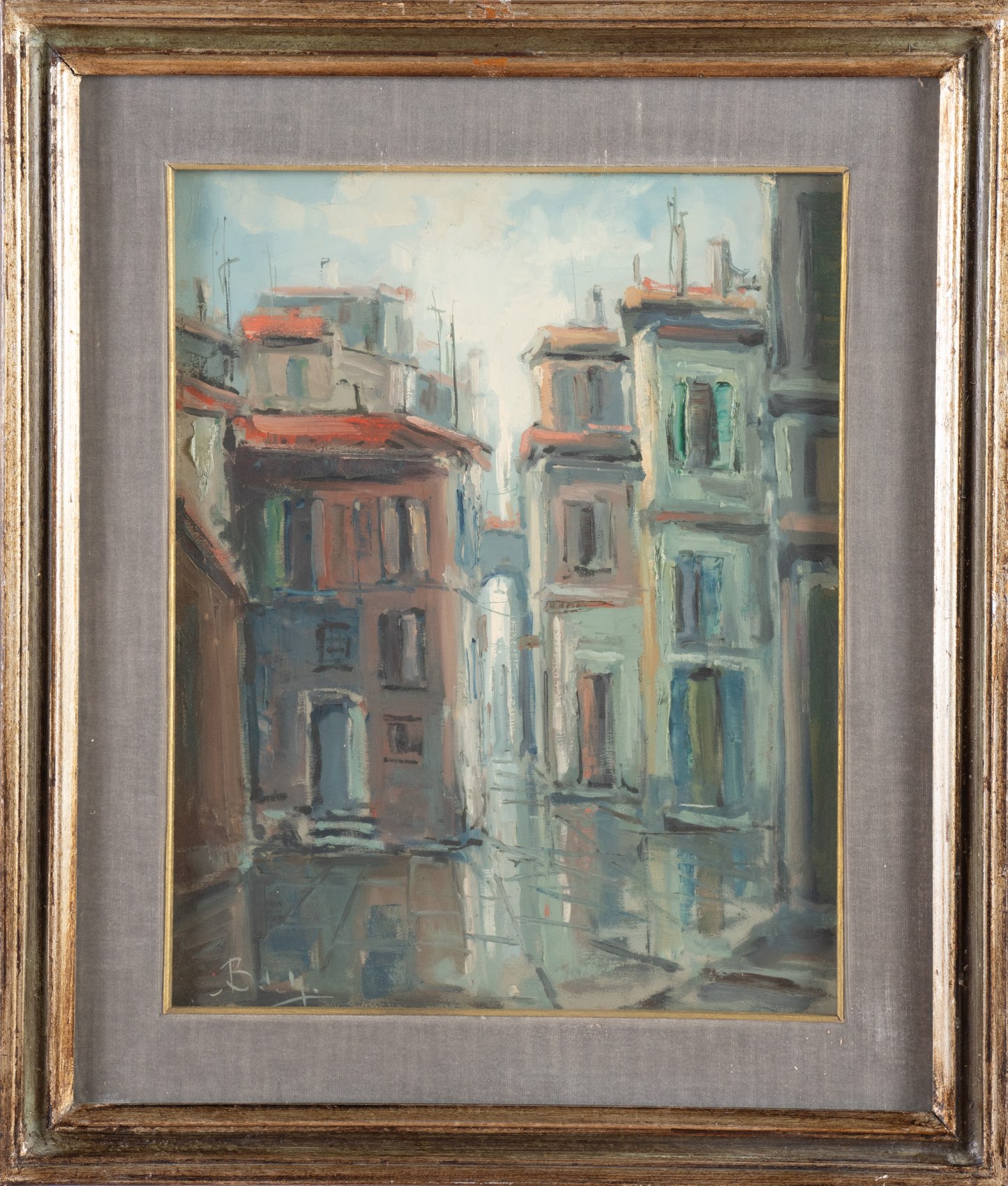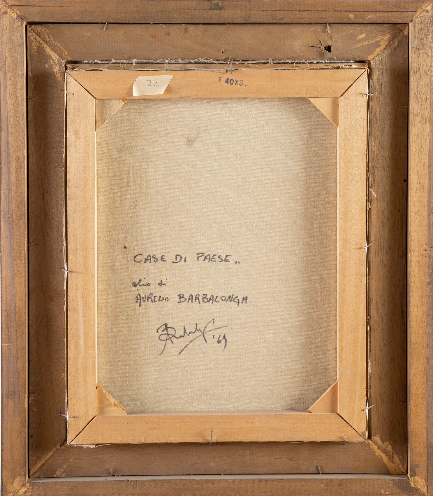 Aurelio Barbalonga (Palermo 1922 - Bologna 2004), “Case di paese”. Olio su tela, firmato in basso a sinistra, reca al retro titolo, tecnica e firma, H cm 50x40