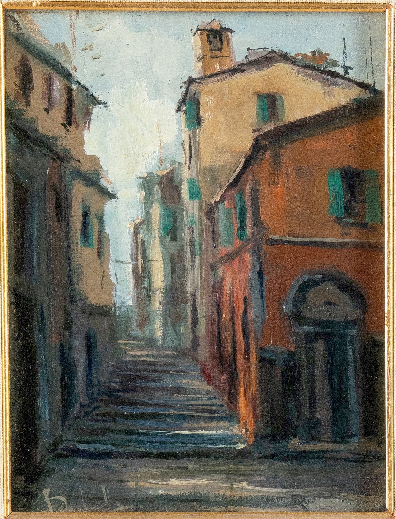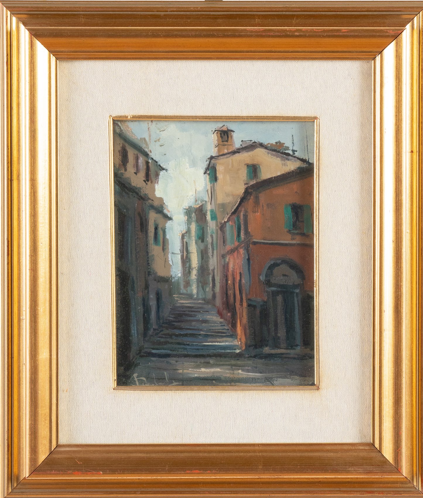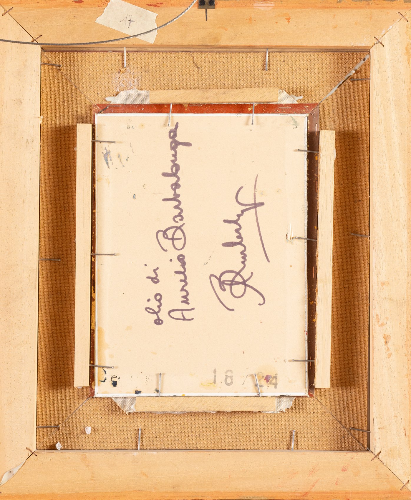 Aurelio Barbalonga (Palermo 1922 - Bologna 2004), “Case”. Olio su cartone telato, firmato in basso a sinistra, reca al retro tecnica e firma, H cm 24x18