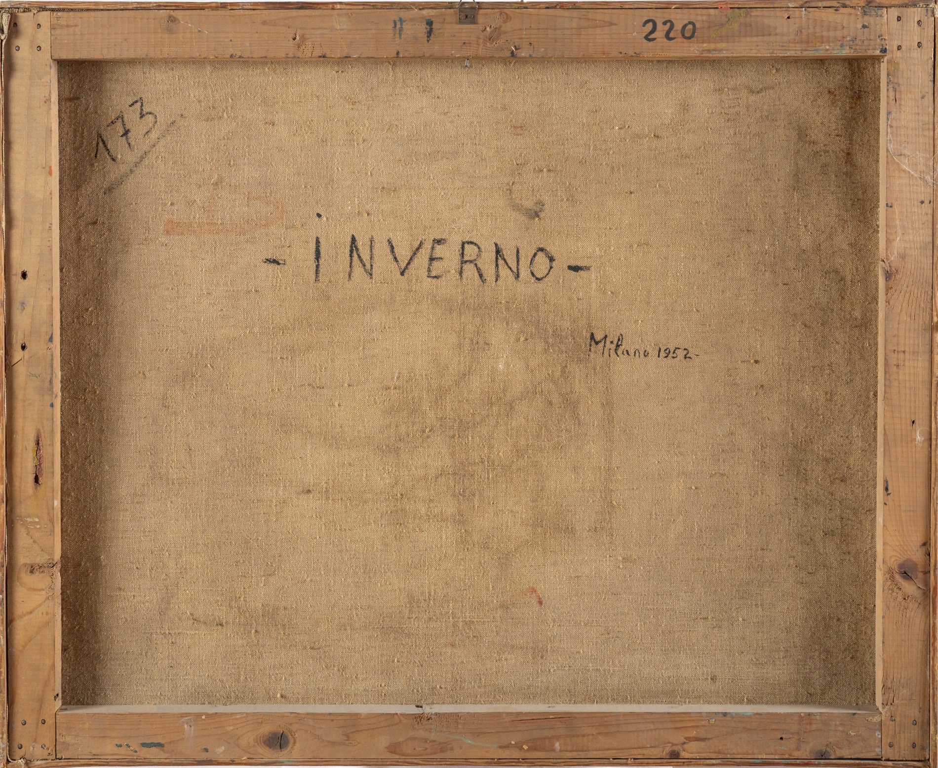 Artista del XX secolo, “Inverno”, 1952. Olio su tela, siglato in basso a destra “E. M.”, reca al retro iscrizione “-Inverno-/Milano 1952” e cifre 173, H cm 62.5x76
