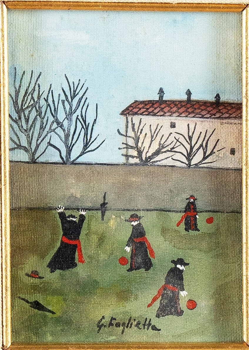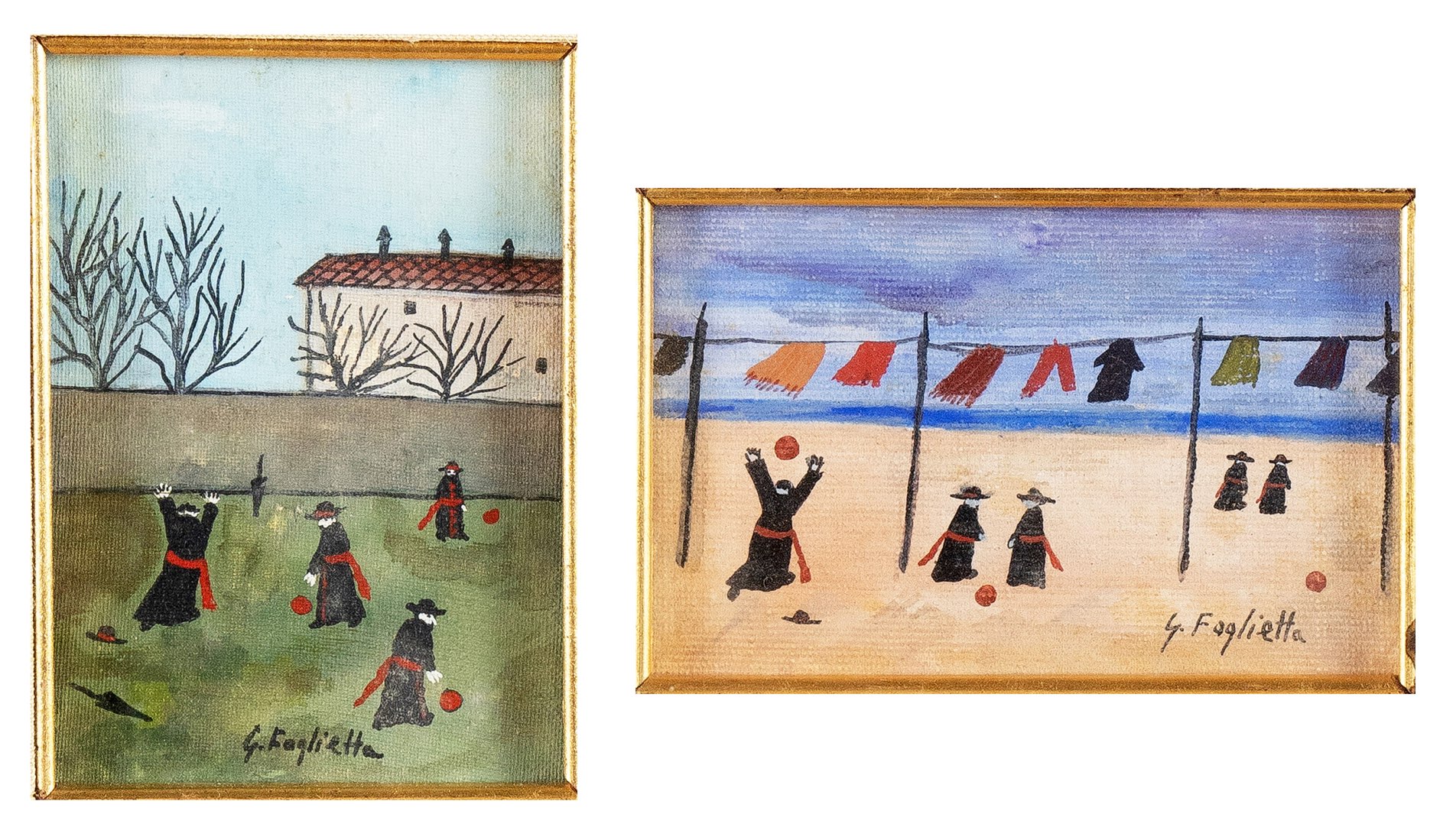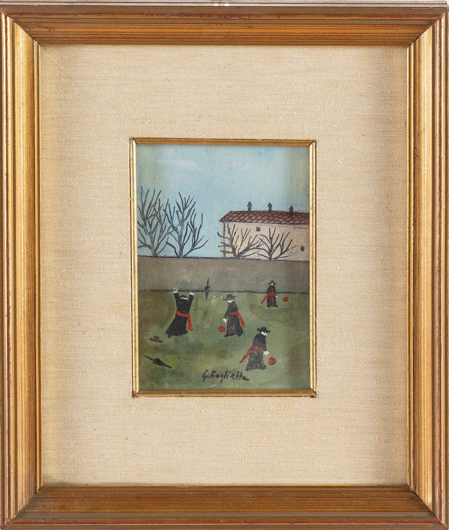 Artista del XX secolo, “Preti”. Lotto composto da due dipinti a olio su cartone telato, firmati in basso “G. Foglietta”, H cm 10x15 - H cm 15x10