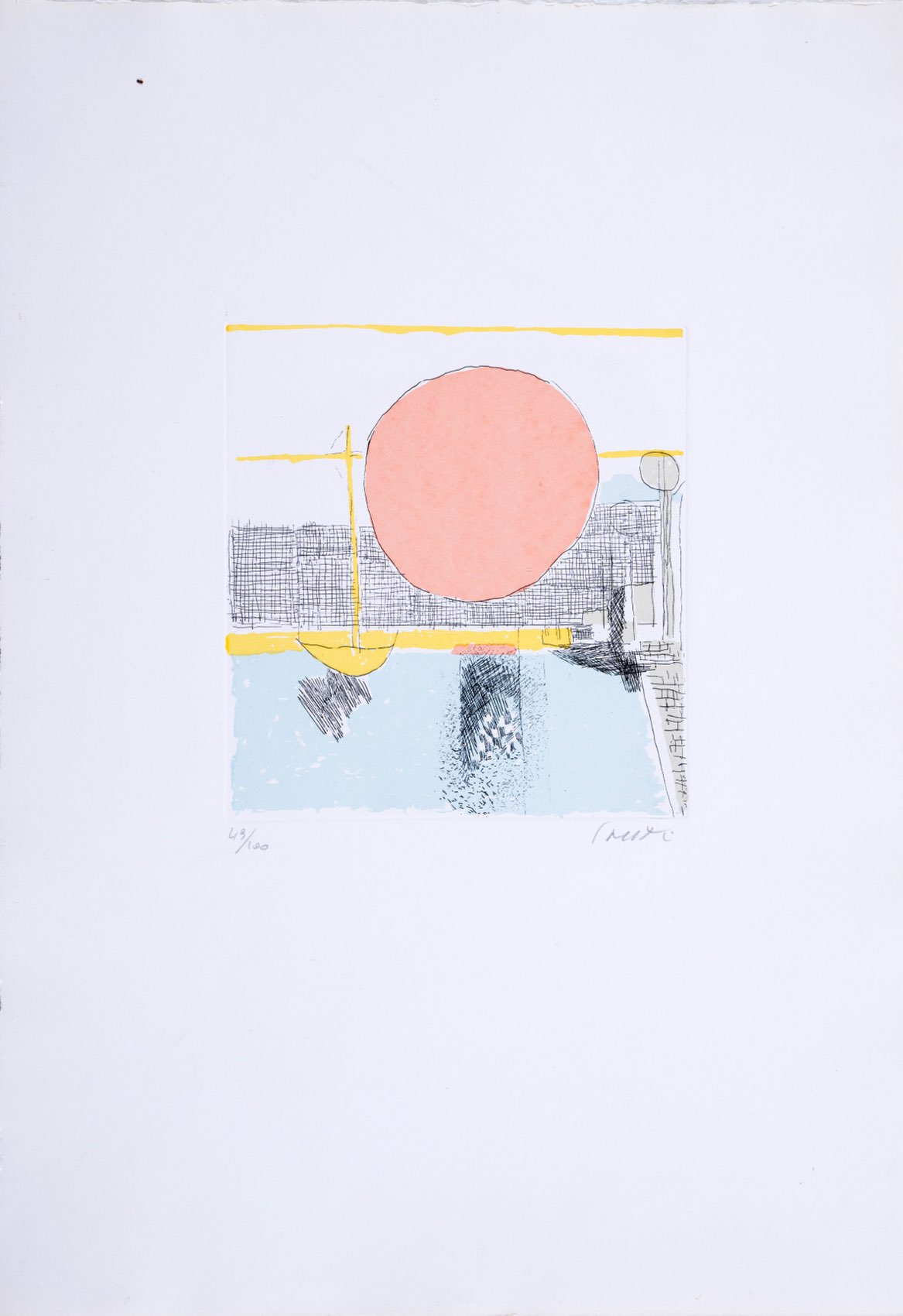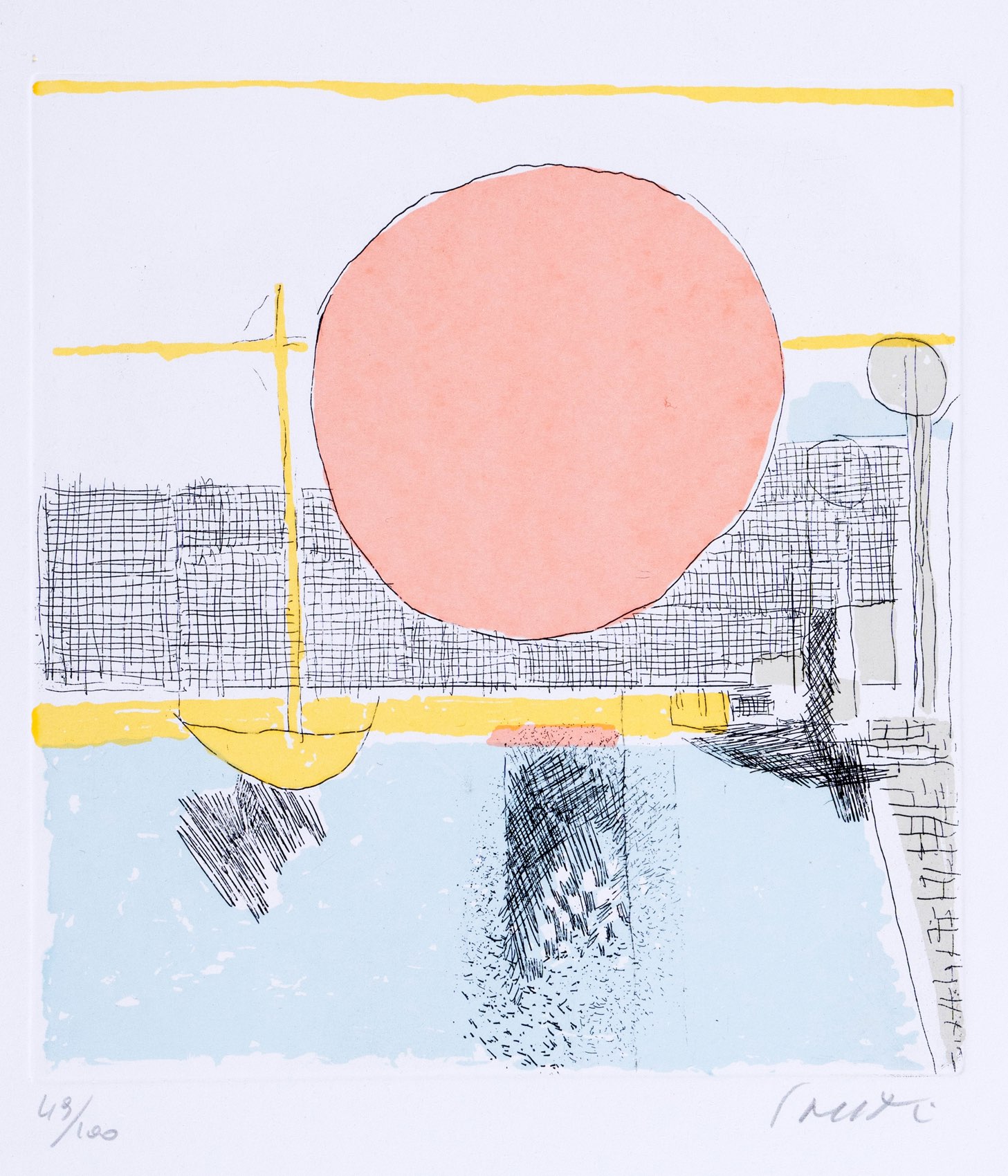 Bruno Saetti (Bologna 1902 - 1984), “Sole”. Litografia a colori su carta, firmata in basso a destra, numero di tiratura in basso a sinistra 49/100, Lastra H cm 19x17.5 - Foglio H cm 50x35
