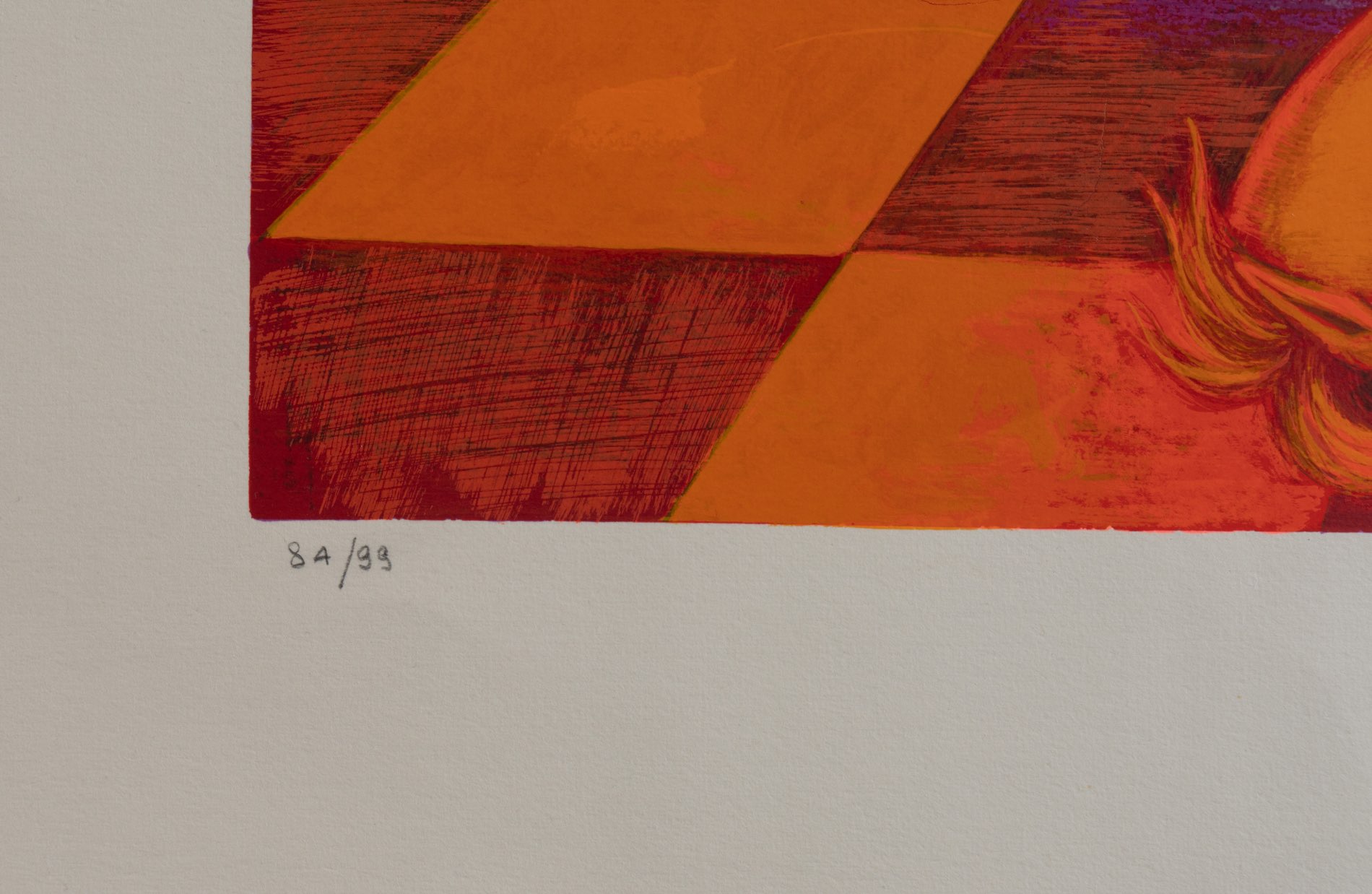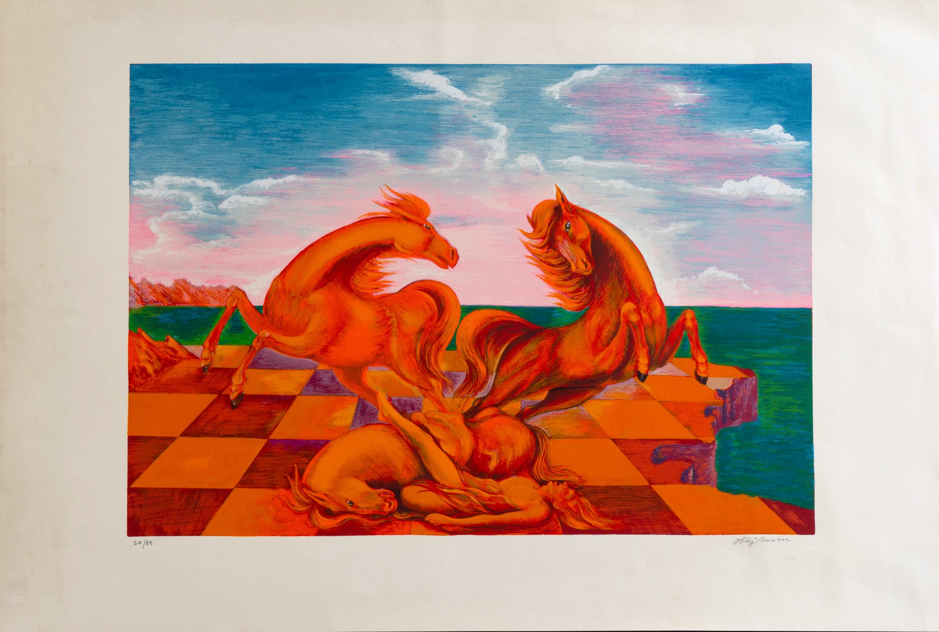 Aligi Sassu (Milano 1912 - Pollença 2000), “Senza titolo”. Litografia a colori su carta, firmata in basso a destra, numero di tiratura in basso a sinistra 84/99, presenta timbro a secco, H cm 50x71