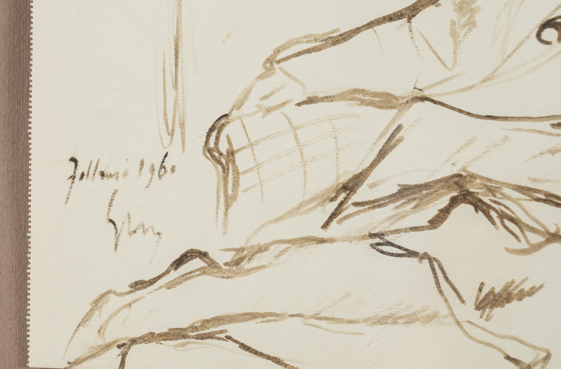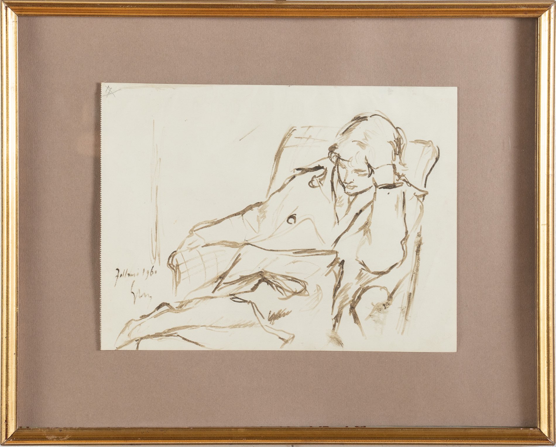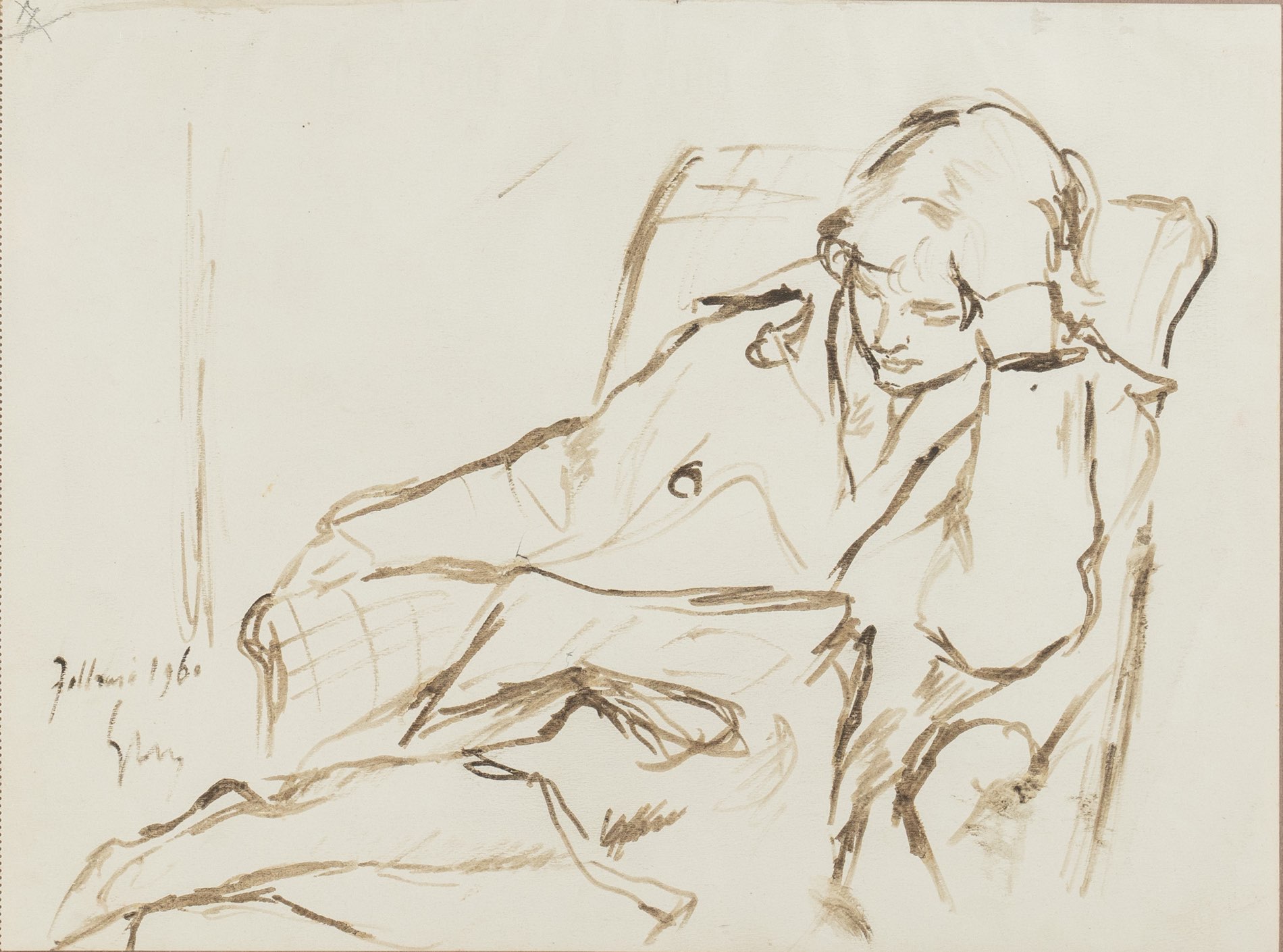 Gino Marzocchi (Molinella 1895 - Bologna 1891), “Donna che legge in poltrona”, 1960. China acquerellata su carta, presenta in basso a sinistra data, sigla “GM” e altra iscrizione, H cm 23x34